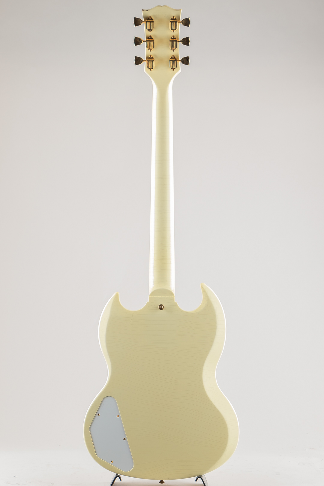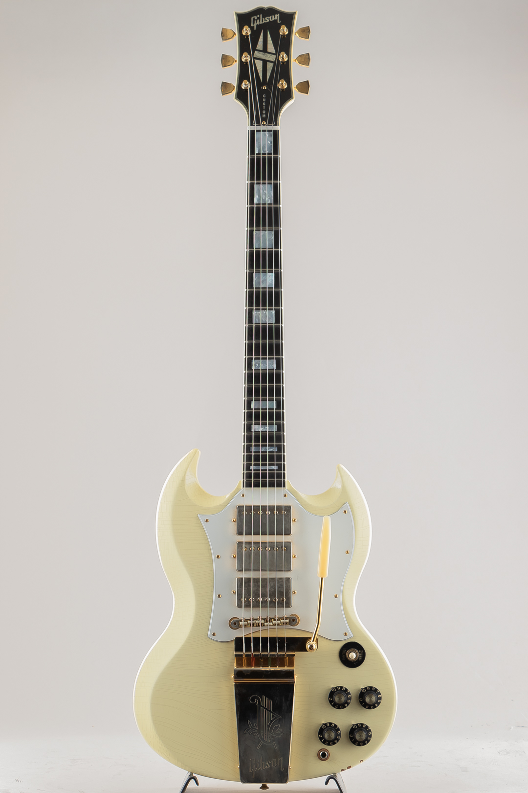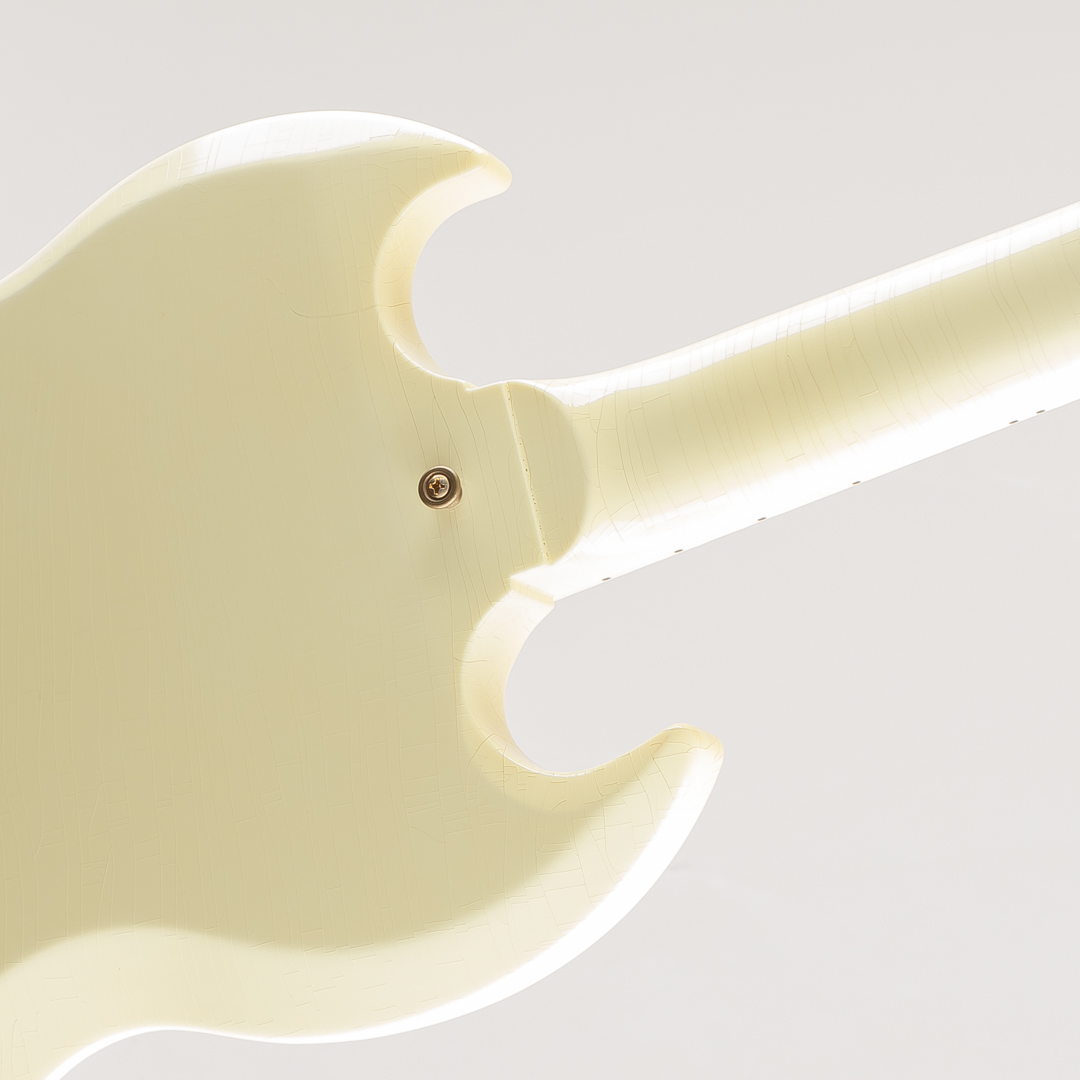 ウッドマテリアルは、マホガニーボディ / マホガニーネック / エボニー指板にて構成。フィニッシュにはやや日焼けしたような色合いが特徴的なポラリス・ホワイトカラーに、Murphy Labのエイジド加工によるウェザーチェッキングや金属パーツへのくすみ等が施されております。その他のパーツ類は、クルーソンワッフルバックペグ / ABR-1ブリッジ / マエストロ・ヴァイヴローラ / ラージピックガードとなり、"Custom"らしいスプリットだイヤモンドインレイ / ブロックインレイ等も勿論採用されております。