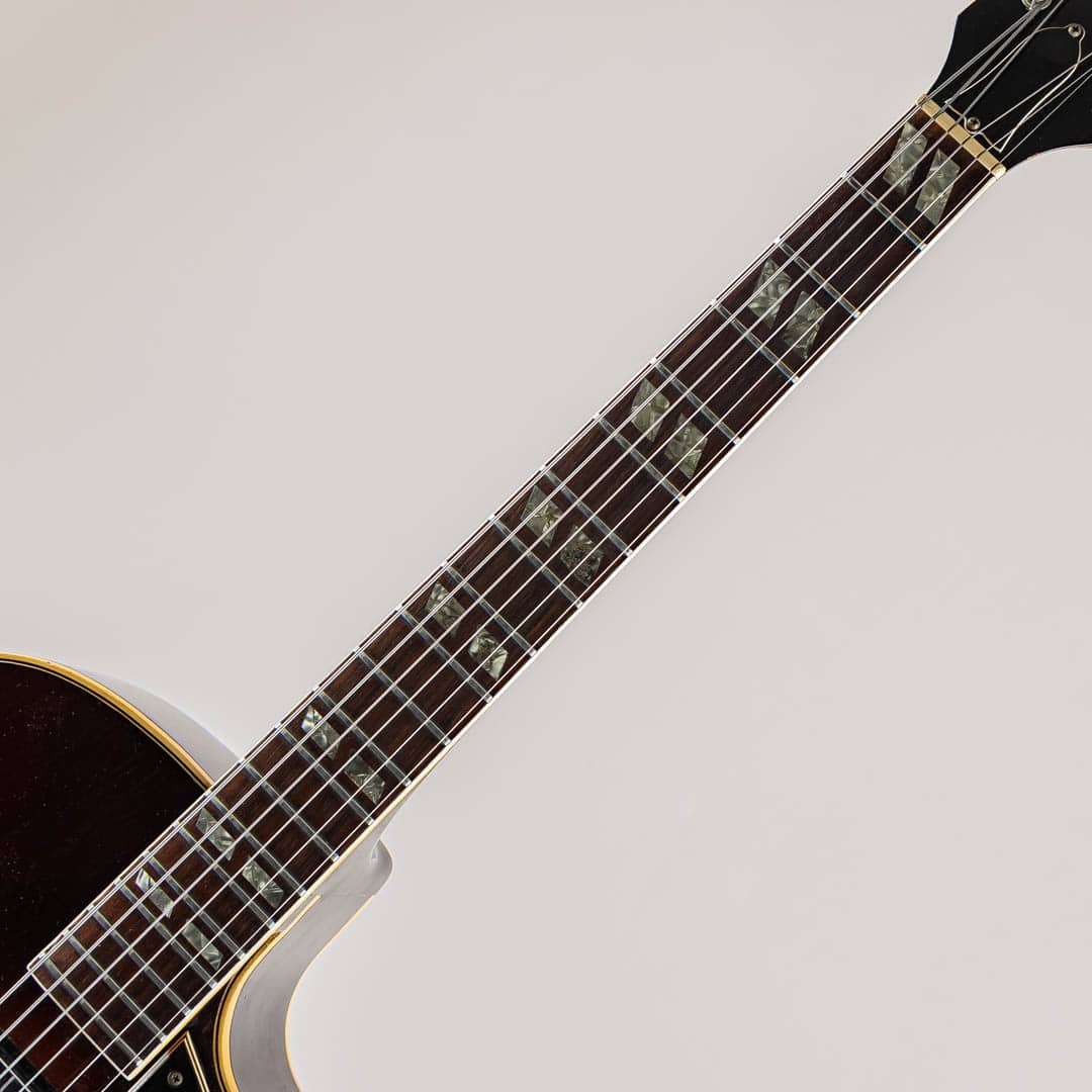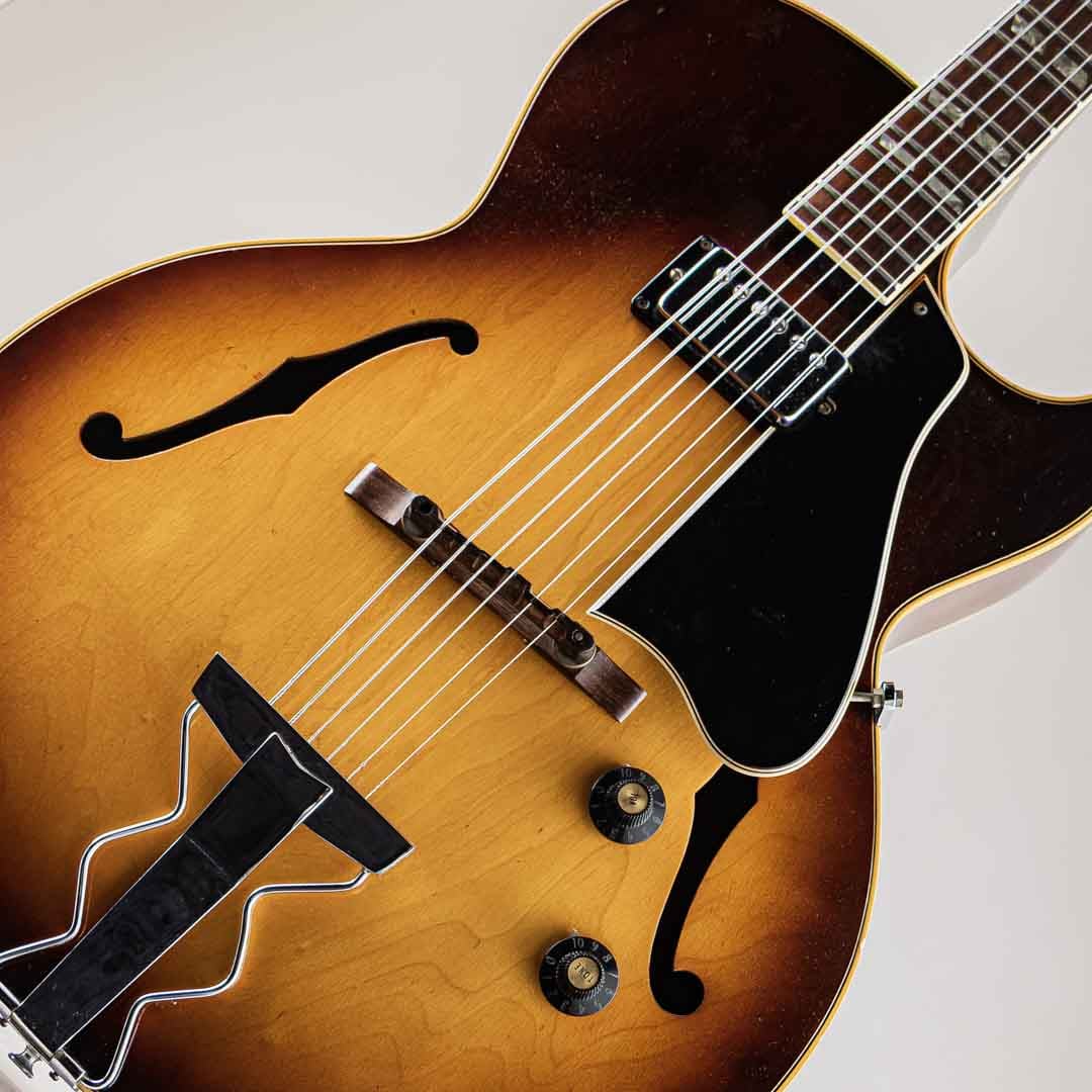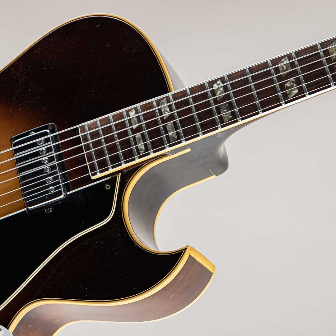 この度入荷致しました本機は'68-'69年製造のES-175。ナローネック期、ワンピックアップからなる程よい枯れ感と甘いトーンをお楽しみただける1本でございます。ウッドマテリアルは、ラミネイトメイプルボディ / ワンピース・マホガニーネック / ローズウッド指板にて構成。ナット幅は約40mmほどとなりでございます。その他、ジグザグ・テイルピース / ソンブレロノブが搭載されております。ピックアップはオリジナルP,A,Fとなり、ピッキングに対する反応速度に秀でた音色で、繊細かつ艶のある上質なトーンをお楽しみ頂けます。