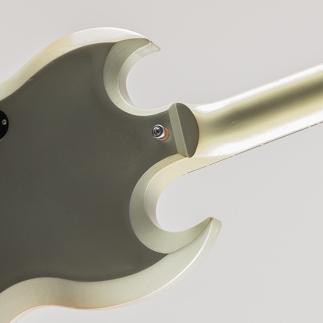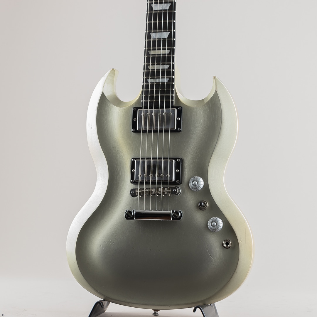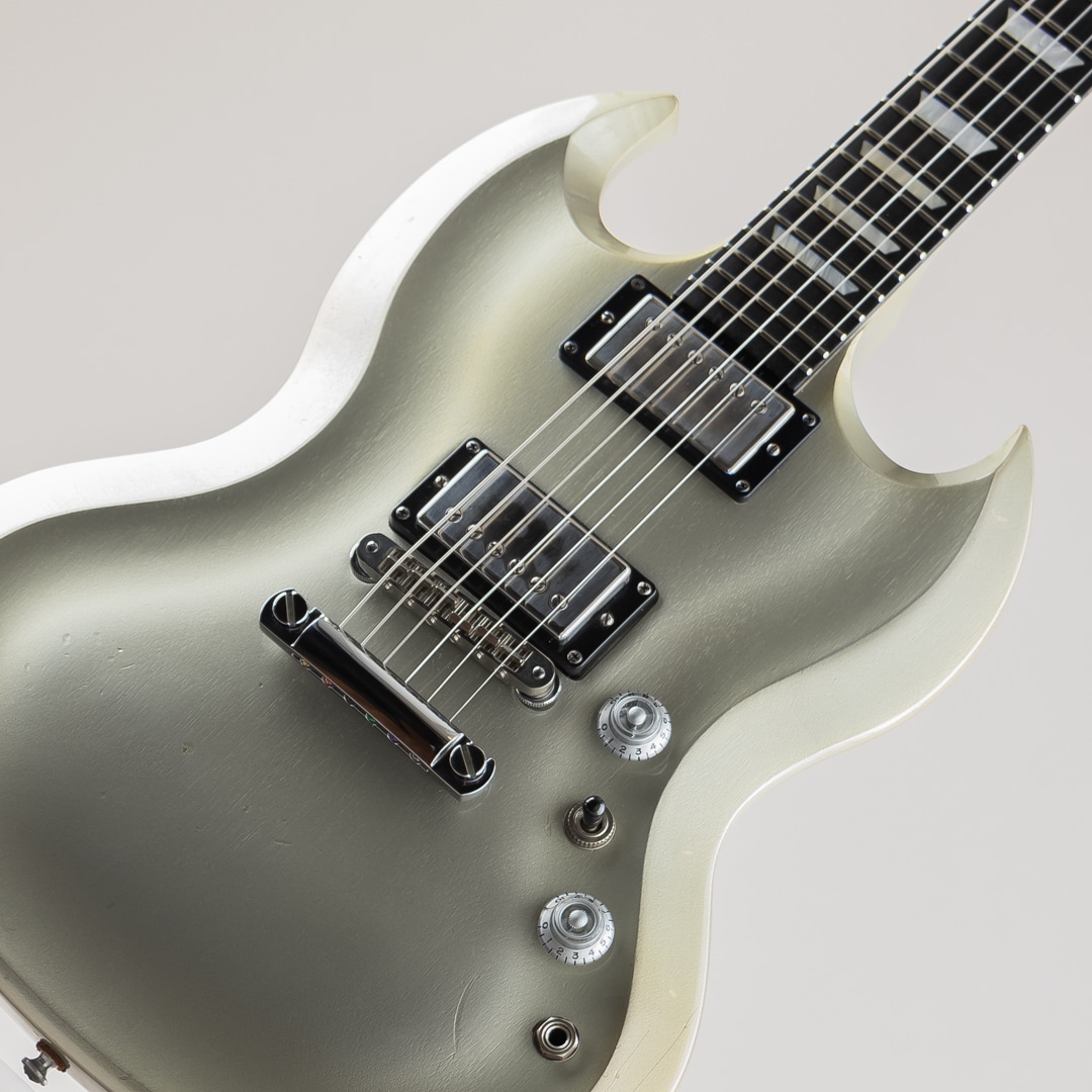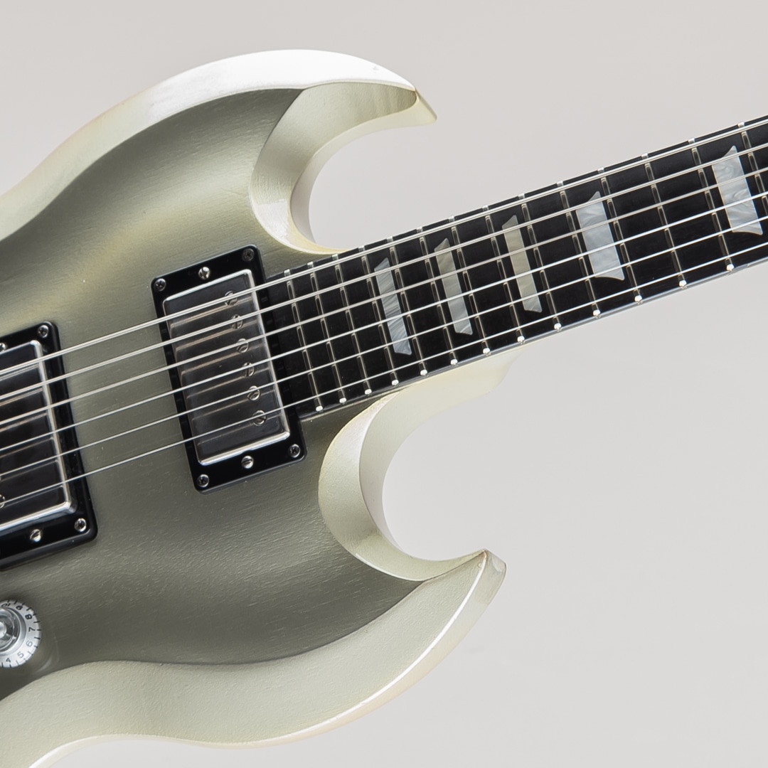 この度入荷致しました、本機はそのシリーズの中で発売されたSG Diablo Metallic Silverになります。一味変わったスペックでリリースされた本モデル。ボディにはトップとバック共にアーチ加工が施されており、見た目の特別感はもちろんのこと、抱えた際の体へのフィット感が高くプレイアビリティの向上にも一役買っております。その他、操作性の高い1Vol,1Toneのコントロール、木目が見えるように仕上げられたメタリックシルバーの塗装、クロームメッキの鏡面加工が施されたトラスロッドカバー等、限定生産を感じさせる仕上がりとなっております。