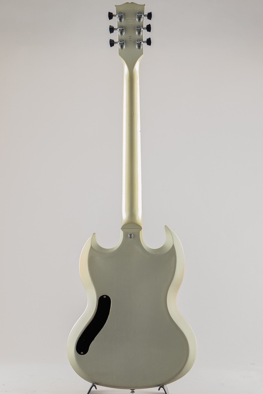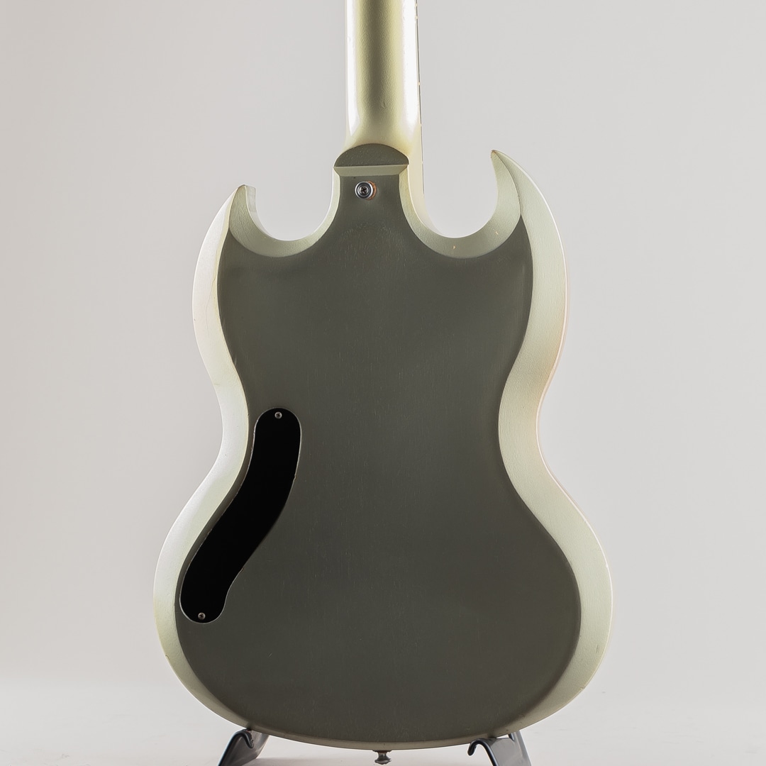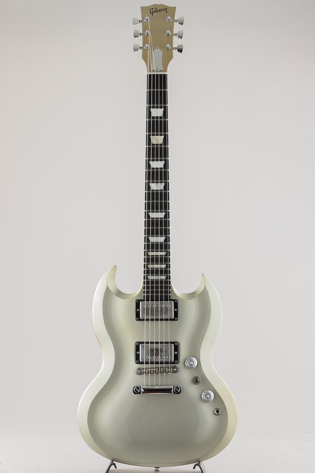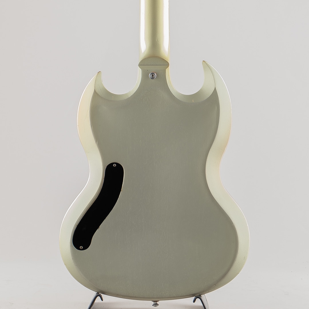 この度入荷致しました、本機はそのシリーズの中で発売されたSG Diablo Metallic Silverになります。一味変わったスペックでリリースされた本モデル。ボディにはトップとバック共にアーチ加工が施されており、見た目の特別感はもちろんのこと、抱えた際の体へのフィット感が高くプレイアビリティの向上にも一役買っております。その他、操作性の高い1Vol,1Toneのコントロール、木目が見えるように仕上げられたメタリックシルバーの塗装、クロームメッキの鏡面加工が施されたトラスロッドカバー等、限定生産を感じさせる仕上がりとなっております。