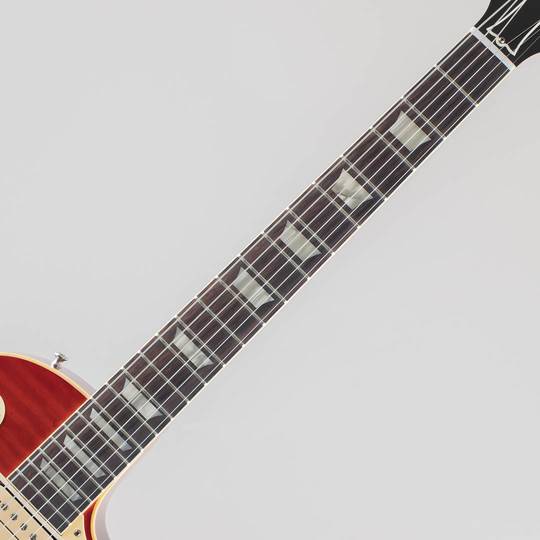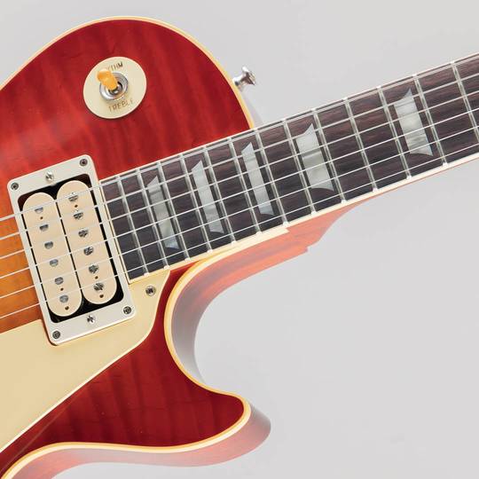 基本的なスペックはカタログモデルのR9に準じておりますが、本機の特別仕様としてはVOSやGlossフィニッシュとは違う、マットな質感が特徴的なVintage Glossフィニッシュ/クリームボビンのカスタムバッカー/R Topグレードのフィギュアドメイプルを採用しております。本機のトップに採用されたメイプルは、ワイルドな広がりのあるフレイム、所々に散りばめられたフレック等、しばらく眺めていたくなる程の美しさ。見る角度や光の当て方を変えることで感じられる躍動感は見応えのあるクオリティでございます。カラーに採用されたウォッシュドチェリーもレスポールの美しさをより引き立てております。