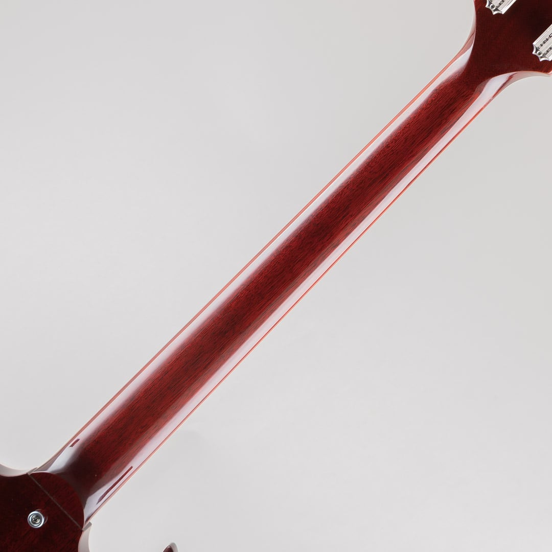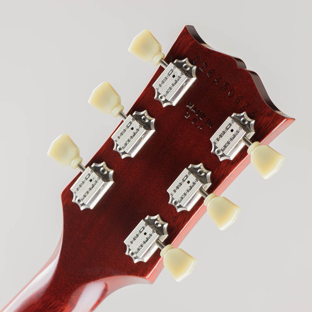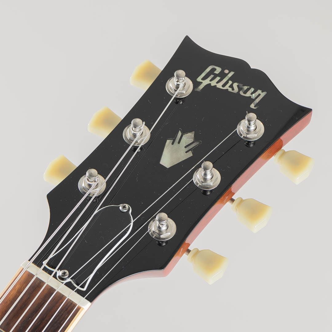 本機のウッドマテリアルはマホガニーボディ/マホガニーネック/ローズウッド指板にて構成。現行モデルとは違い、左右のウイングが広がったラージヘッドを採用している点、61Reissueといいつつも70年頃の意匠を組み込むあたりGibsonらしいお茶目さを感じさせます。ネックシェイプにはSlim Taperを採用。ナット幅は約43mmほどとなり、やや幅広さを感じさせる握り心地でございますが、一度慣れるとダブル・カッタウェイが相まってあらゆるプレイスタイルに対応できるスペックでございます。ピックアップには57 Classicを2機搭載。太く伸びやかでありながら適度なボトムを感じさせる独特の鳴り。メロウなアルペジオプレイからガツッとしたリフプレイまで幅広くお楽しみ頂けるサウンドクオリティでございます。