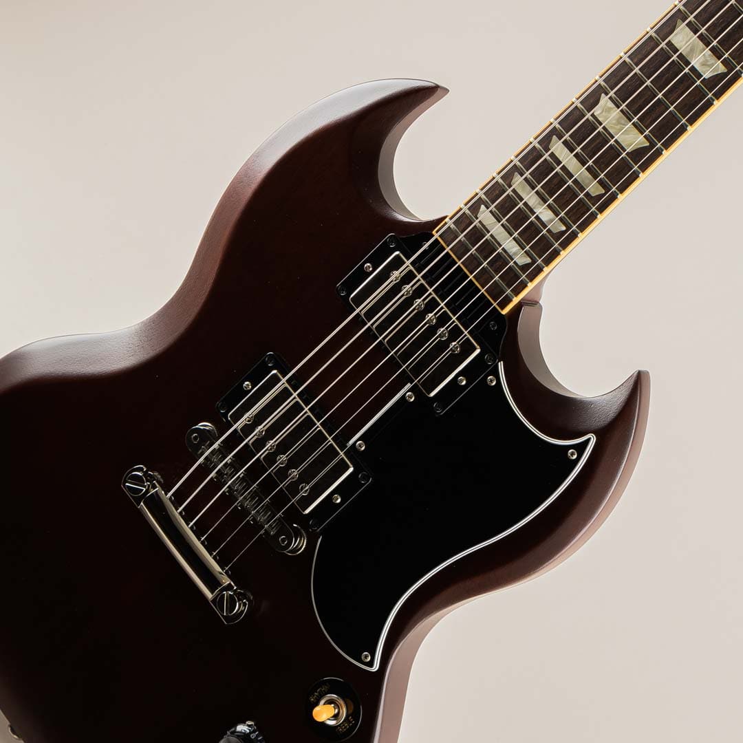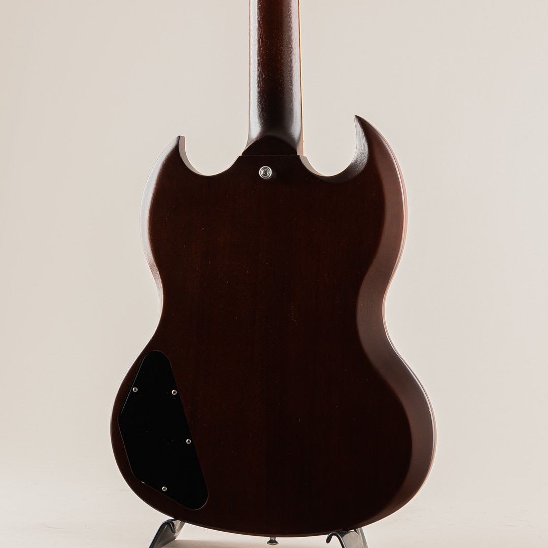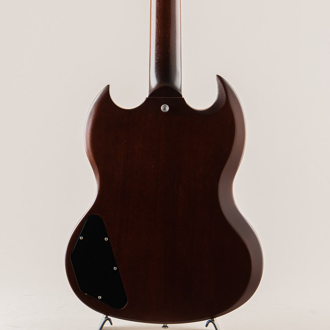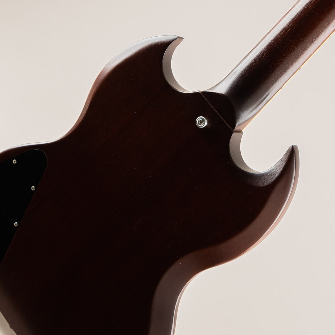 マホガニーボディ / マホガニーネック / ローズウッド指板にて構成されたウッドマテリアル。スモールピックガード / スリムネック仕様等、基本仕様はSG 61タイプと同様ながら、サテンフィニッシュにアンティーク・ウォルナットカラーがチョイスされた限定仕様となります。スリムなネックとサテンフィニッシュの組み合わせによって実現した滑らかなネックグリップ、ハイポジションへのアクセスが容易なダブルカッタウェイ構造により快適な演奏性が確保。ピックアップには57クラシックを2機搭載。SGらしい軽快で明快な響きはそのままに、色気のあるミッド感が堪らないサウンド。クリーンからドライブサウンドまで幅広くお楽しみた頂けること間違いなし。