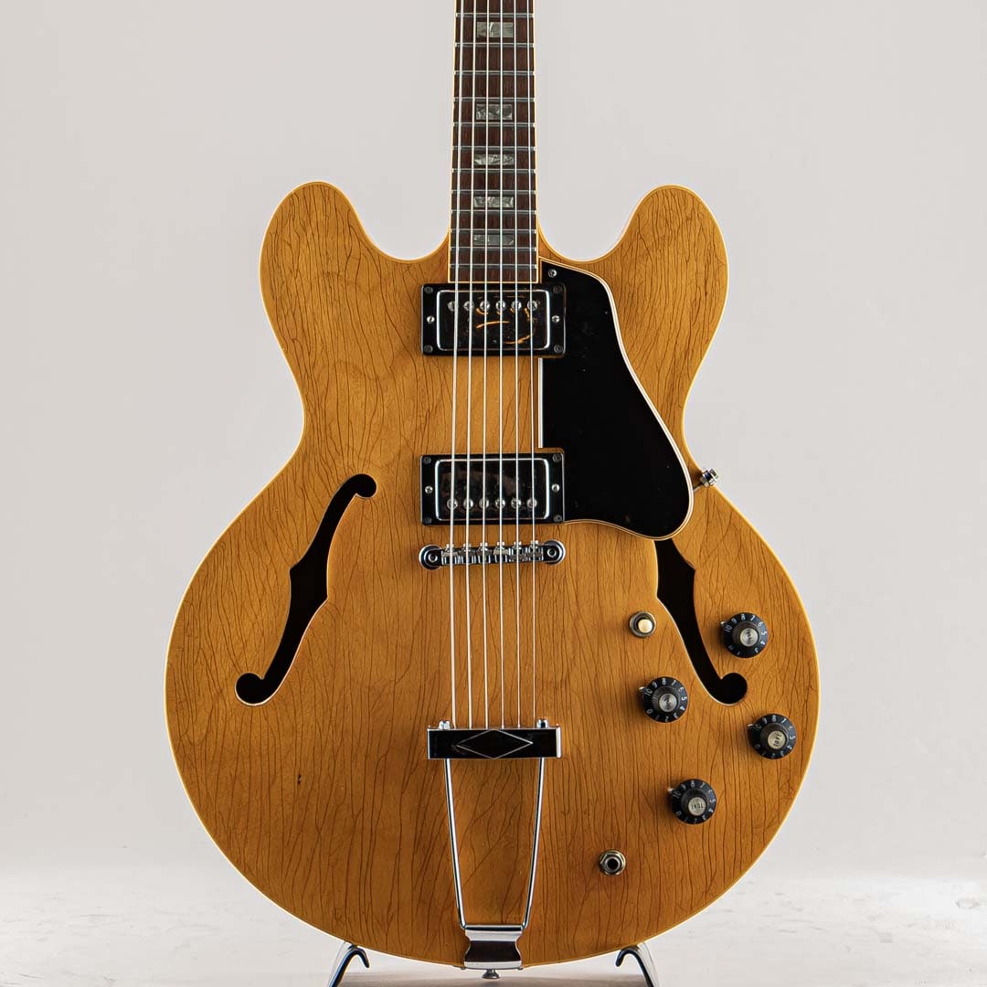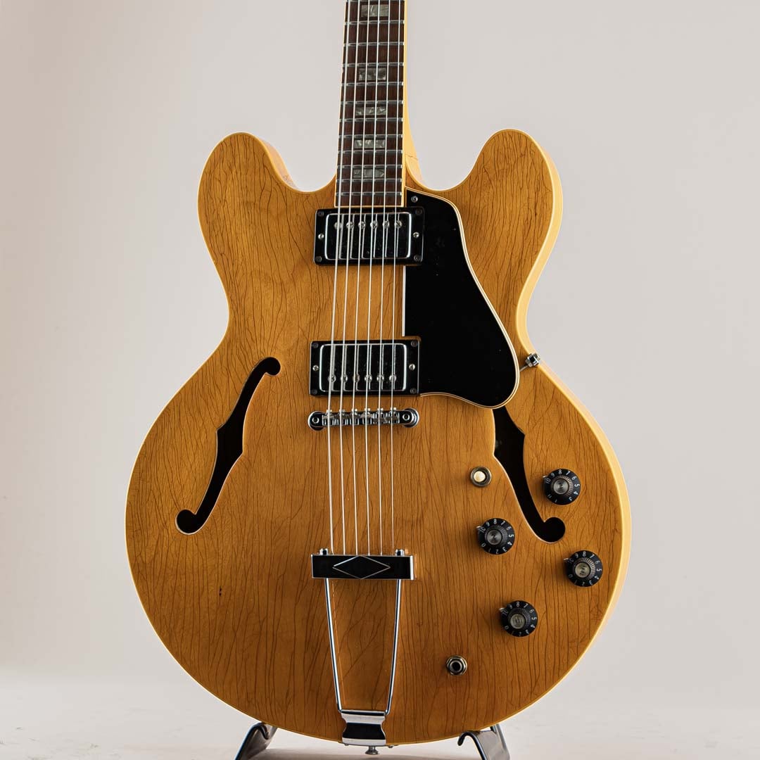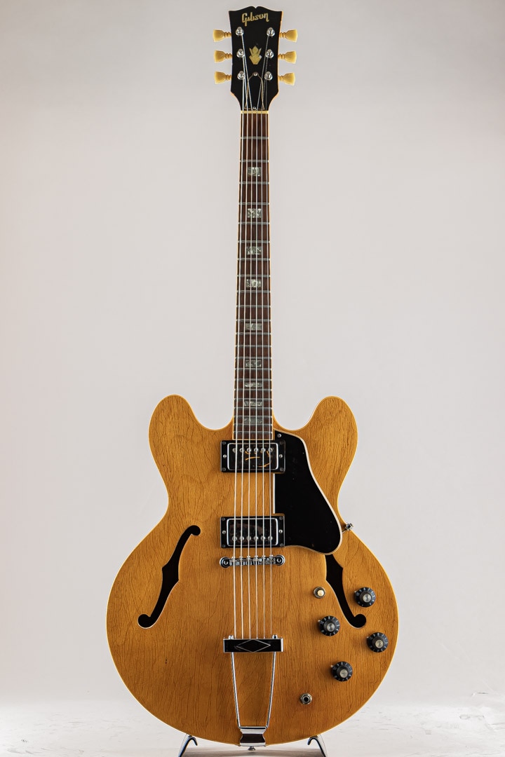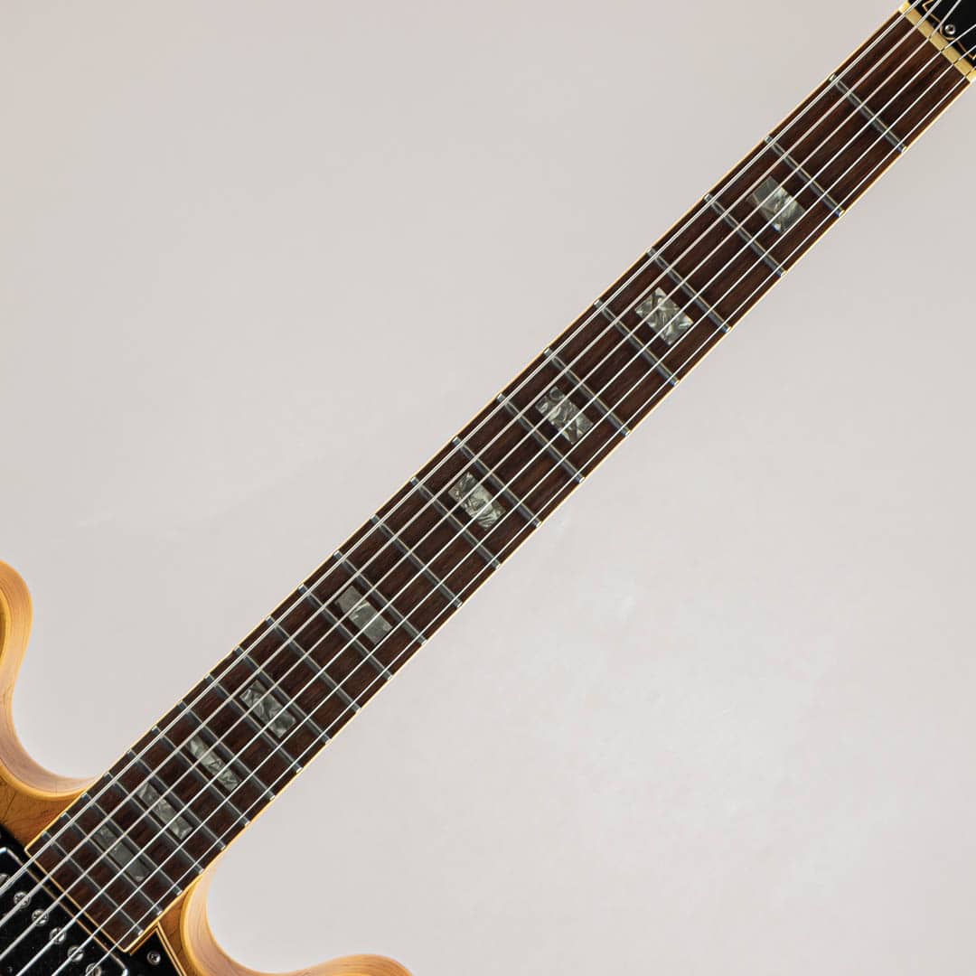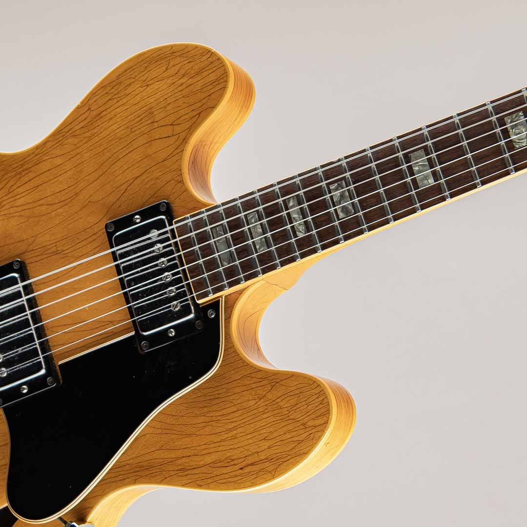 GIBSON セミアコースティックの335ファミリーにおいて特別仕様的に69年から73年までしか生産されなかったレアなモデル。本機の特徴はこの年代のES-335などは3Pマホガニーネックが通常のスペックなっておりますが本モデルは薄いウォルナット材を間に挟んだ5ピースのメイプルネックが採用されており、他のセミアコモデルでは得られない、歯切れの良さがありながらも絶妙ないなたさを感じさせるサウンドは必聴の価値ありです。その他、通常の335モデルとは違ったコントロール配線となっておいるのも大きな特徴で、フロントボリュームを調整するノブがバランスコントロールノブとなっております。それを操作することで通常の335では出しえない独特のサウンドをアウトプットすることができる仕様となっております。ピックアップはオリジナルPAFを2機搭載。過去に巻き直し等が行われたのか、ピックアップカバーにハンダ付けされた形跡がございます。しかしながら、サウンドにおいてはメイプルネックから成る硬質な響きがありつつも、温かみがありふくよかなエアー感を併せ持ったグッドサウでございます。