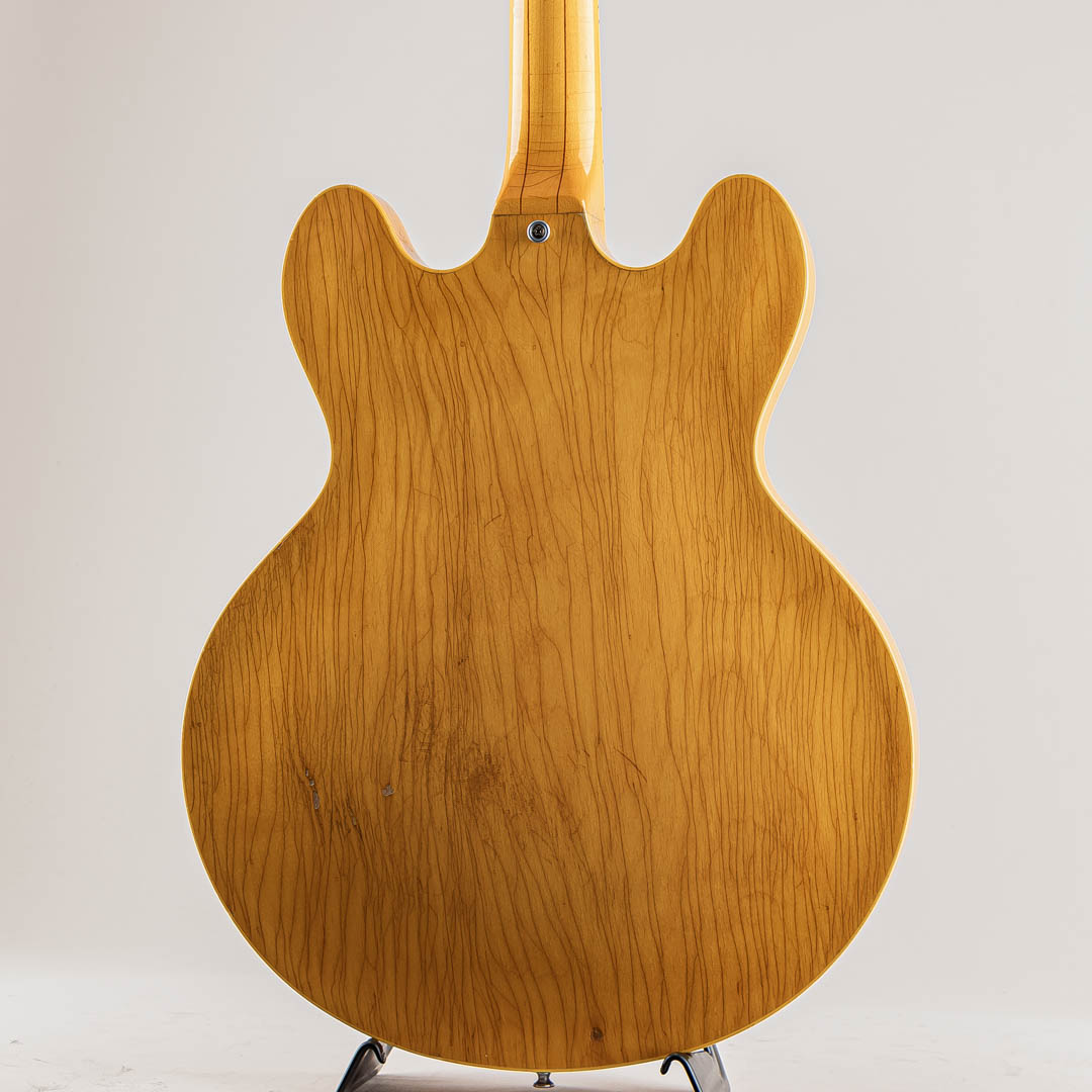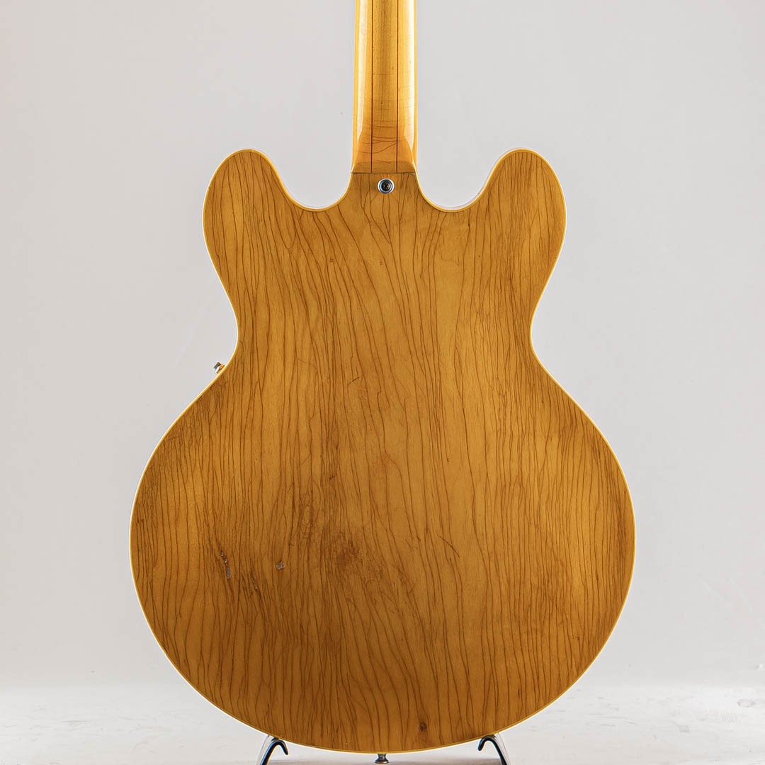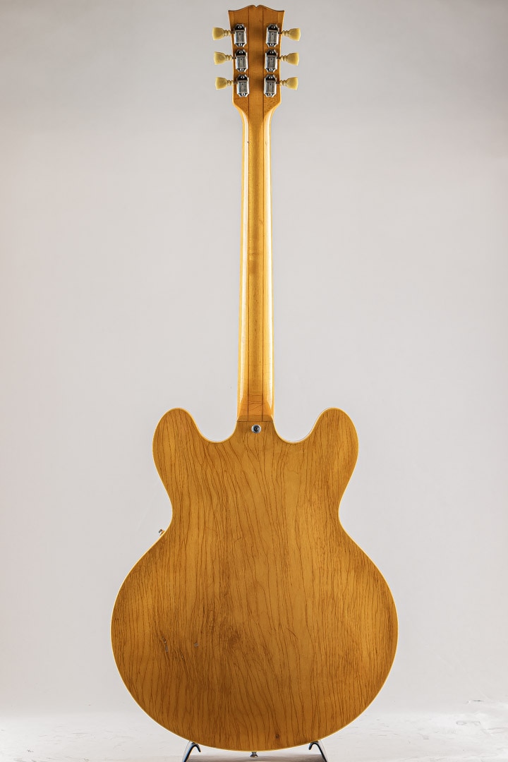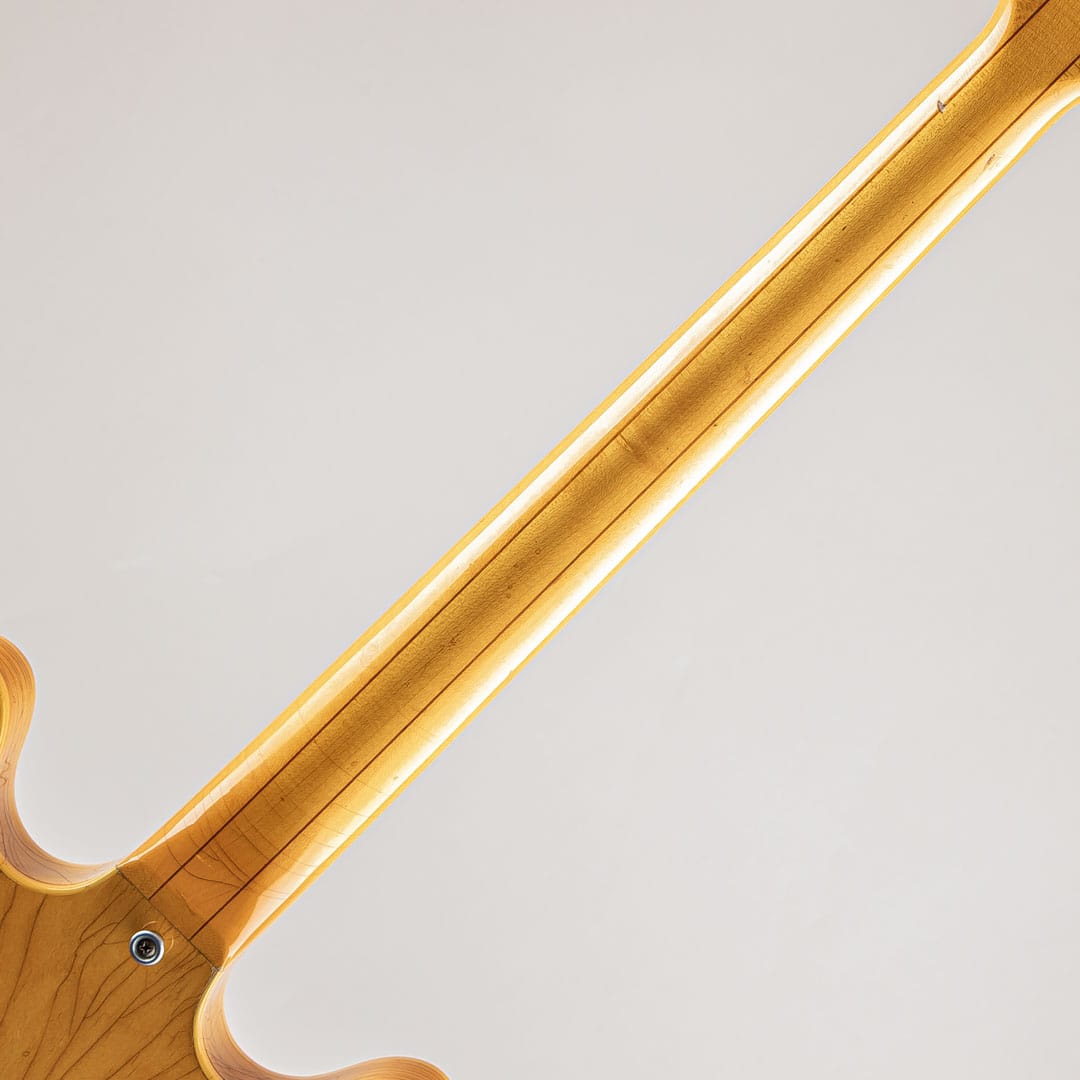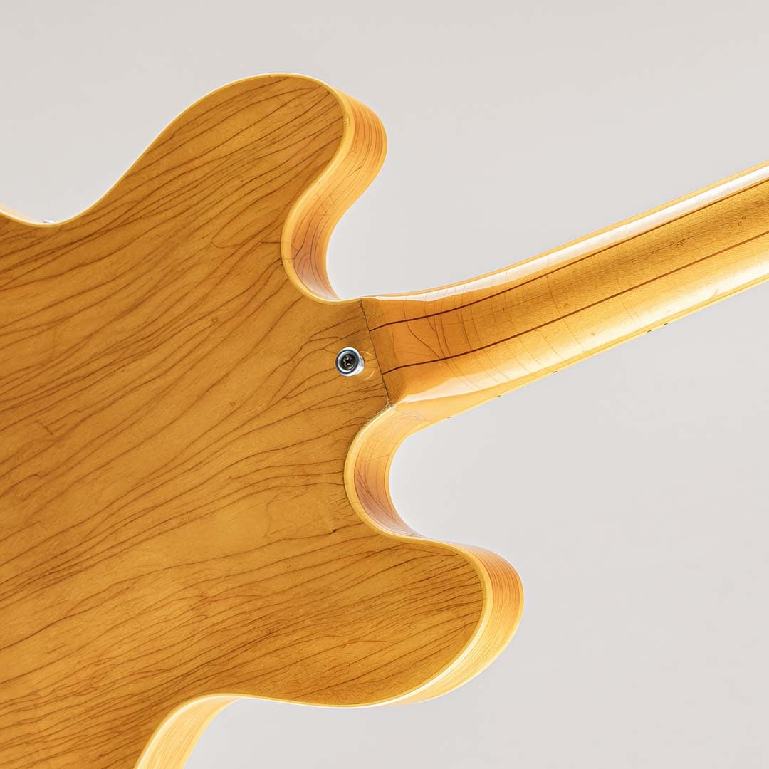GIBSON セミアコースティックの335ファミリーにおいて特別仕様的に69年から73年までしか生産されなかったレアなモデル。本機の特徴はこの年代のES-335などは3Pマホガニーネックが通常のスペックなっておりますが本モデルは薄いウォルナット材を間に挟んだ5ピースのメイプルネックが採用されており、他のセミアコモデルでは得られない、歯切れの良さがありながらも絶妙ないなたさを感じさせるサウンドは必聴の価値ありです。その他、通常の335モデルとは違ったコントロール配線となっておいるのも大きな特徴で、フロントボリュームを調整するノブがバランスコントロールノブとなっております。それを操作することで通常の335では出しえない独特のサウンドをアウトプットすることができる仕様となっております。ピックアップはオリジナルPAFを2機搭載。過去に巻き直し等が行われたのか、ピックアップカバーにハンダ付けされた形跡がございます。しかしながら、サウンドにおいてはメイプルネックから成る硬質な響きがありつつも、温かみがありふくよかなエアー感を併せ持ったグッドサウでございます。