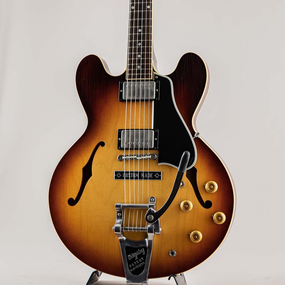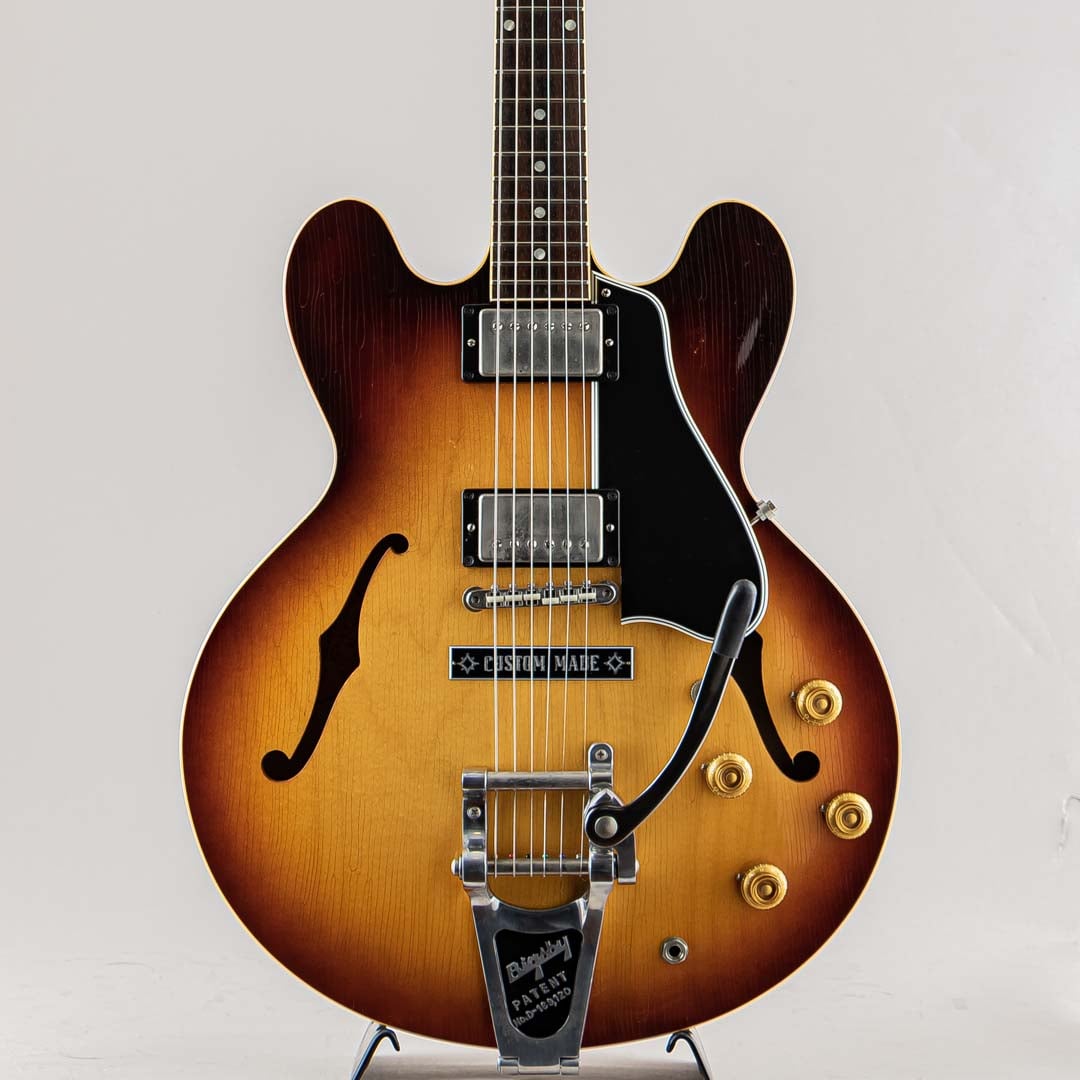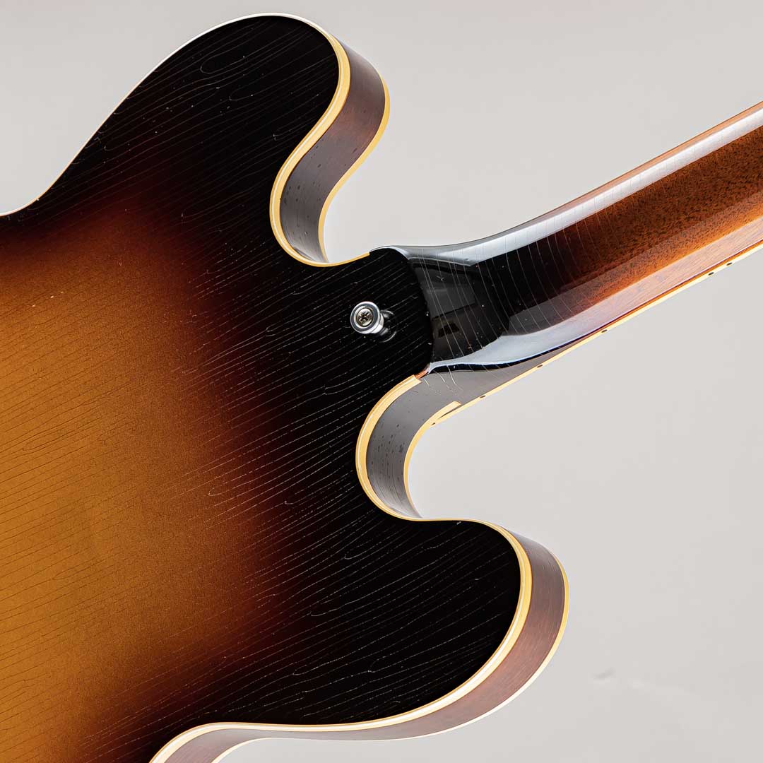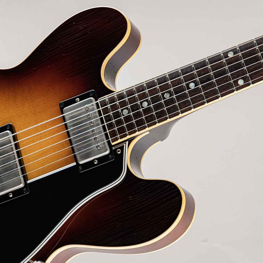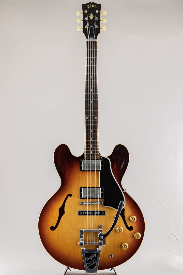 2017年製ナッシュビル・カスタムショップにて製作された1959 ES-335ビグスビー搭載型が中古にて入荷いたしました。ドット・インレイ / ソリッド・センターブロック / ロングピックガード / ミッキーマウスホーンといった、1959年仕様が再現されたスペック面。そして、本機のテイルピースをビグスビーB7にし、カスタム・メイド・プレートがを取り付けが特別に取り付けられた珍しい仕様となり、おそらくカスタムオーダーメイドの個体かと思われます。ウッドマテリアルは、ラミネイト・メイプルボディ / マホガニーネック / ローズウッド指板にて構成。フィニッシュは赤みを僅かに残したフェイドしたサンバーストと、Lightly Agedのコントラストはマッチしており、ビグスビーやカスタムプレートと相まって、非常にかっこいいルックスで、ロックンロールのような印象がある出立ちでございます。ネックシェイプはやや厚みがありながらも、吸い付くようなグリップ感が特徴的な59 Round。