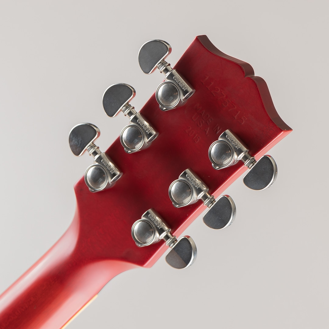 2015年製の本機。ボディに細やかな傷、金属パーツにくすみといった経年相応の使用感は見受けられますが、サテンフィニッシュということを鑑みますと、比較的美しいコンディションを維持。ブリッジパーツが他社製のものへ交換されております。フレット周りは、ローフレット側に僅かながら凹凸が見受けられるものの、現状音詰まりとは見受けられず、トラスロッドの効き幅も十分に残されておりますので、これからも活躍を期待できるネックコンディションでございます。惜しむらくはオリジナルのハードケースや付属品等が欠品しておりますが、Gibsonロゴ入りのハードケースと中古保証6ヶ月が付属致します。
