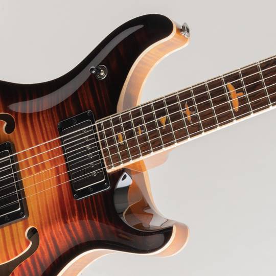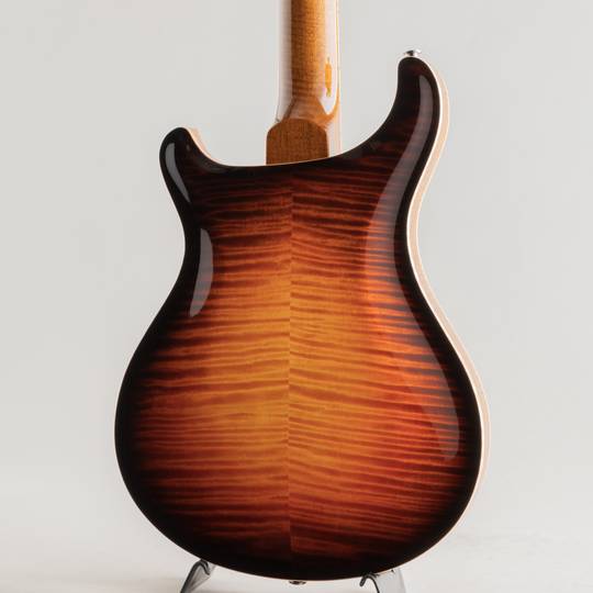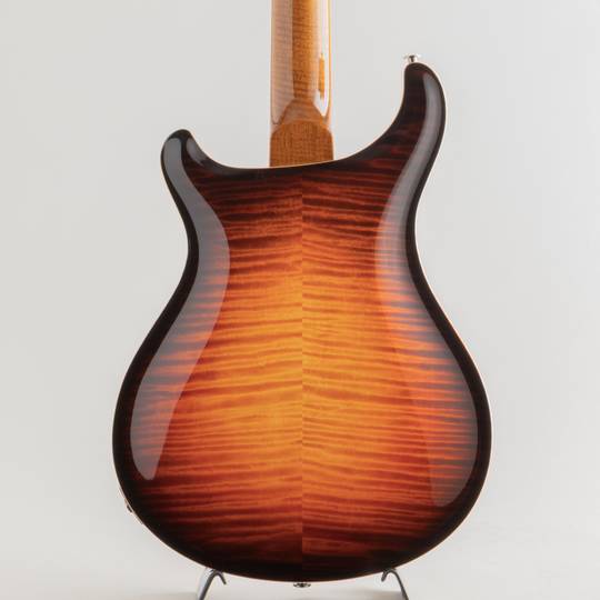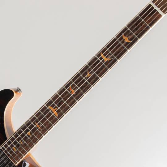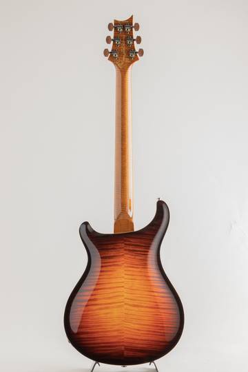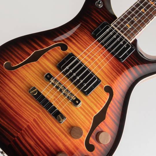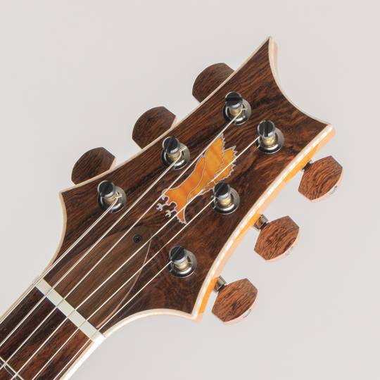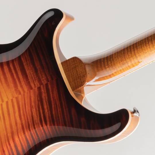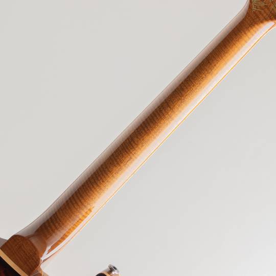 最高峰のカーリーメイプルトップに、Tiger Sloe Smoked Burstの渋いカラーリングは、非常に美しい杢目を引き立ており、オレンジカラーにマザーオブパールで縁取られたバードインレイは、ボディのカラーリングと相まって、まるで秋の夕暮れを感じさせるようであり、カーリーメイプルのバインディングにより一枚の絵画のような芸術性を感じさせます。