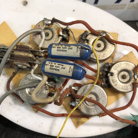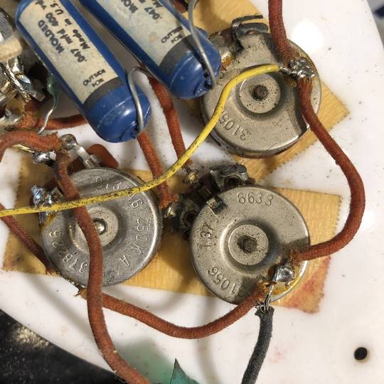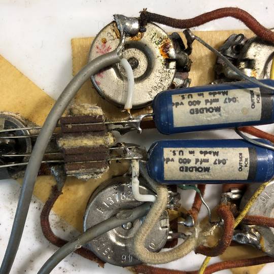 その他、ネックヒールにストラップピン取り付け跡、ピックアップカバー固定ビスが1ヶ所欠品、一部配線材・Potの交換等ございますが使用に際し問題ございません。