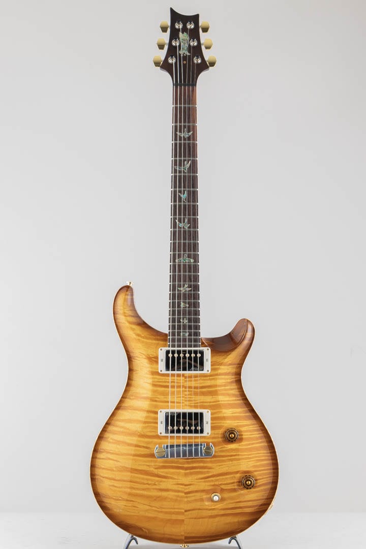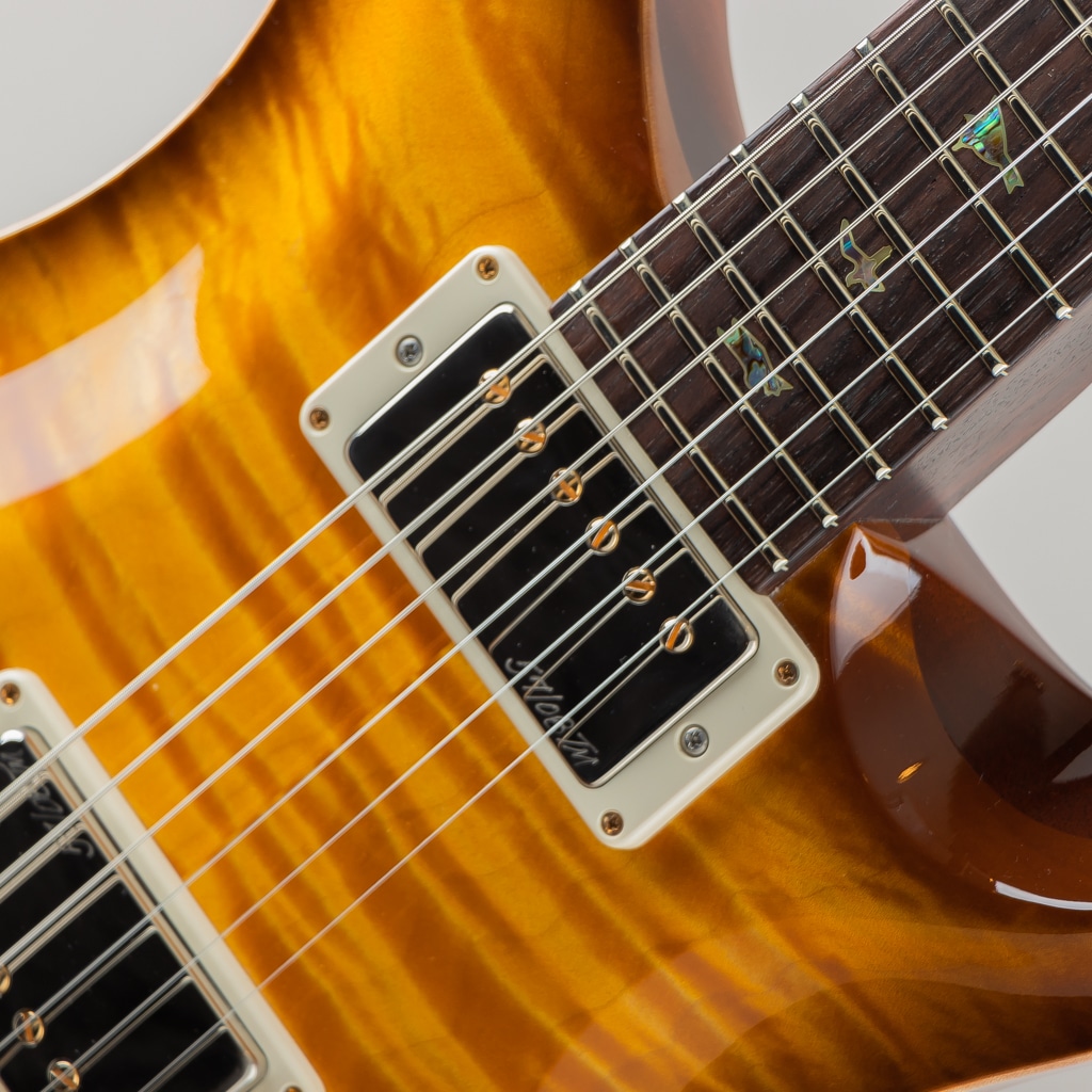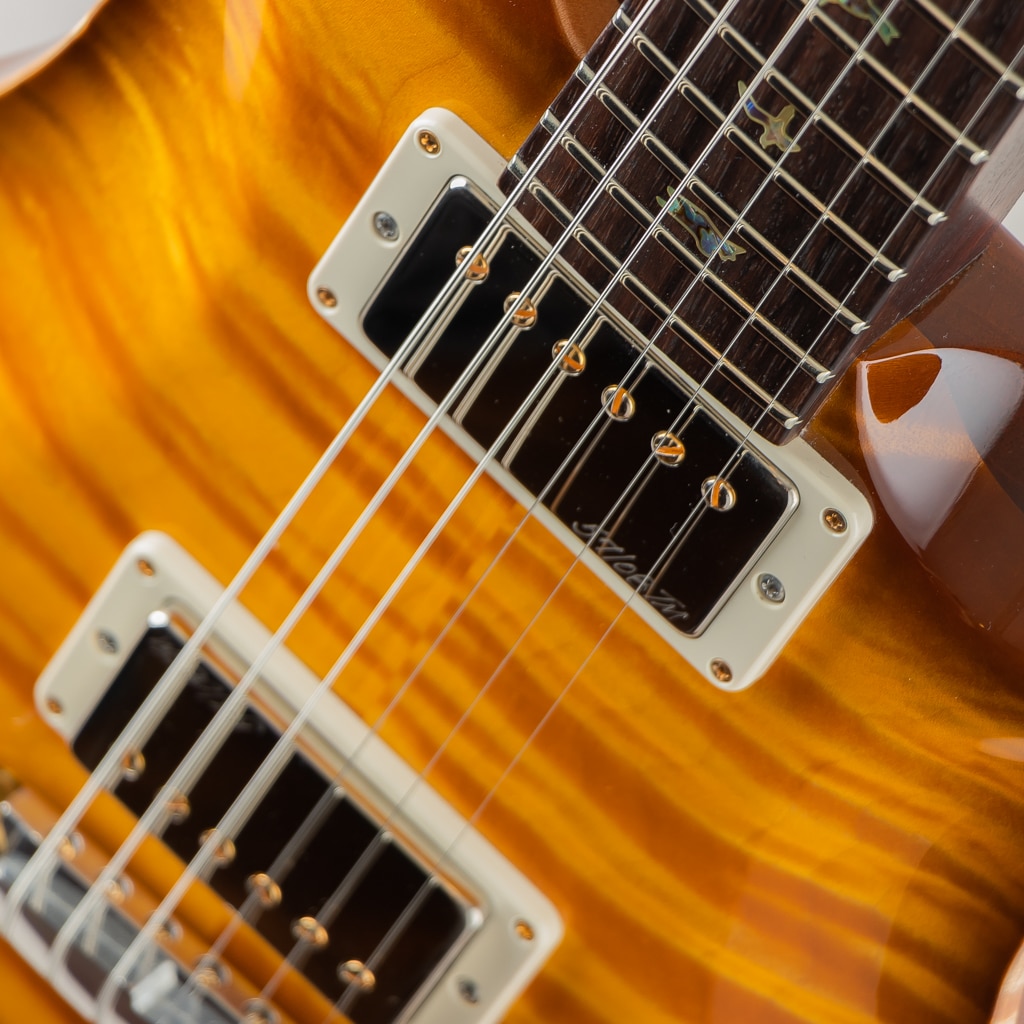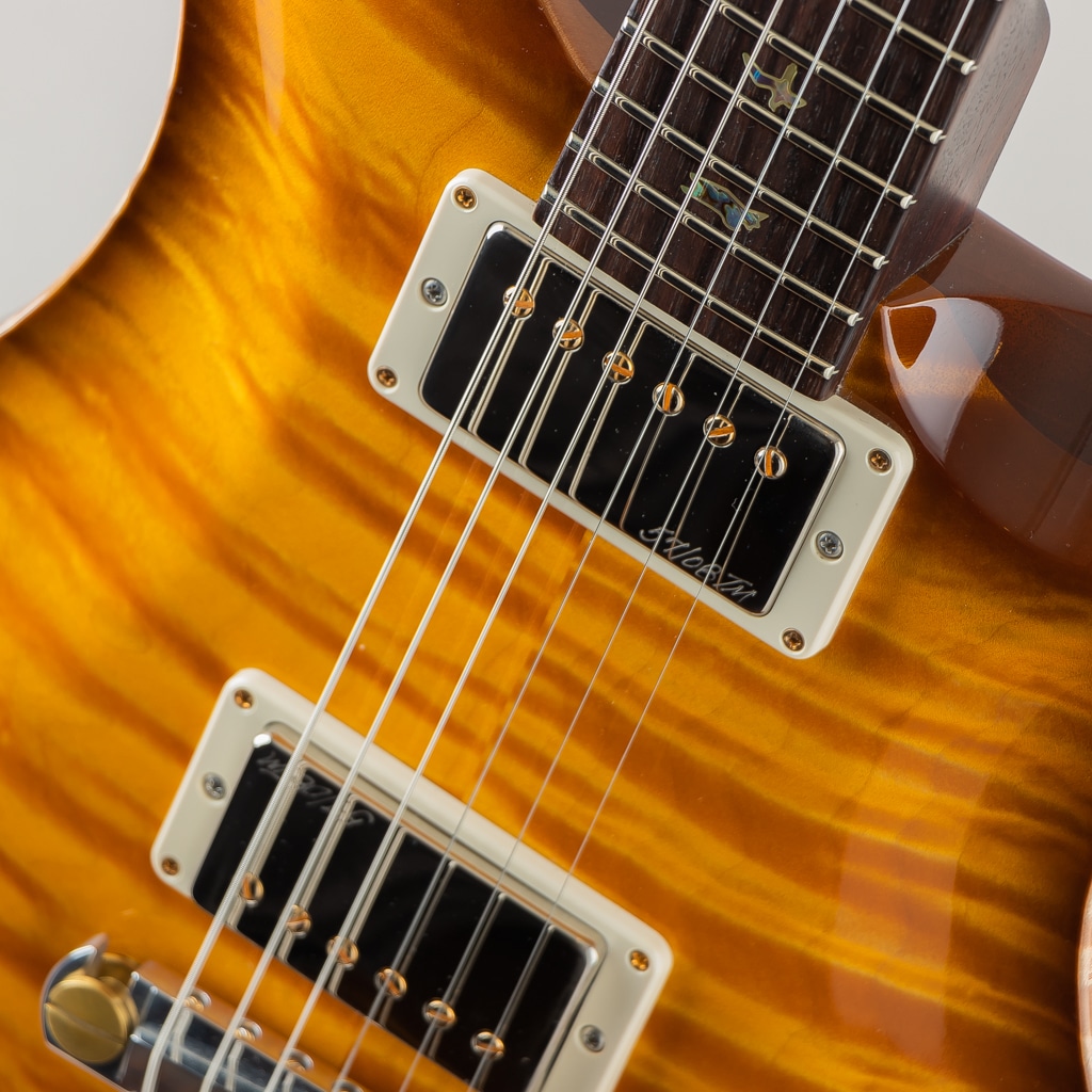 ショップオーダーの拘りを感じるCustom Retro topが採用されており、プリファクトリー期にハンドカーブにてカーブトップを製作していた頃のとてもグラマラスなカーブをNCにて再現した製法にてオーダーされております。カッタウェイあたりのエッジ感はマニアには堪らないギターとなっております。ブラスインサートなしの一体型のストップテイルブリッジ、57/08ピックアップとMcCartyのコンセプトに則った玄人仕様となります。現地選定のインディアンローズウッドネックにハカランダ指板と突板をチョイス。ボディトップは太いストライプの極上杢。サウンドはローズネック特有のパリッとしたトーンを尊重したピックアップと木の質量の高いマッカーティーボディが相まり、荒々しくタイト且つ程よい倍音感が大変おすすめとなります。PRSの真骨頂でもあるダイナミックレンジの広いトーンの範疇でビンテージサウンドをアウトプットし、RECでも重宝できる素晴らしい1本となります。