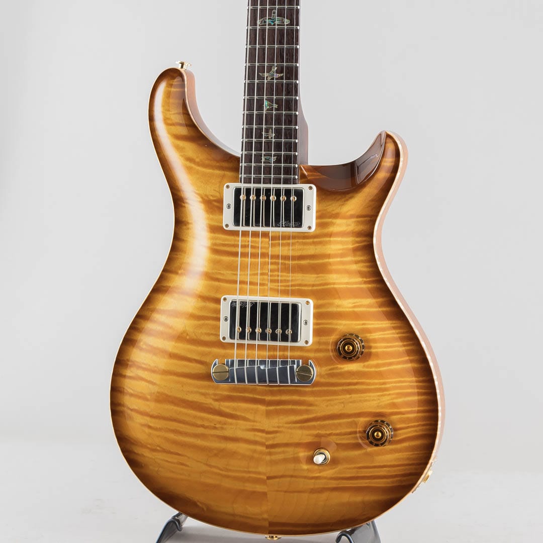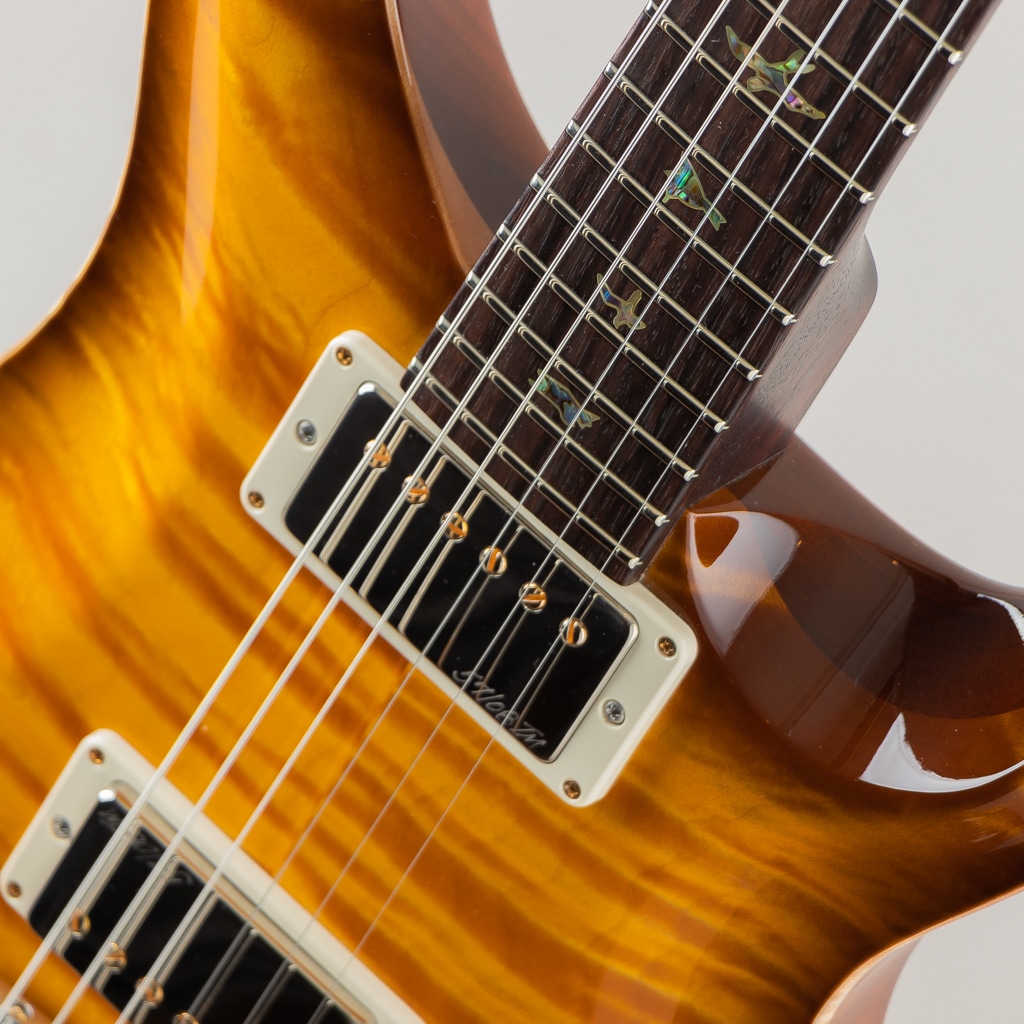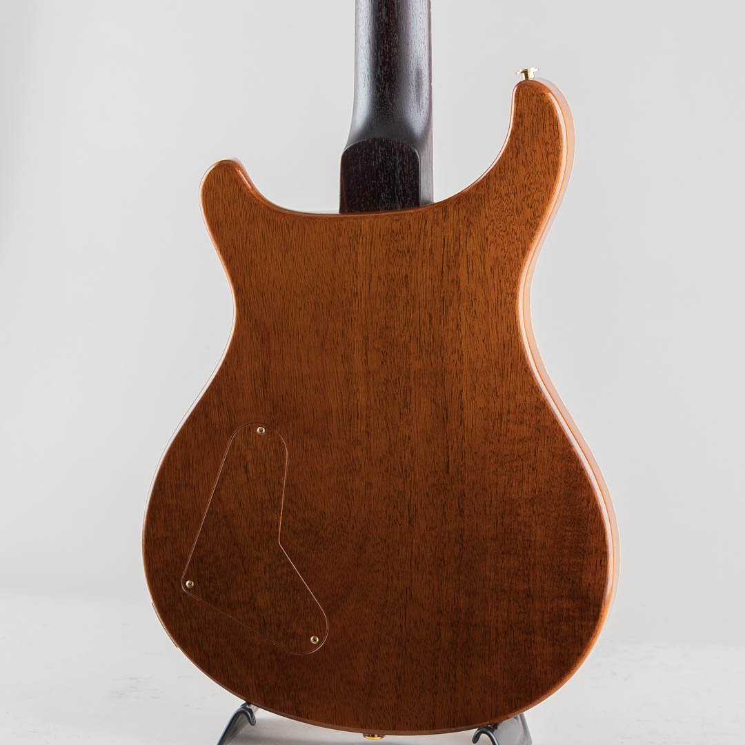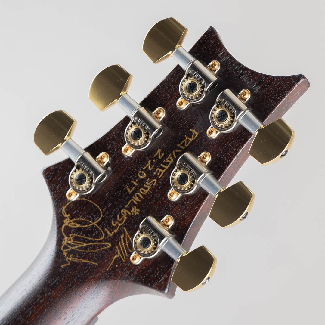 ショップオーダーの拘りを感じるCustom Retro topが採用されており、プリファクトリー期にハンドカーブにてカーブトップを製作していた頃のとてもグラマラスなカーブをNCにて再現した製法にてオーダーされております。カッタウェイあたりのエッジ感はマニアには堪らないギターとなっております。ブラスインサートなしの一体型のストップテイルブリッジ、57/08ピックアップとMcCartyのコンセプトに則った玄人仕様となります。現地選定のインディアンローズウッドネックにハカランダ指板と突板をチョイス。ボディトップは太いストライプの極上杢。サウンドはローズネック特有のパリッとしたトーンを尊重したピックアップと木の質量の高いマッカーティーボディが相まり、荒々しくタイト且つ程よい倍音感が大変おすすめとなります。PRSの真骨頂でもあるダイナミックレンジの広いトーンの範疇でビンテージサウンドをアウトプットし、RECでも重宝できる素晴らしい1本となります。