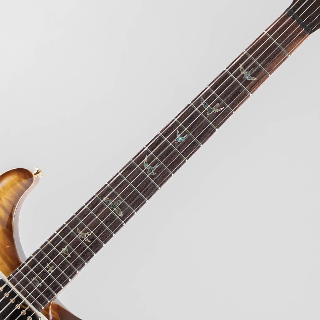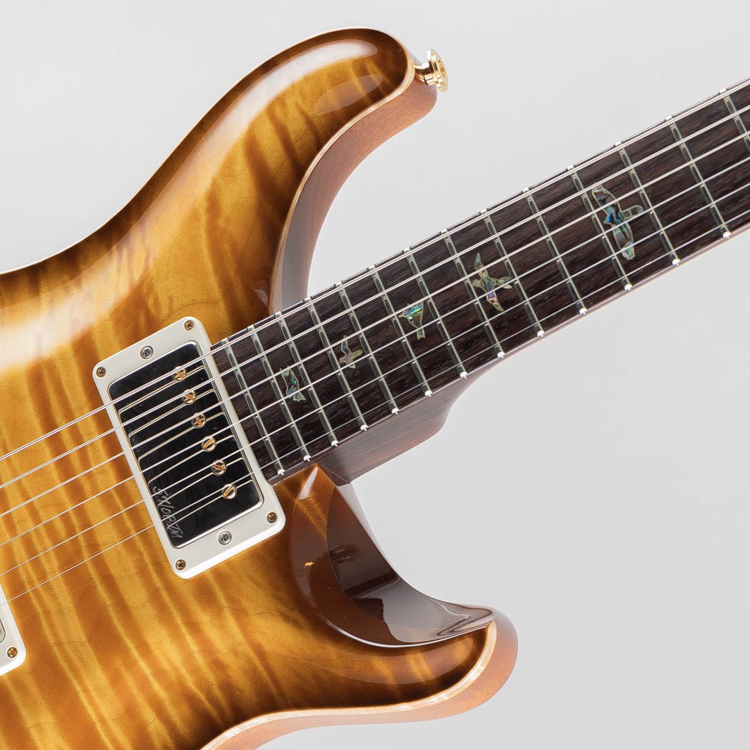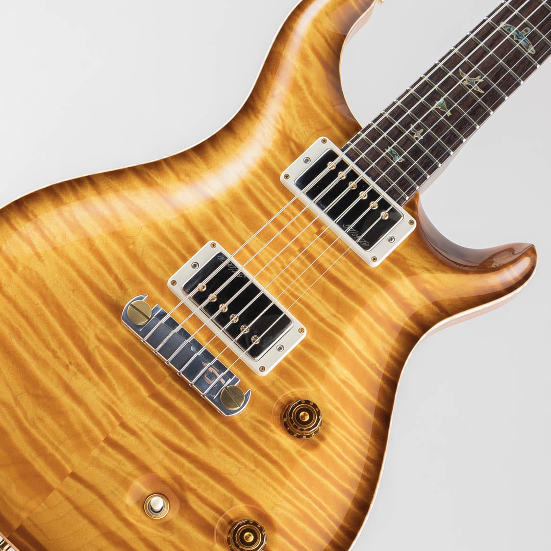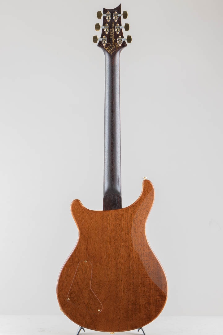 ショップオーダーの拘りを感じるCustom Retro topが採用されており、プリファクトリー期にハンドカーブにてカーブトップを製作していた頃のとてもグラマラスなカーブをNCにて再現した製法にてオーダーされております。カッタウェイあたりのエッジ感はマニアには堪らないギターとなっております。ブラスインサートなしの一体型のストップテイルブリッジ、57/08ピックアップとMcCartyのコンセプトに則った玄人仕様となります。現地選定のインディアンローズウッドネックにハカランダ指板と突板をチョイス。ボディトップは太いストライプの極上杢。サウンドはローズネック特有のパリッとしたトーンを尊重したピックアップと木の質量の高いマッカーティーボディが相まり、荒々しくタイト且つ程よい倍音感が大変おすすめとなります。PRSの真骨頂でもあるダイナミックレンジの広いトーンの範疇でビンテージサウンドをアウトプットし、RECでも重宝できる素晴らしい1本となります。