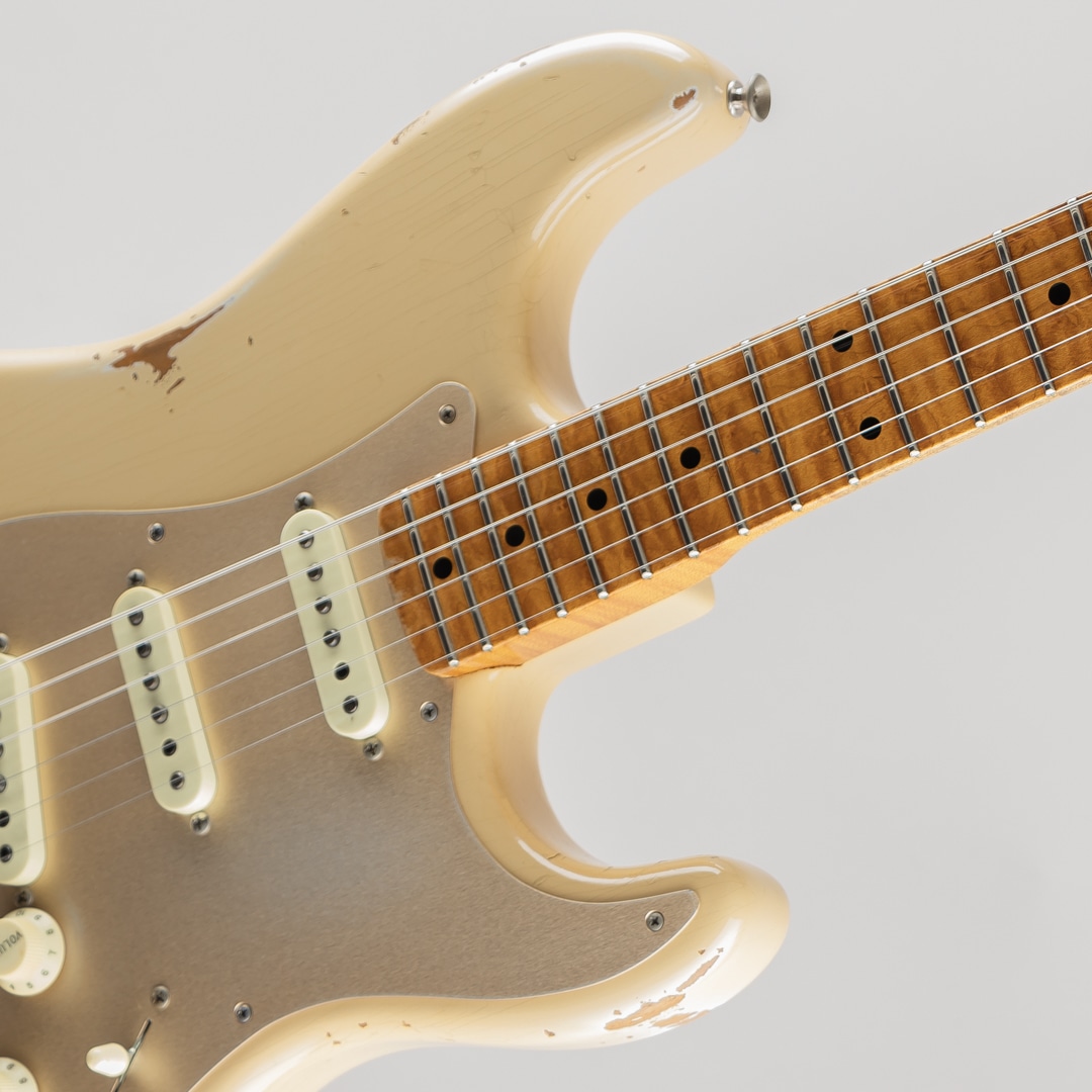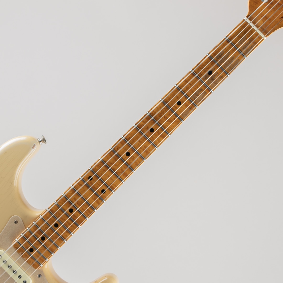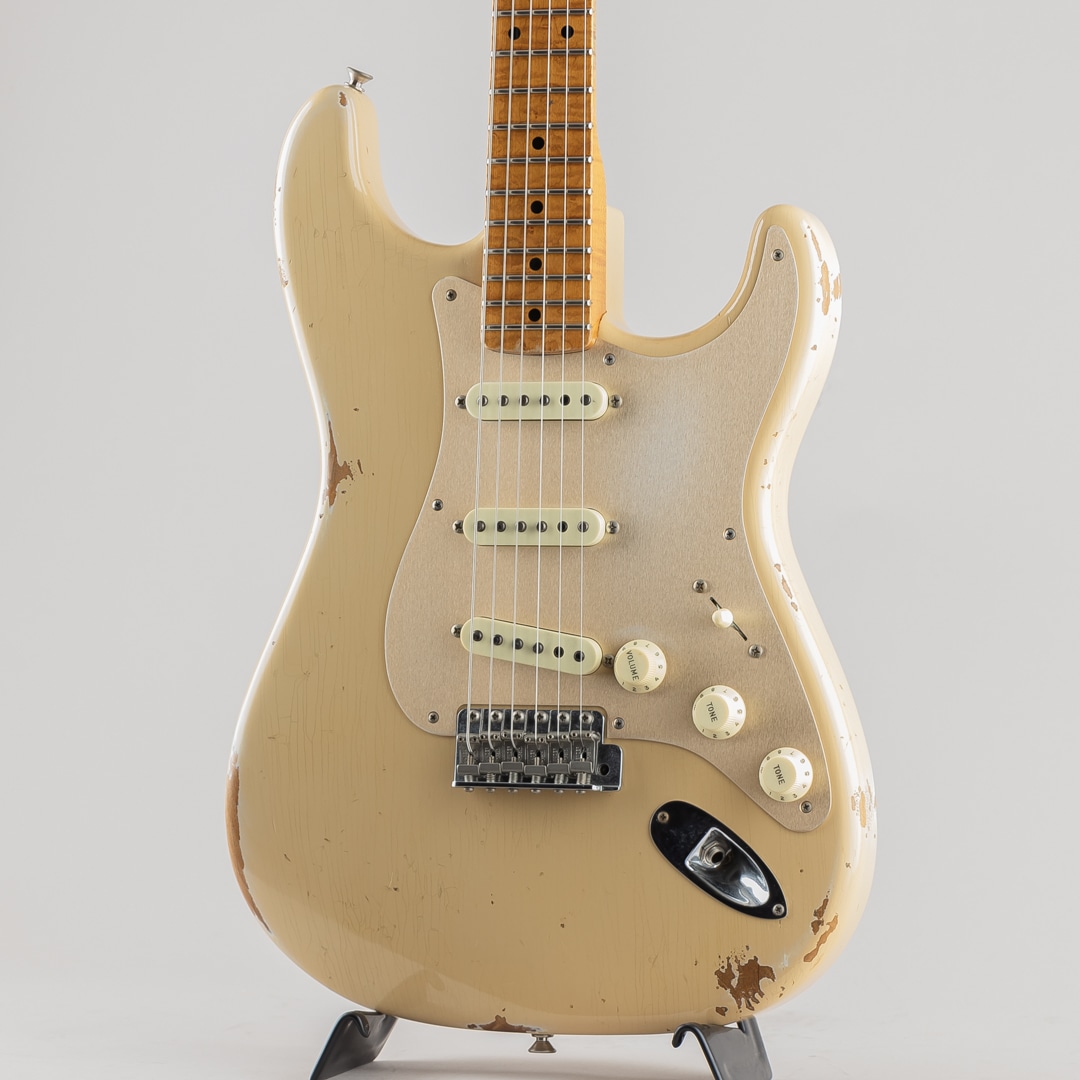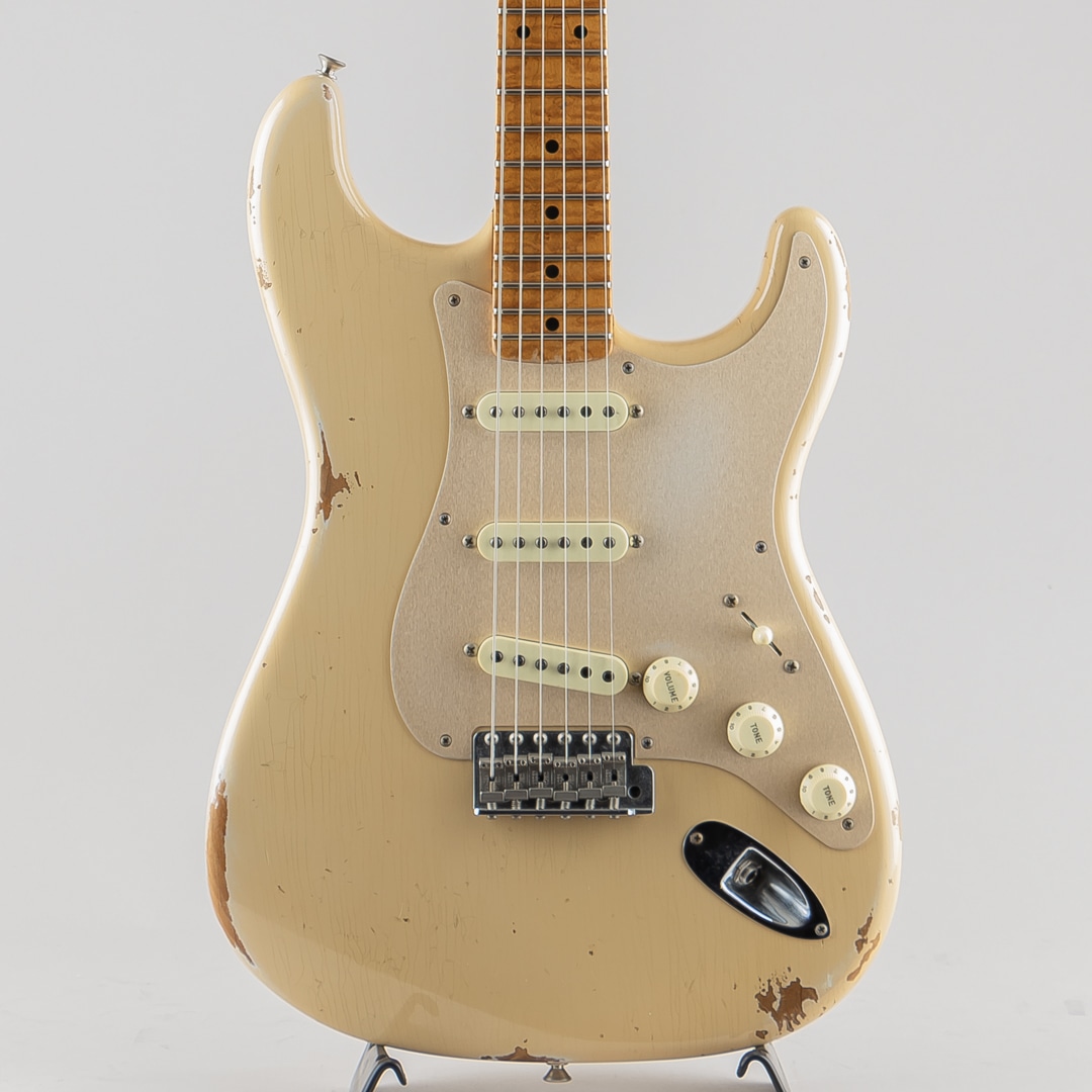 今回入庫の個体は"56 Stratocaster" をベースに製作されたモデルでジャーニーマンレリック仕上げの "エイジド・デザート・サンド" カラーを纏うアルダーボディに10/56Vネックシェイプのバーズアイにフレイムの入り混じる迫力ある杢目が魅力のメイプルネックのウッドマテリアル。