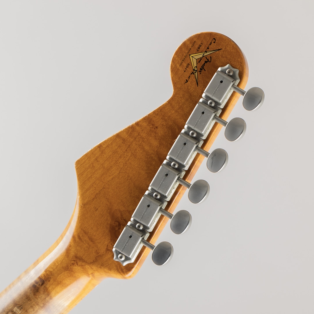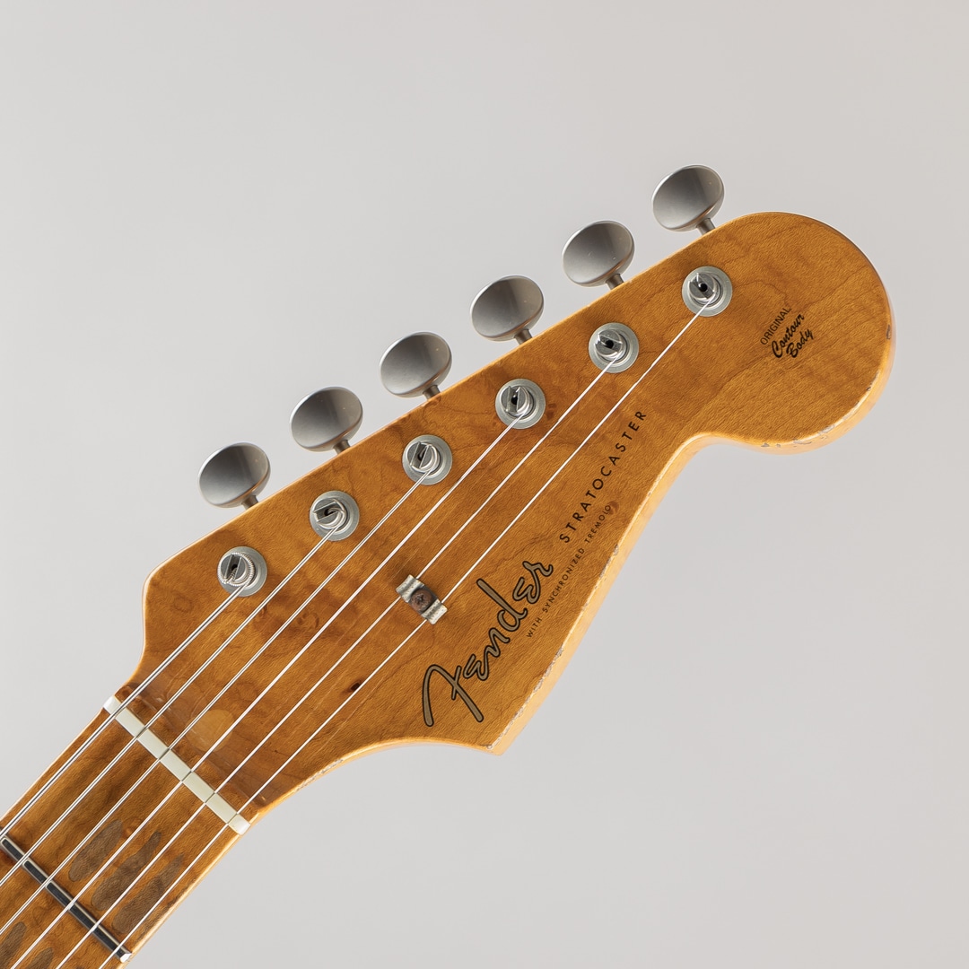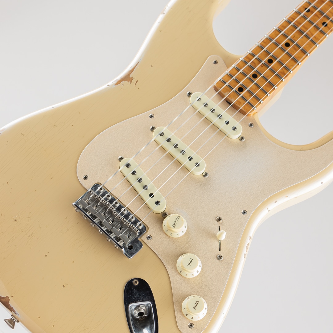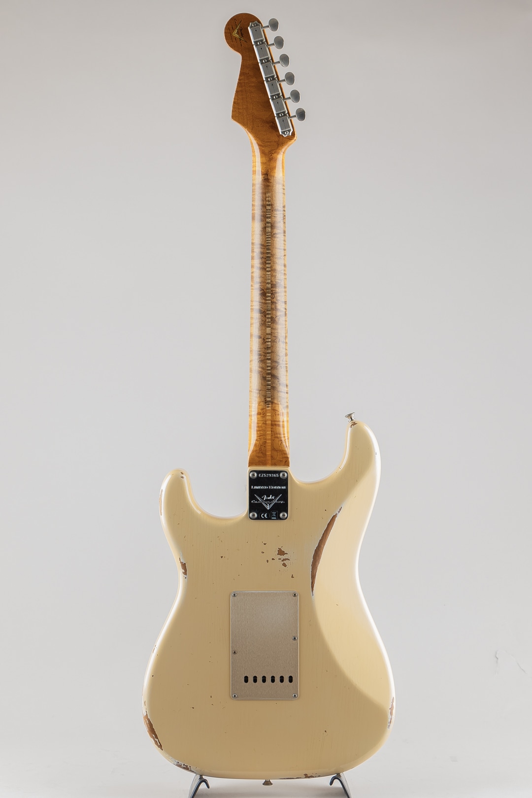 今回入庫の個体は"56 Stratocaster" をベースに製作されたモデルでジャーニーマンレリック仕上げの "エイジド・デザート・サンド" カラーを纏うアルダーボディに10/56Vネックシェイプのバーズアイにフレイムの入り混じる迫力ある杢目が魅力のメイプルネックのウッドマテリアル。