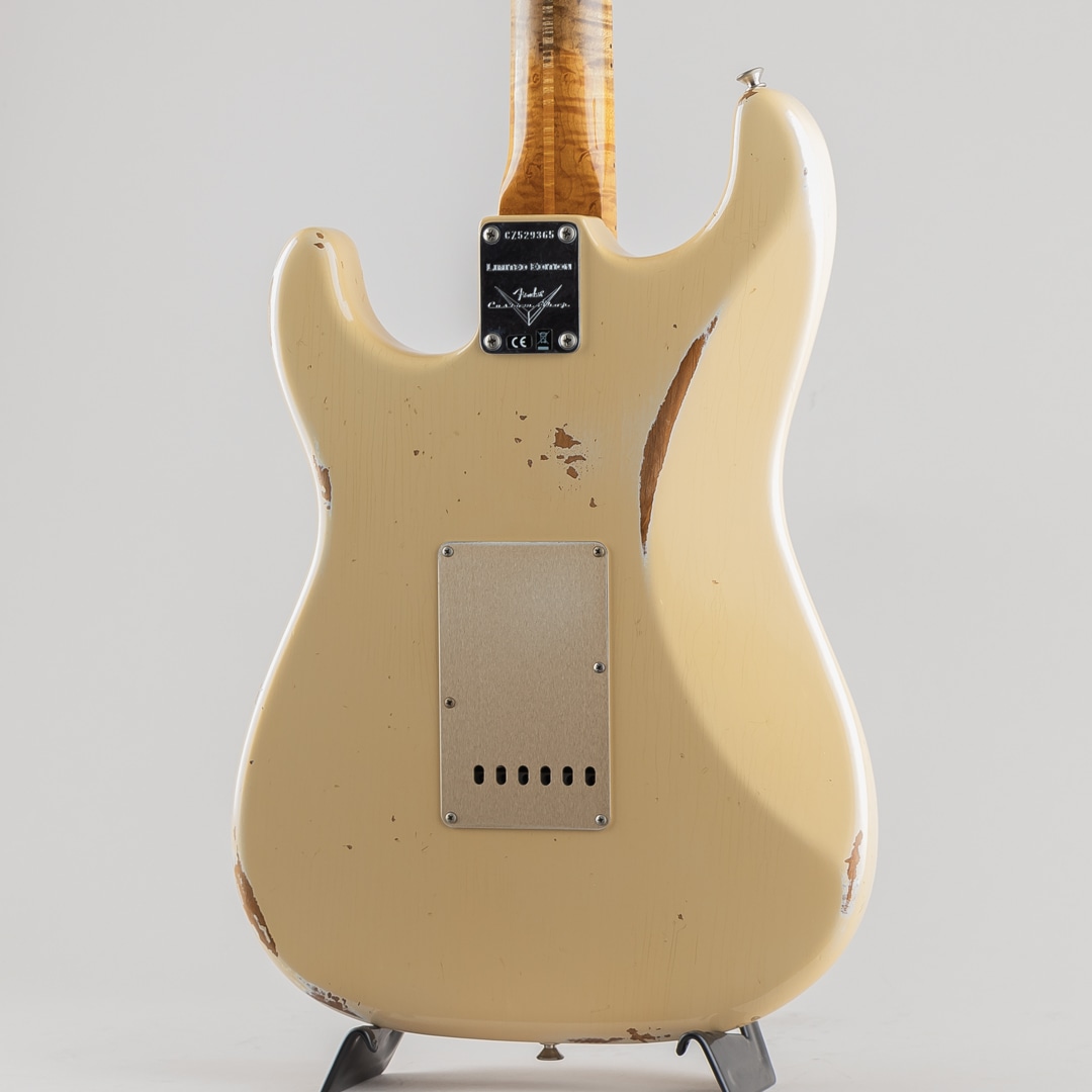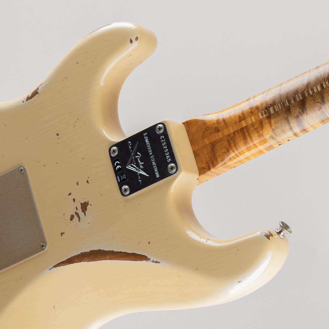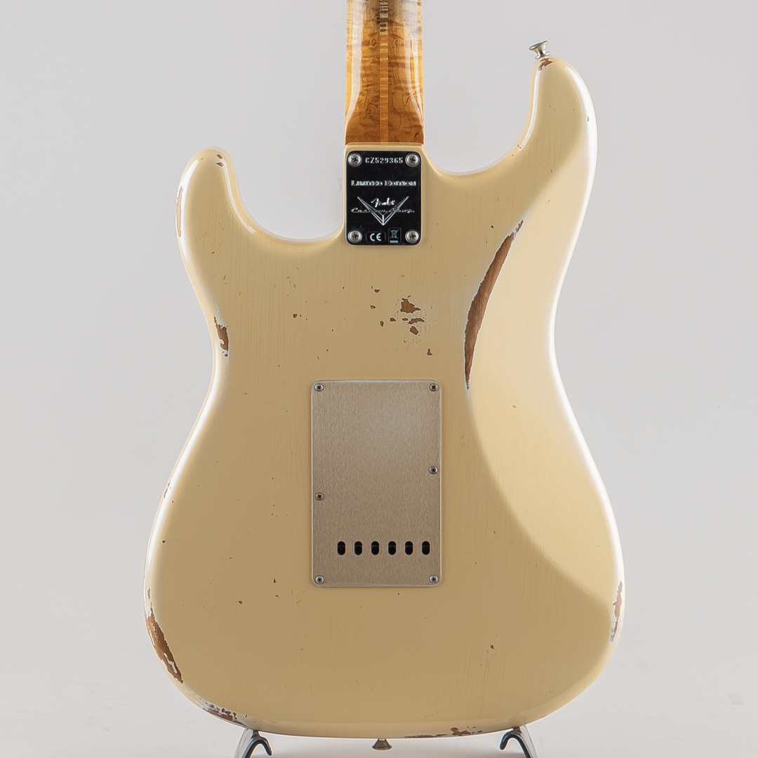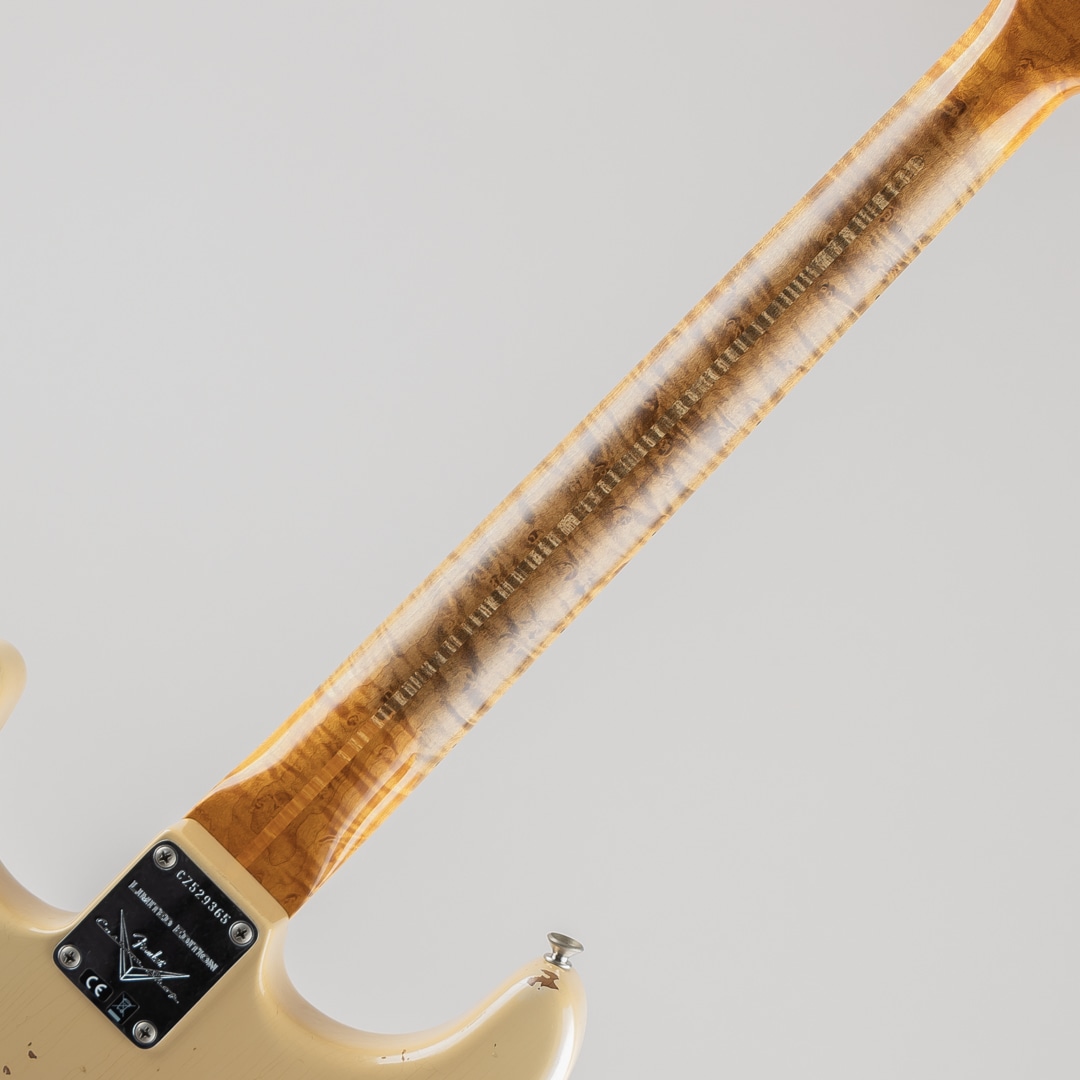 今回入庫の個体は"56 Stratocaster" をベースに製作されたモデルでジャーニーマンレリック仕上げの "エイジド・デザート・サンド" カラーを纏うアルダーボディに10/56Vネックシェイプのバーズアイにフレイムの入り混じる迫力ある杢目が魅力のメイプルネックのウッドマテリアル。