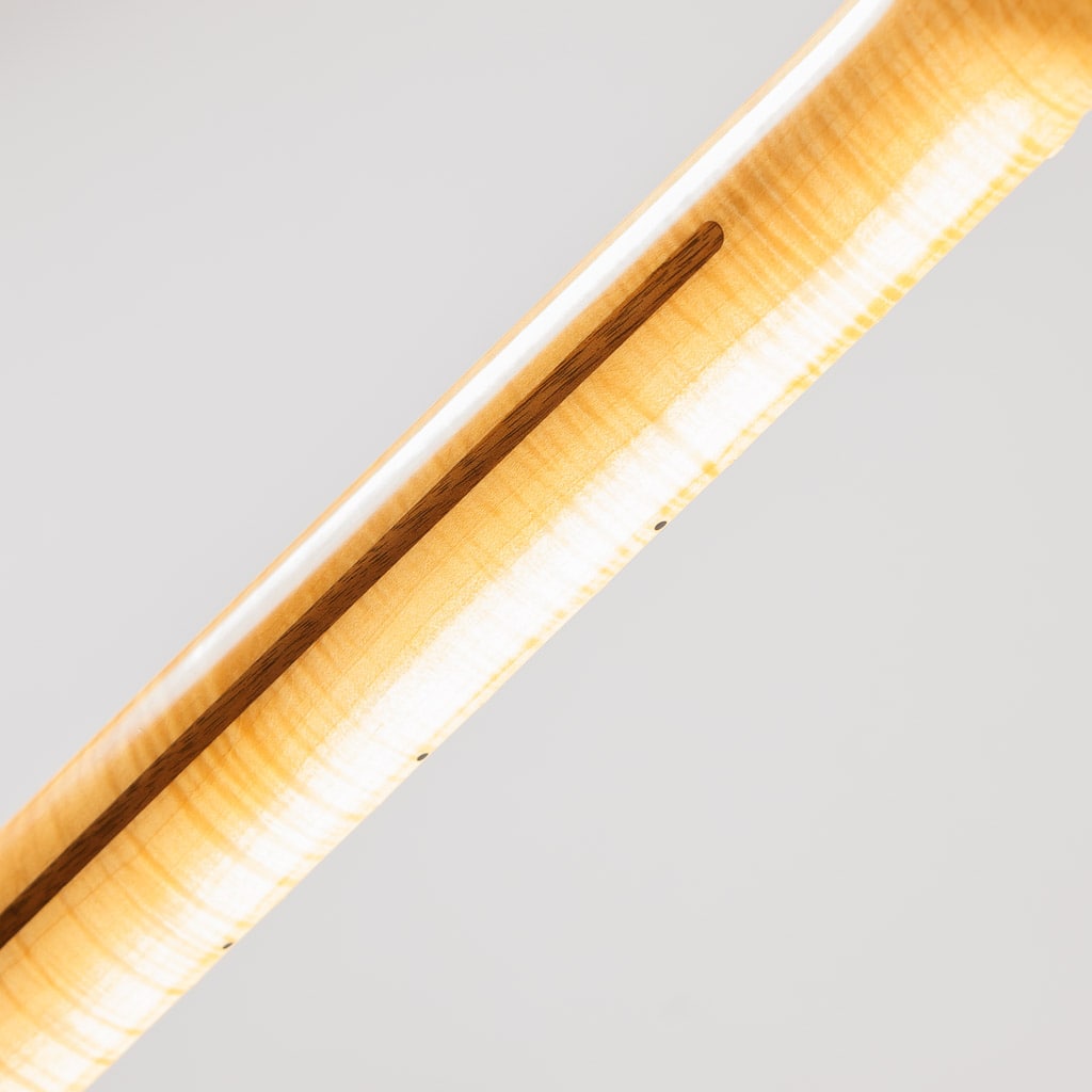 緻密なレリック加工の施された2カラーサンバーストカラーを纏うオフセット2ピース仕様のササフラスボディに、しっかりと厚みのある10/56 “V” シェイプを持った “AAAA” グレードフレイムメイプルネックのシンプルながら個体の実力が試されるウッドマテリアル。
