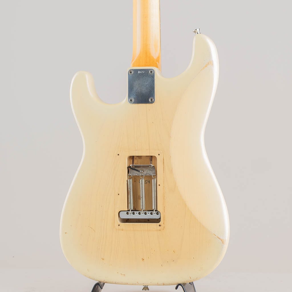 Mid 50s tremolo style tremolo bridge with 6 individual steel saddles, neck plate stamped with serial number 1677.