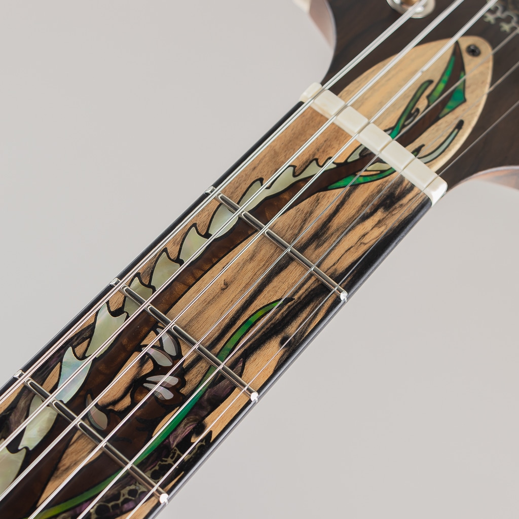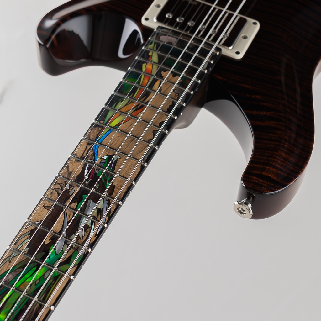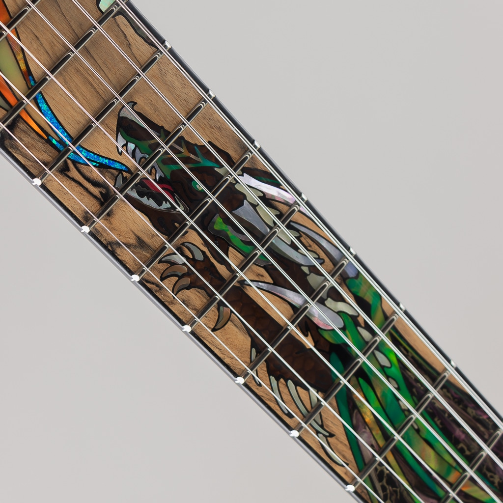 このギターのルックス面において最大の魅力となる圧巻のドラゴン・インレイは、Dungeons & Dragonsのルールブック・カバーを担当したことでも知られるファンタジー・アーティスト、ジェフ・イーズリーによって描かれ、Aulson Inlay社によってインレイとして再現されました。Blue Pacific Opal、Brown Scale Juma、そしてGold、Black、White、Brownの Mother of Pearlなど200以上の素材パーツで構成されているこのインレイは、トラスロッドカバーまで広がり、淡いムーン・エボニー指板から飛び出してくるかのような迫力を生み出しています。そして、ヘッドストックのPrivate Stock EagleインレイにはBlack with Gold Webが使われ、Gold Mother of Pearlで縁取りされています。