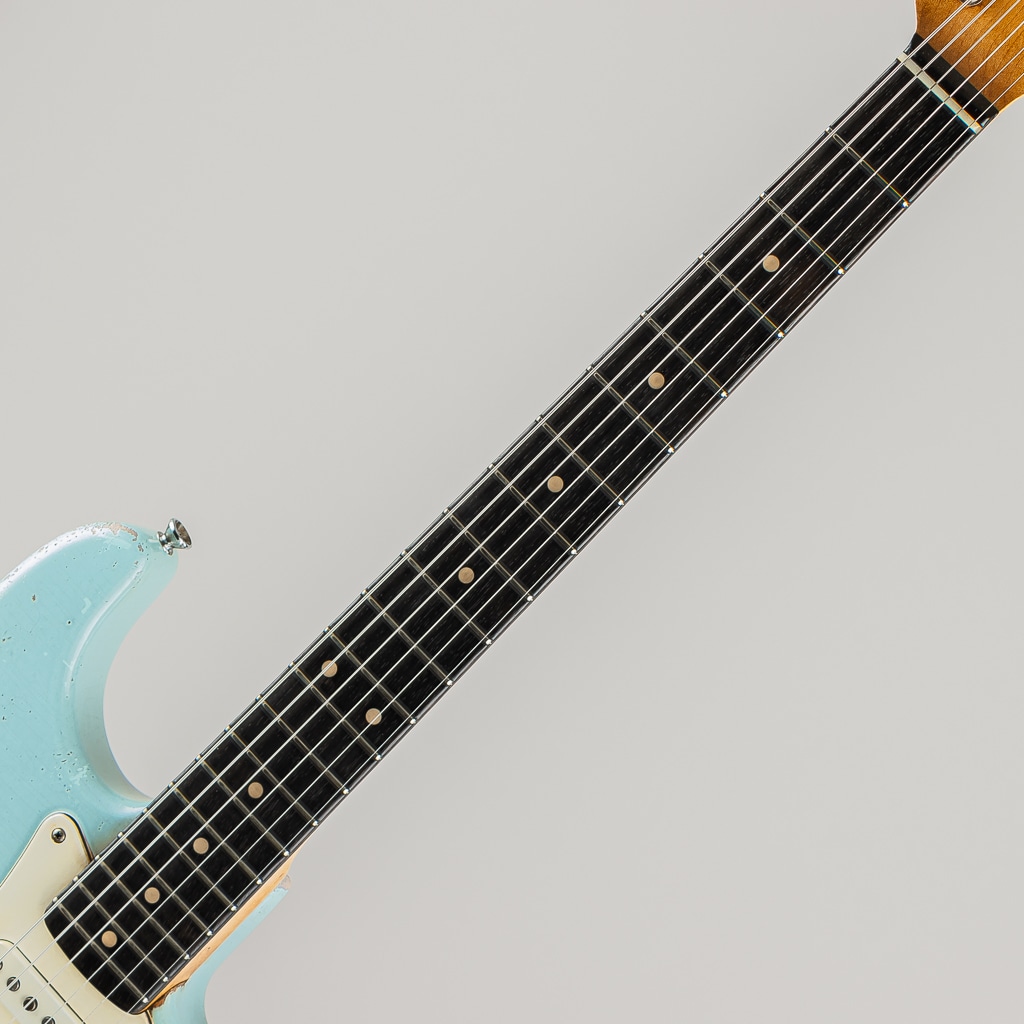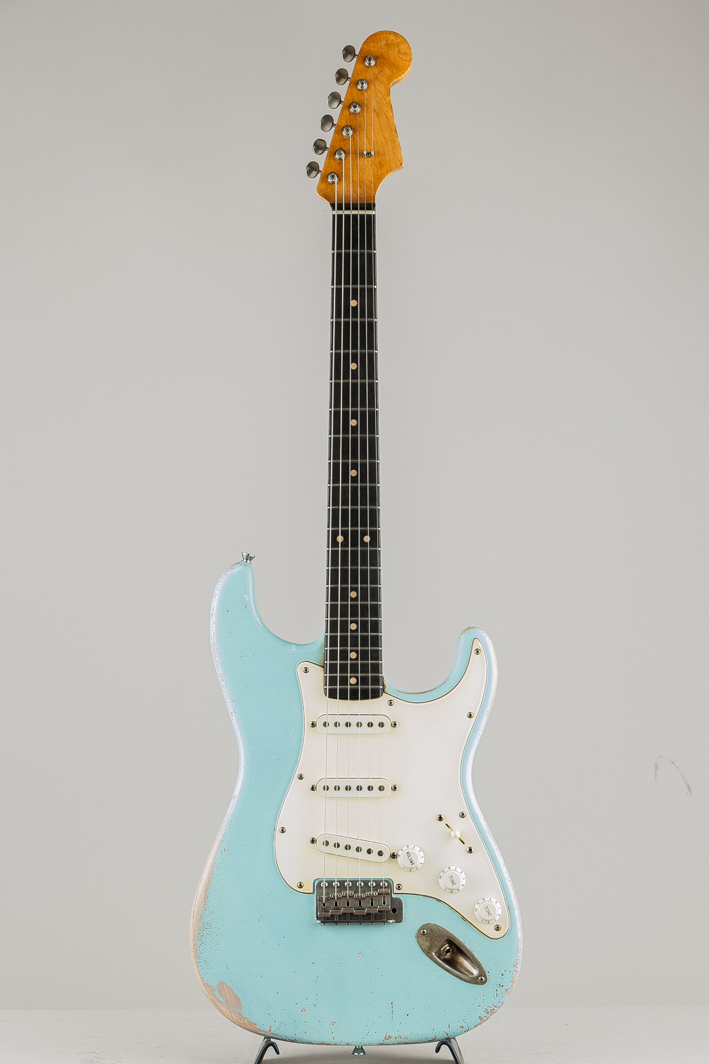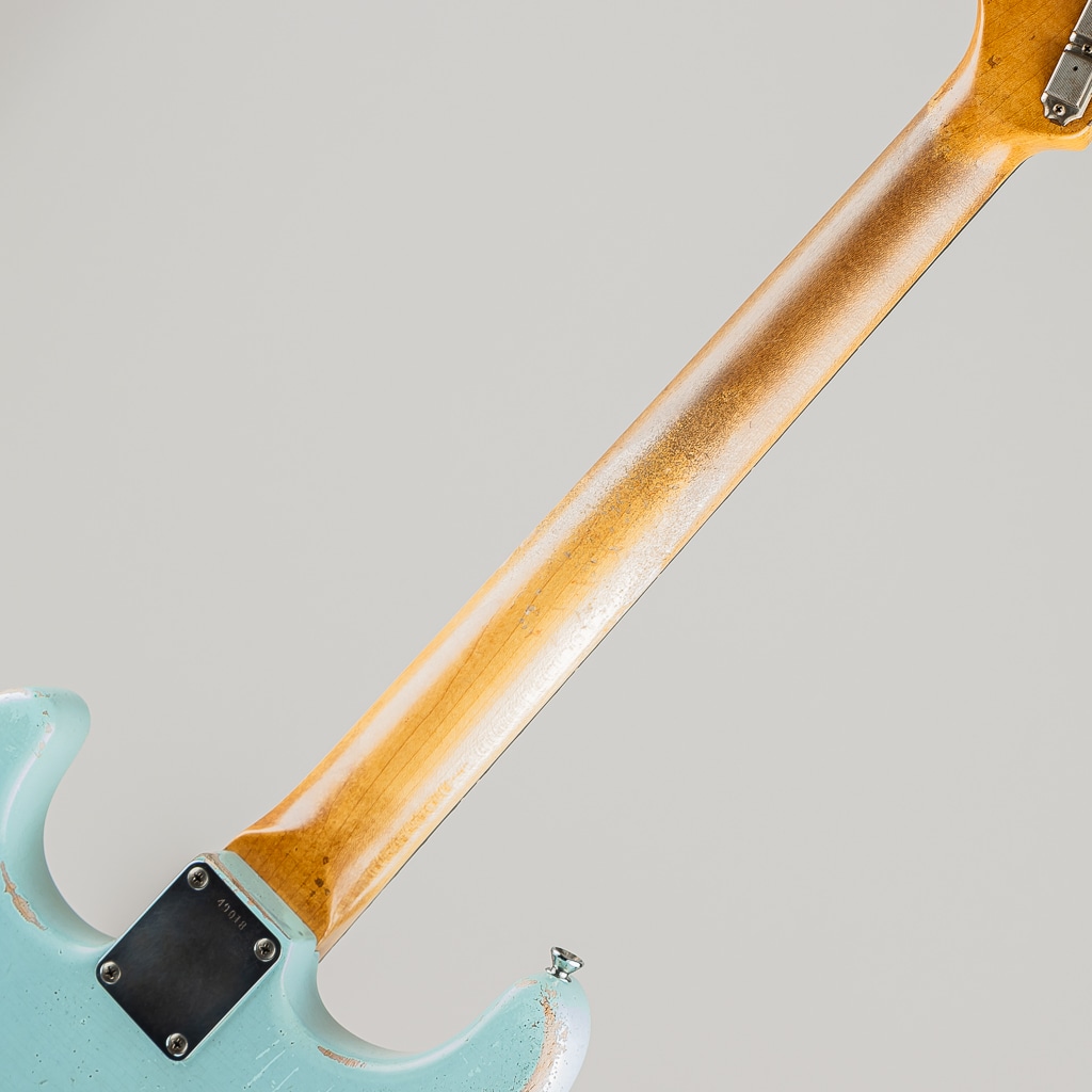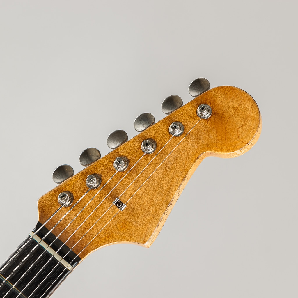 "THE BLACKGUARD BOOK"の著書でもあるNacho Banos氏による、究極のBlackguard Repricaブランド"Nacho Guitars”。年間の製作本数は非常に少なく日本国内への入荷数も限られており、カタログモデルといった概念は無く1本1本個性を宿したギターをワンオフで製作するようなスタイルが貫かれています。同じ年代・特徴のモデルであっても、それぞれが個性を持った外観・弾き心地・そしてサウンドが表現されております。本器は、”Early 60s Contour Body #49018 Heavy Aging Sonic Blue Medium C Neck”。オリジナル・ブラックガードを知り尽くしたNacho氏の経験値を元に製作される、圧巻の完成度を誇る 60’sレプリカの1本。スラブローズウッド指板、メイプルネック、アッシュボディのウッドスペック。オールドを知り尽くしたNacho氏ならではの雰囲気あるヘビーエイジド加工が施されたソニックブルーカラー。ミディアムCシェイプに仕上げられたネックは細すぎず薄すぎない握り心地の良いネックシェイプです。本物さながらの経年したハードウェア、褪色感を再現したエイジングカラーの3plyミントグリーンPGは、その作り込みを愛でるだけでも楽しめる仕上がり。9.5”ラジアス指板、ミディアムフレット、Early60’sスタイルトレモロブリッジ、スチールサドル、Early 60’sスタイルピックアップ。ピックアップセレクターワイヤリングは5wayで、ネックPUトーン、センターPU&ブリッジPUトーンです。ファットで野太いレスポンス、倍音感にあふれる甘いトーンから、ベルトーンの美しいハーフトーンまで、このスタイルに求められるサウンドを遺憾なく発揮してくれます。ストイックにブラックガードを愛したNacho氏ながら、指板ラジアスやピックアップワイヤリングなどはモダンで使いやすいセットをセレクトしており、より実戦向きで使えるビンテージレプリカに仕上げられています。オリジナルビンテージと見まごうほどの雰囲気と仕上がりの話題と人気を集めるスペイン発”Nacho Guitars”。オリジナルハードケース、ブリッジカバー、オリジナル・レザーバック、スペックシート、当機の画像データが入ったUSBとUSB用の木箱、レザーストラップ付属