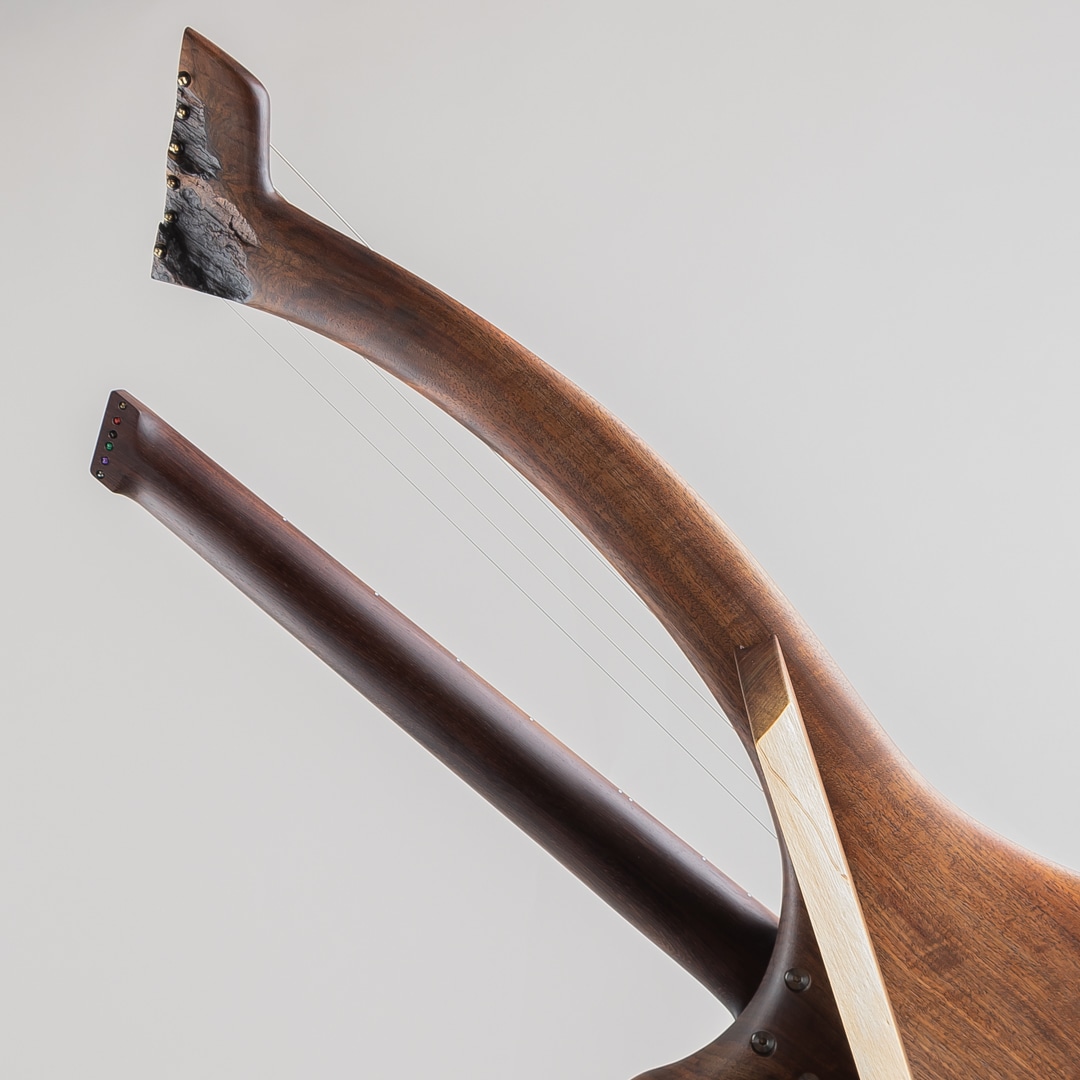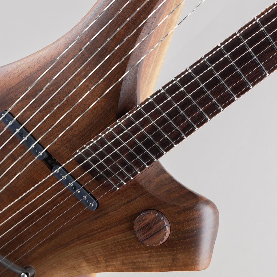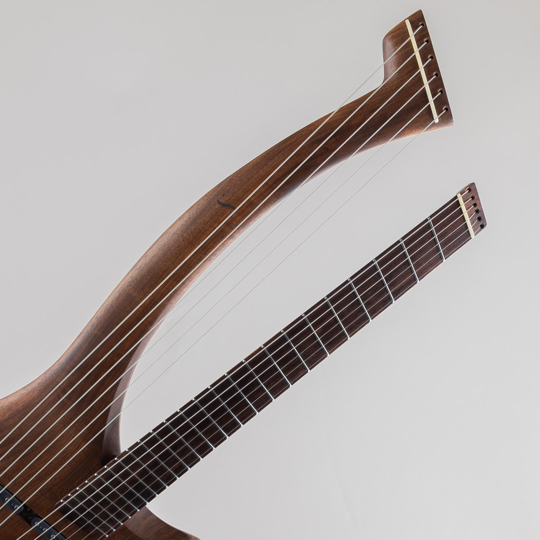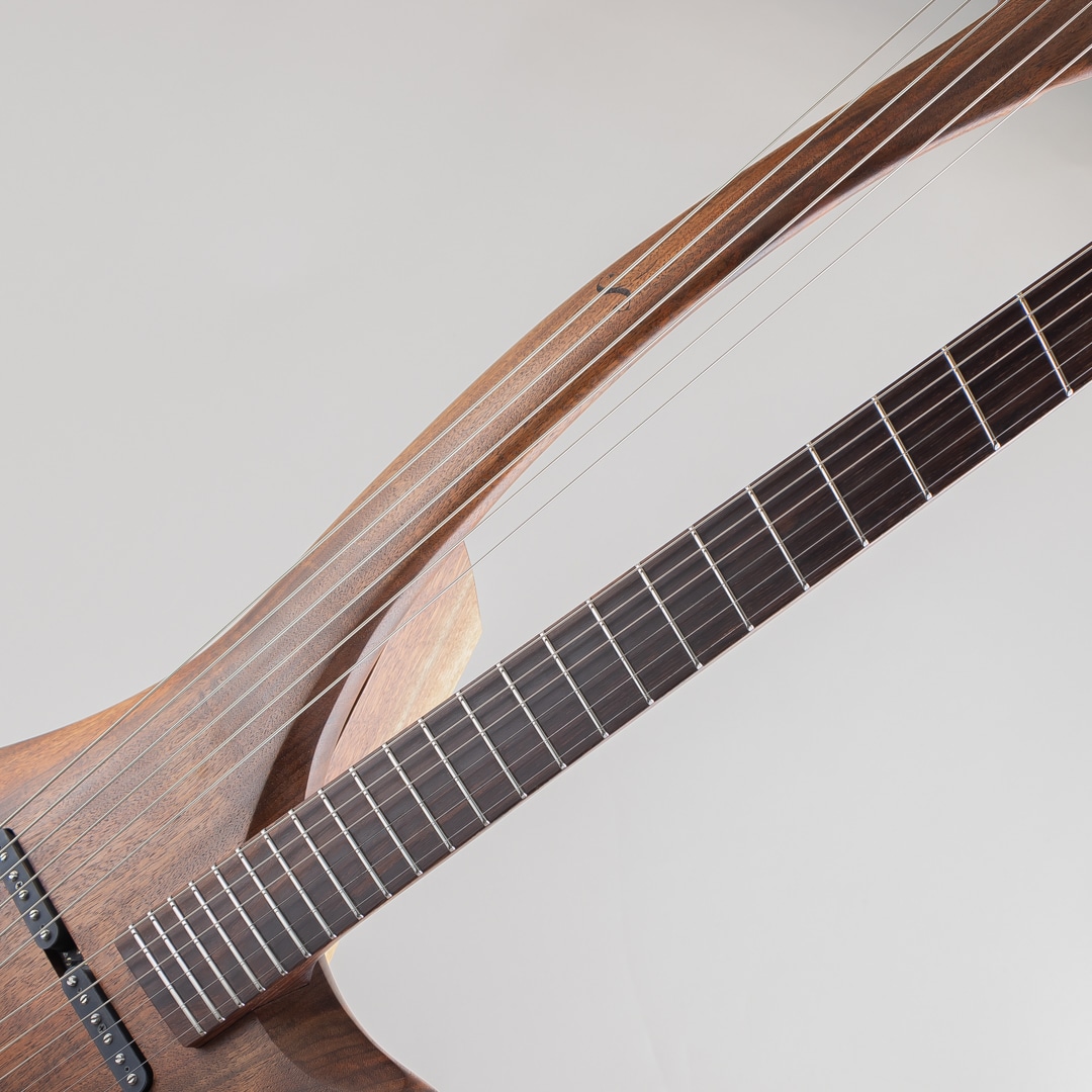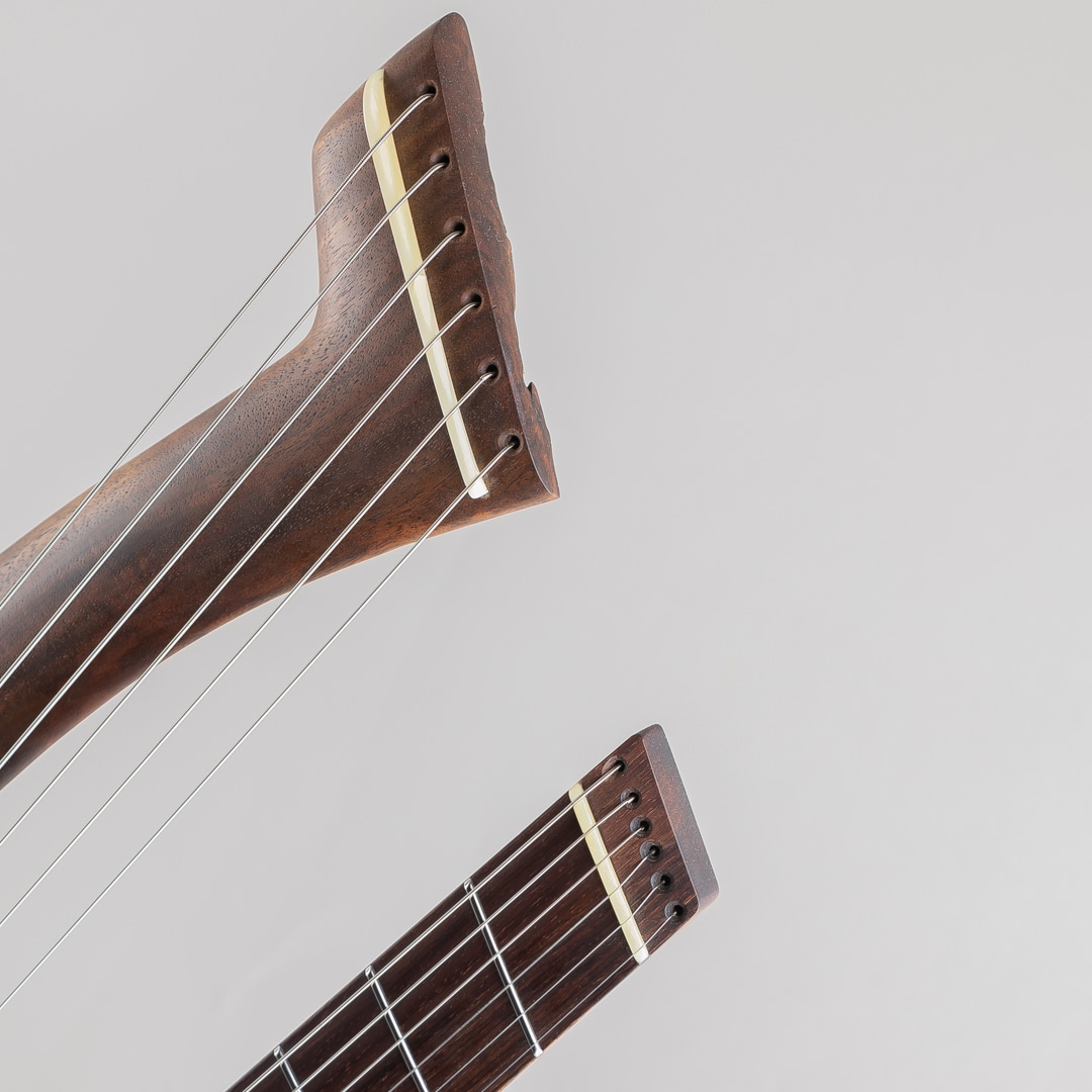 今回入荷の個体は "Singularity" と名付けられた所謂ハープ・ギタースタイルの1本で、ボディ/ハープ部に1枚板のブラックウォルナットを、ギター部ネックにはカボローズウッドを用いマルチ・スケール・フレット仕上げとなっており、ブリッジはこの楽器のために設計された3Dプリントのブロンズ・スチール・ユニットでボディエンドにラップ・ロックチューニングマシン(こちらもMichael Sankey氏のオリジナル設計) を搭載。