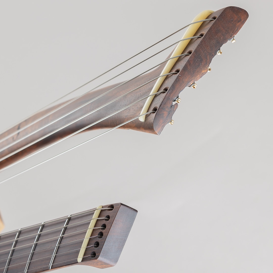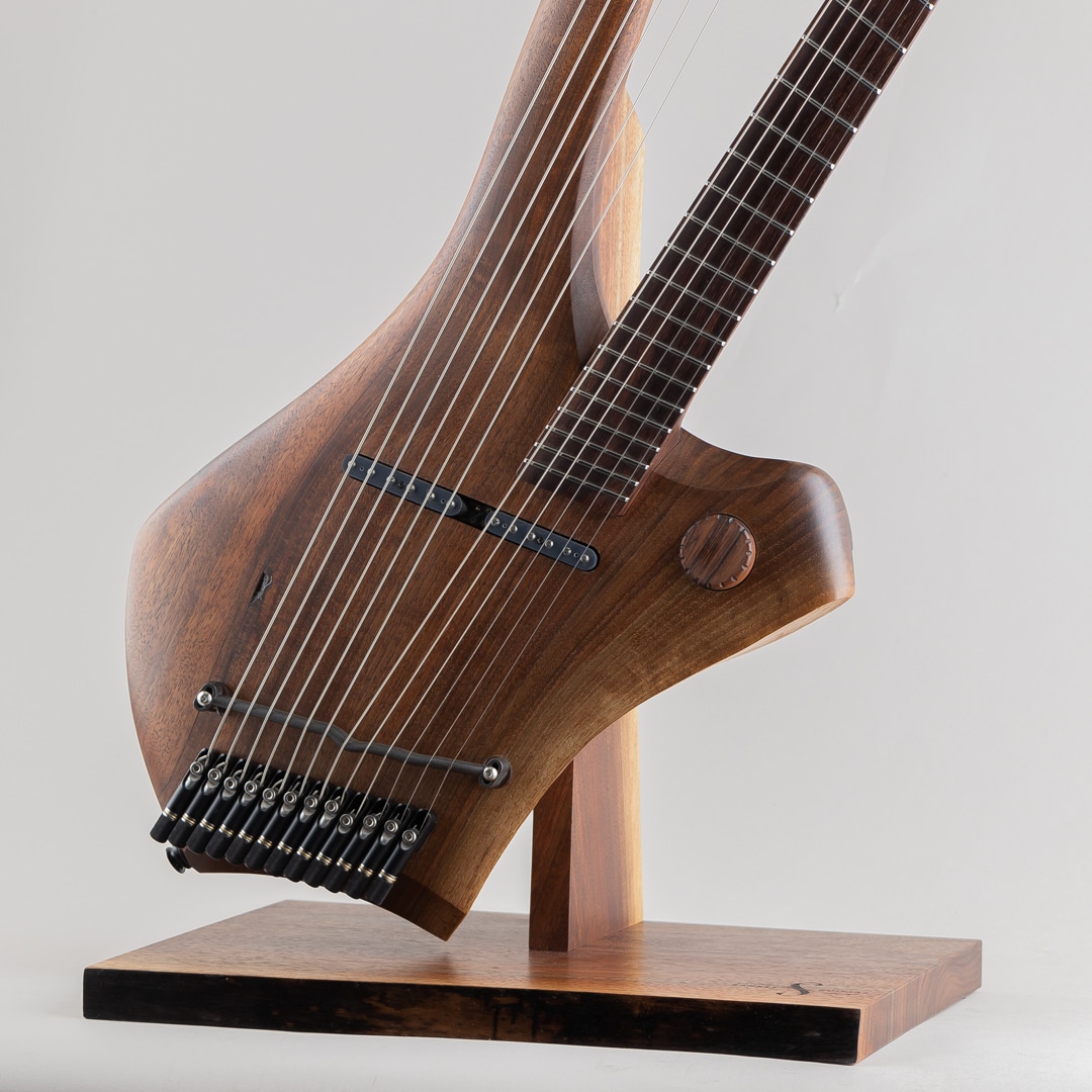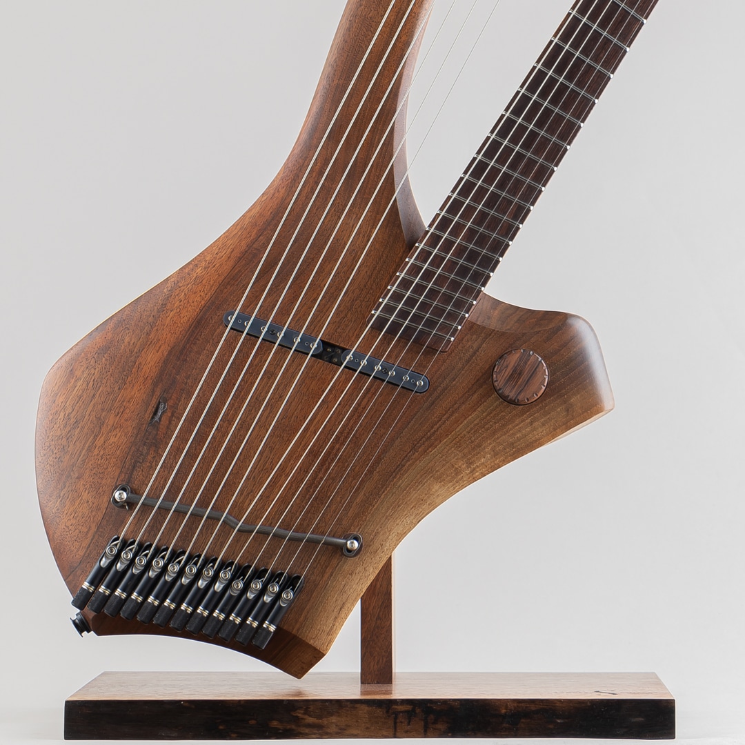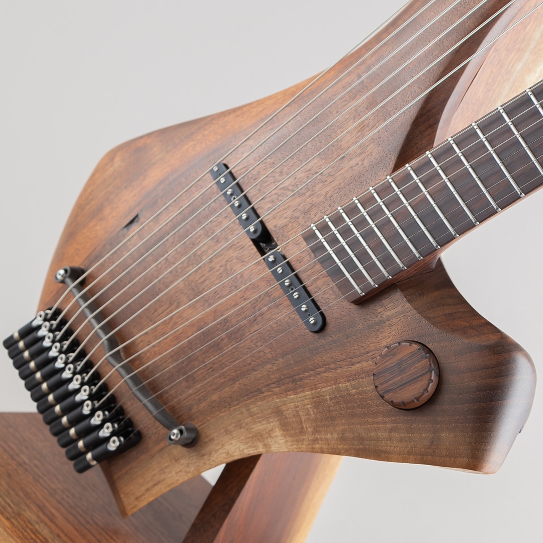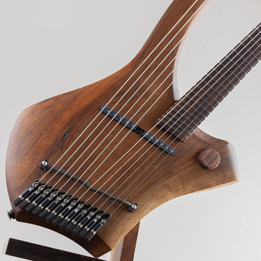 今回入荷の個体は "Singularity" と名付けられた所謂ハープ・ギタースタイルの1本で、ボディ/ハープ部に1枚板のブラックウォルナットを、ギター部ネックにはカボローズウッドを用いマルチ・スケール・フレット仕上げとなっており、ブリッジはこの楽器のために設計された3Dプリントのブロンズ・スチール・ユニットでボディエンドにラップ・ロックチューニングマシン(こちらもMichael Sankey氏のオリジナル設計) を搭載。