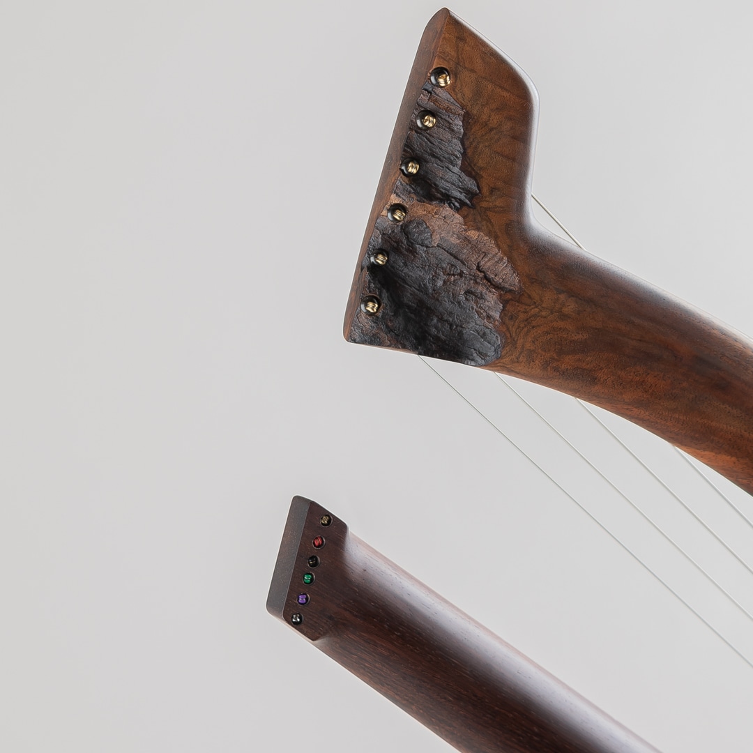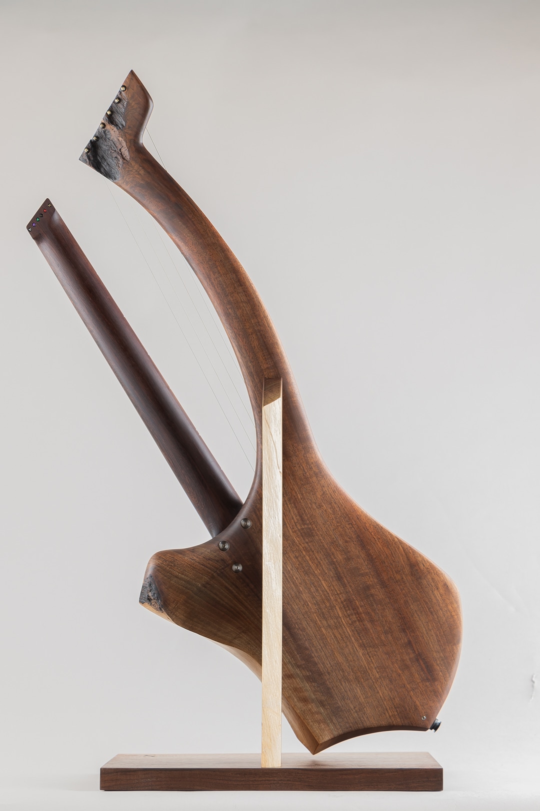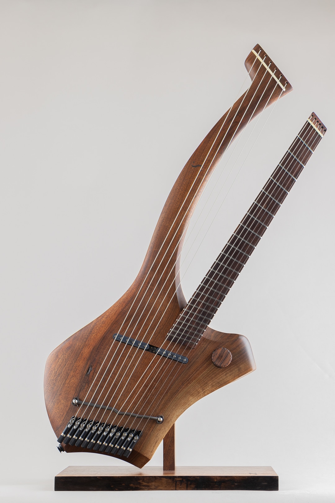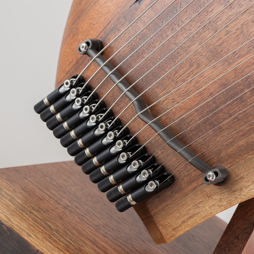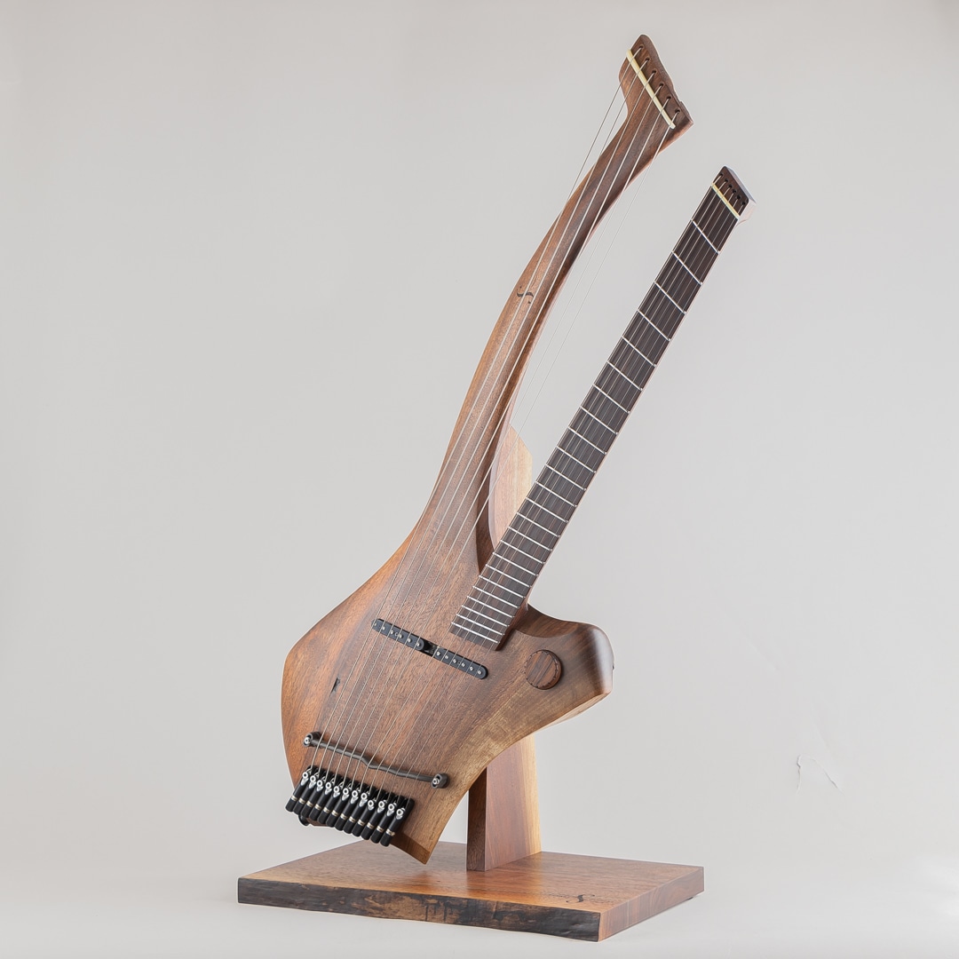 今回入荷の個体は "Singularity" と名付けられた所謂ハープ・ギタースタイルの1本で、ボディ/ハープ部に1枚板のブラックウォルナットを、ギター部ネックにはカボローズウッドを用いマルチ・スケール・フレット仕上げとなっており、ブリッジはこの楽器のために設計された3Dプリントのブロンズ・スチール・ユニットでボディエンドにラップ・ロックチューニングマシン(こちらもMichael Sankey氏のオリジナル設計) を搭載。