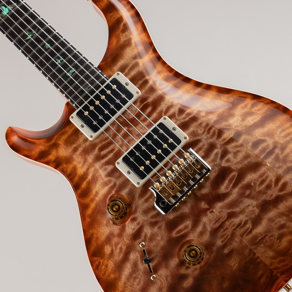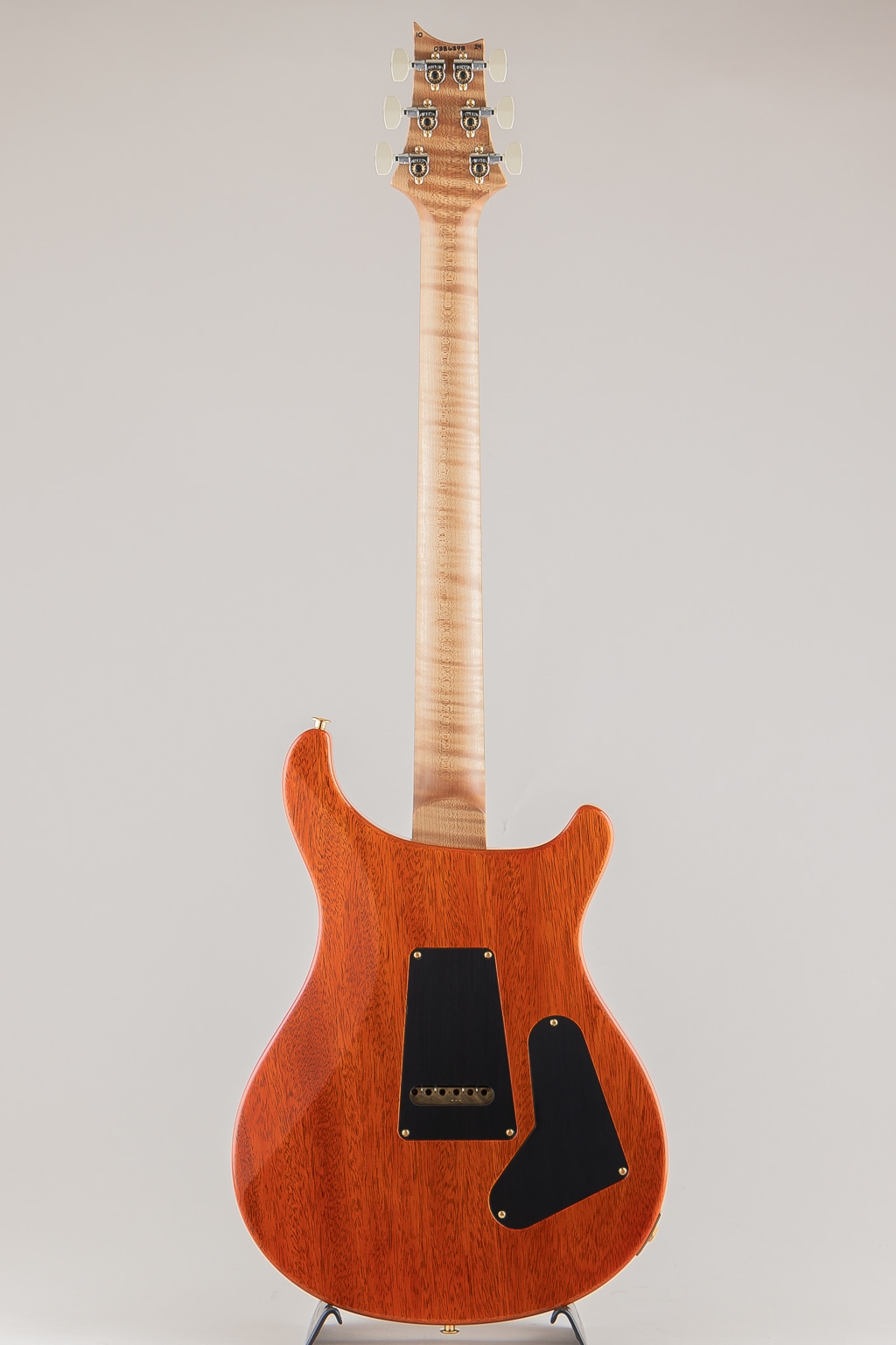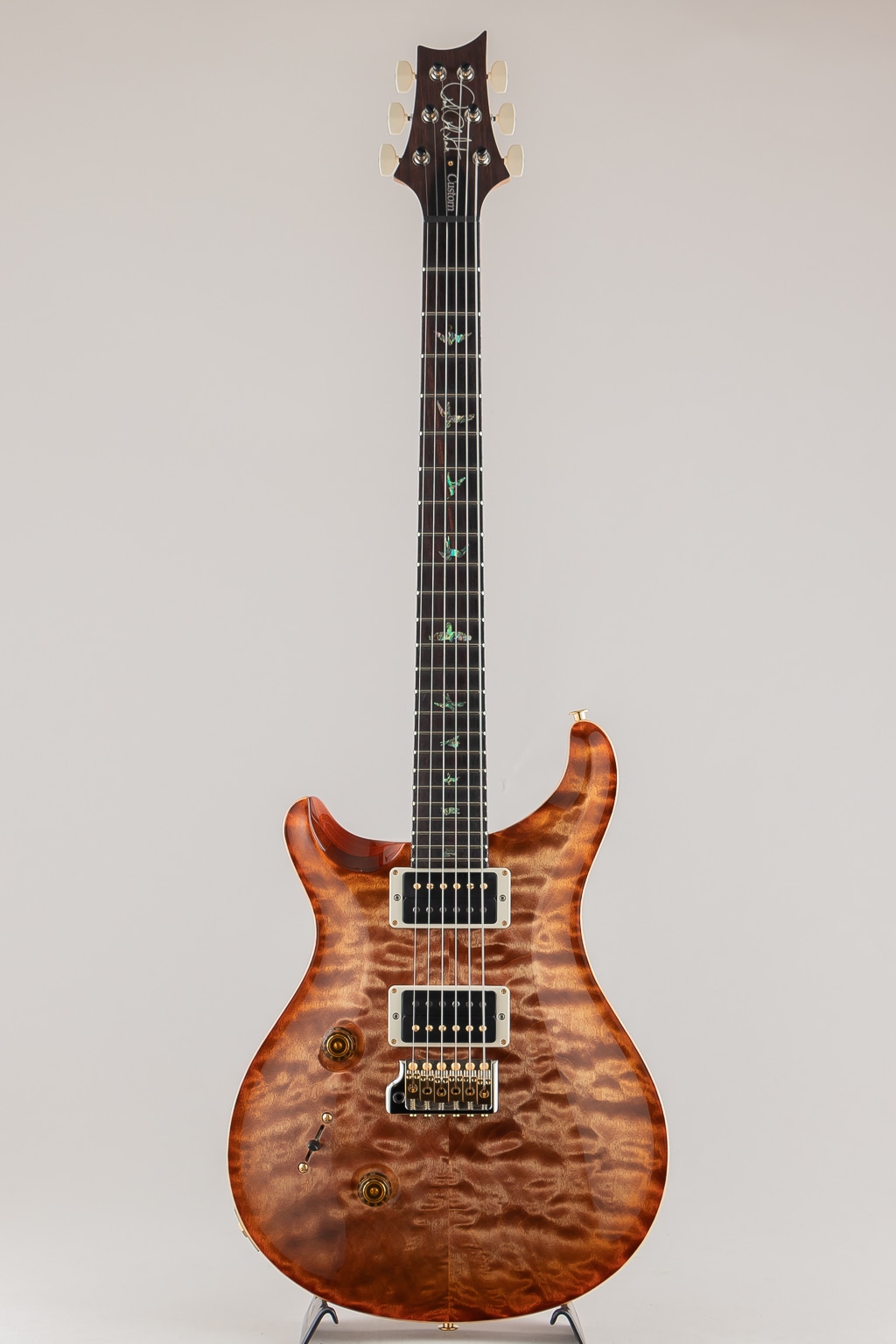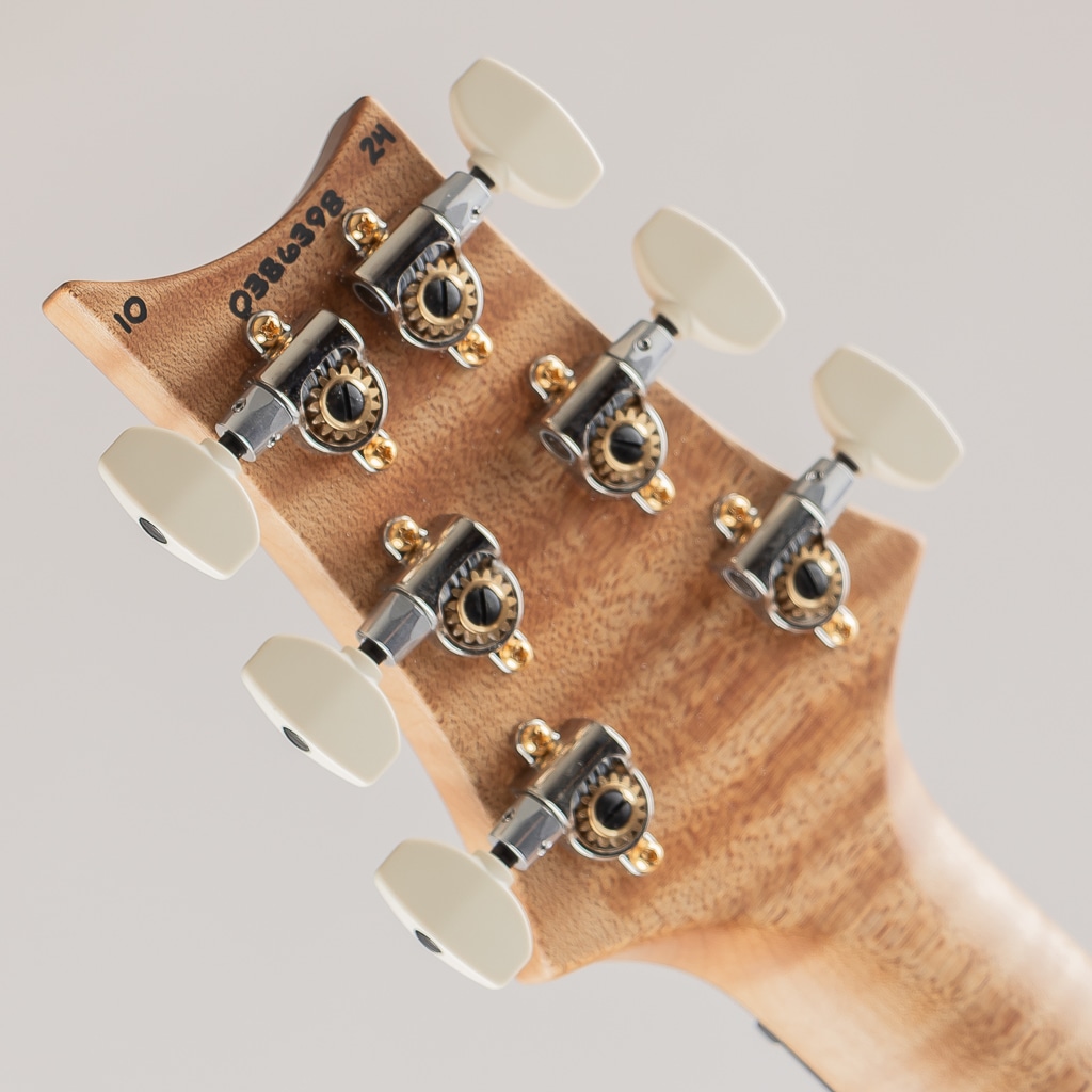 今回入荷のモデルはPRS社のフラッグシップモデル "Custom24" をベースに "Wood Library" ならではの独自のスペックやウッドマテリアルを用いたレフティ仕様の特別な1本。10Topグレードの "Quilt Maple" をトップ材に配しバック材は各カラーに合わせてカラーリングが施された "Mahogany" を採用。