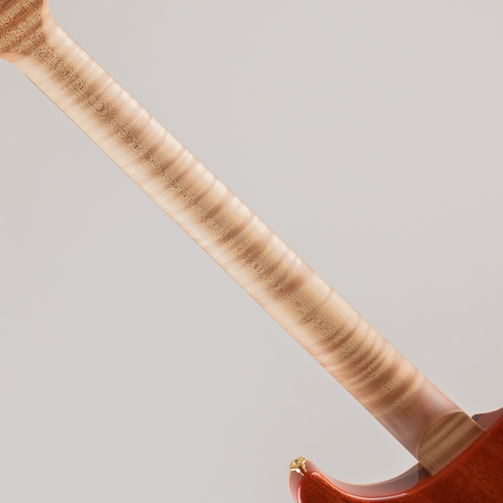 ネック部はトリファイド加工が行われたサテン仕上げの "Flame Maple" に "Rosewood" フレットボードのウッドマテリアル。
