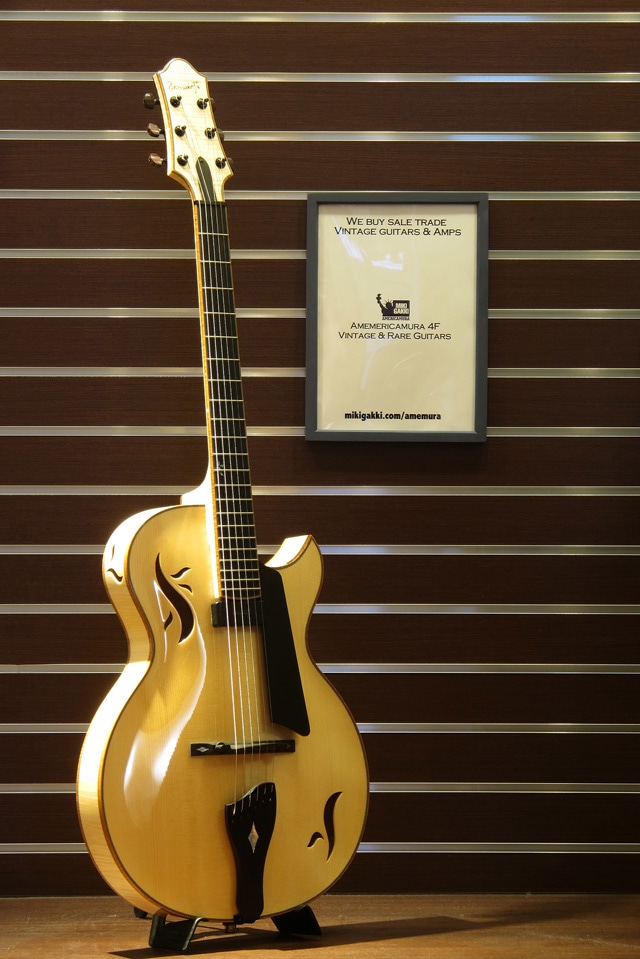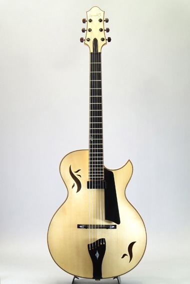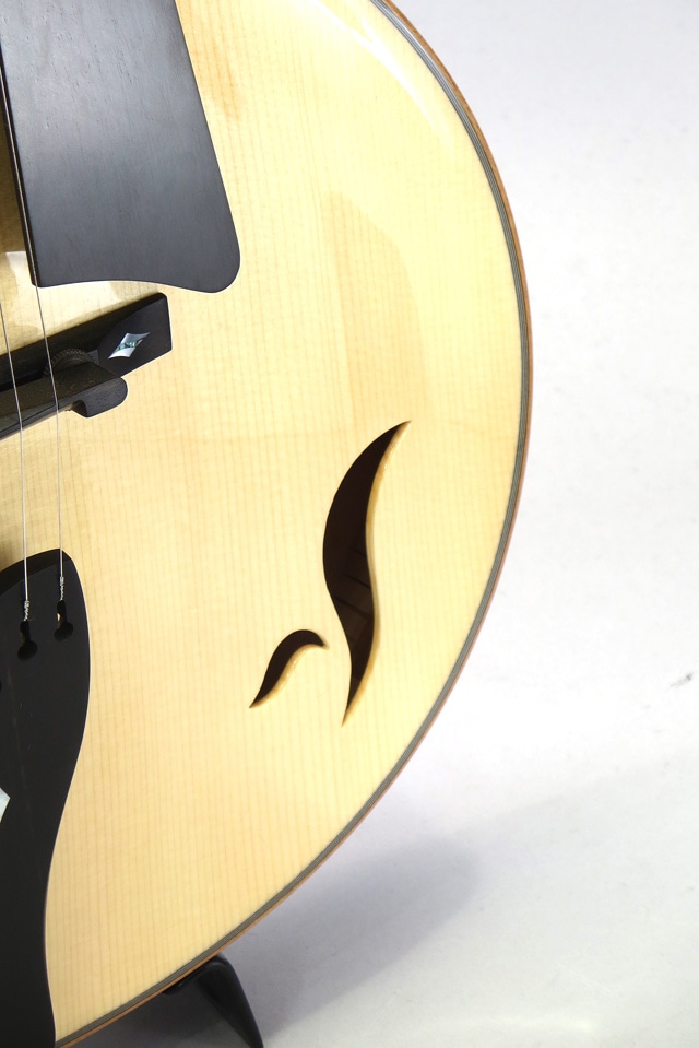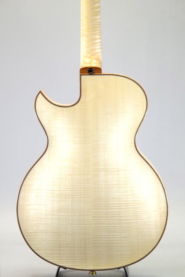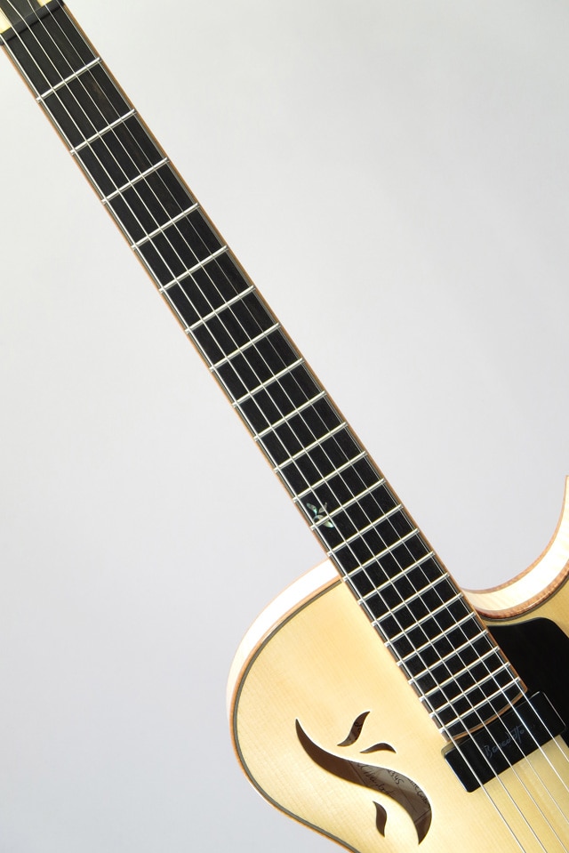 サイズ感を遥かに凌駕した極めて厚みのある音色は、アコースティック楽器としての完成度の高さを感じます。そして全てのポジションにおけるバランス感と直線的で非常に抜けの良いトーン。仕上がりの美しさ、そして音色、楽器としての実用性、いずれも規格外のアーチトップである事は間違いありません。 ぜひ手に取って、その実力をお試し頂きたいギターです。
