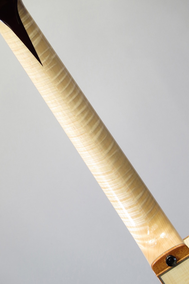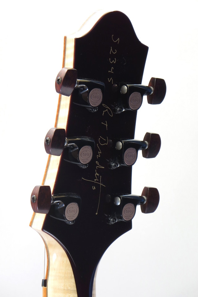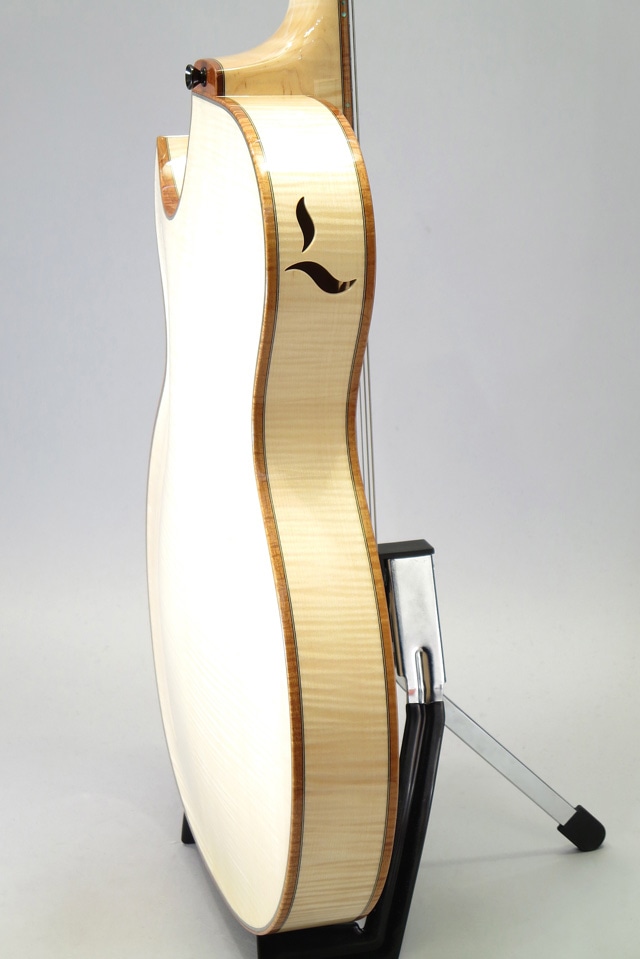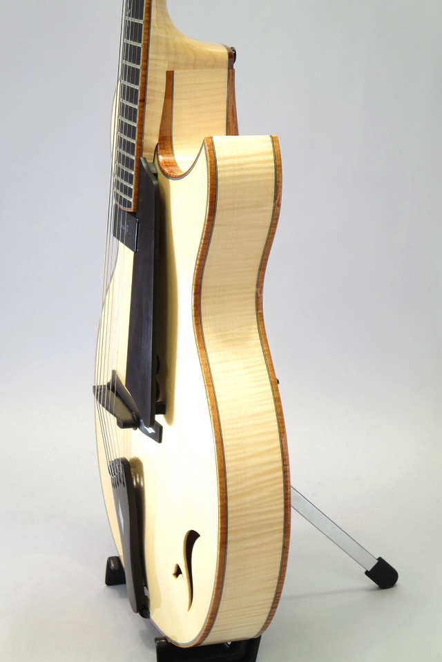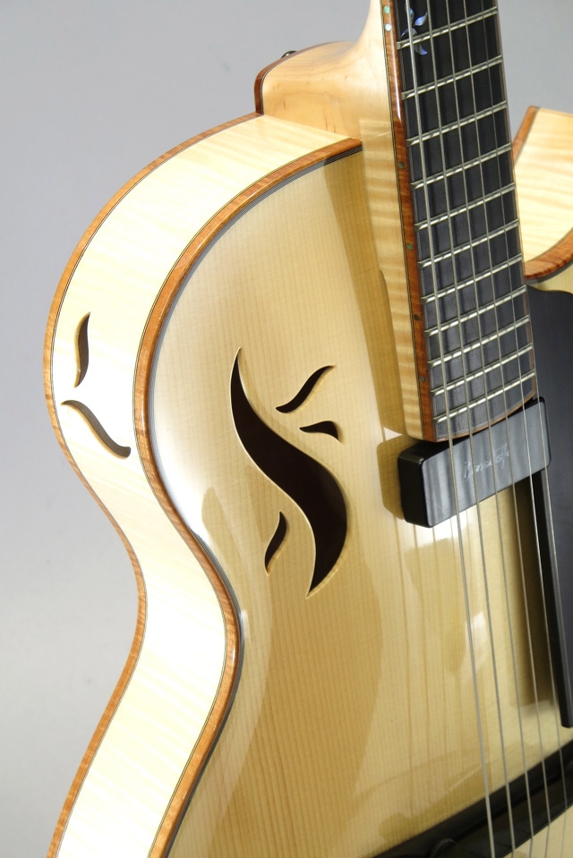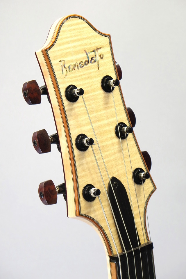 こちらは14 1/2インチ、2/1/4mm厚のコンパクトモデル"Bambino Elite"をベーシックとしたカスタムメイドのワンオフモデル。セレクテットスプルーストップ/セレクテットカーリーメイプルサイド&バック/カーリーメイプル2ピースネック/エボニー指板&ブリッジ/ベネデット"S-6"フローティングピックアップ搭載。 ボディ肩部と1弦側エンド部、そしてサイドにあしらわれた"フローラル(ベネデットの指板インレイにしばしば用いられます)"のデザインをもとに考案されたデザインのサウンドホールにカスタマイズ。ヘッドの突き板にはカーリーメイプルを、ヘッド、ネックからボディを覆うバインディングにはハワイアンコアを、そしてブリッジとテイルピースにはダイアモンドシェイプのインレイを施しております。