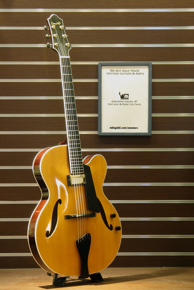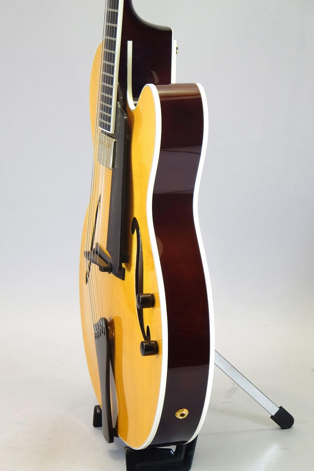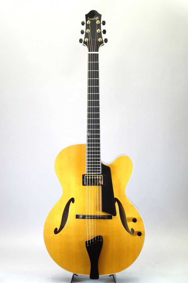 16インチ/63,5mm厚のシンボディー/セレクテットスプルーストップ/セレクテットメイプルサイド&バック、メイプルネック/エボニー指板&ブリッジベネデットオリジナルのピックアップA-6搭載。専用ハードケースが付属致します。