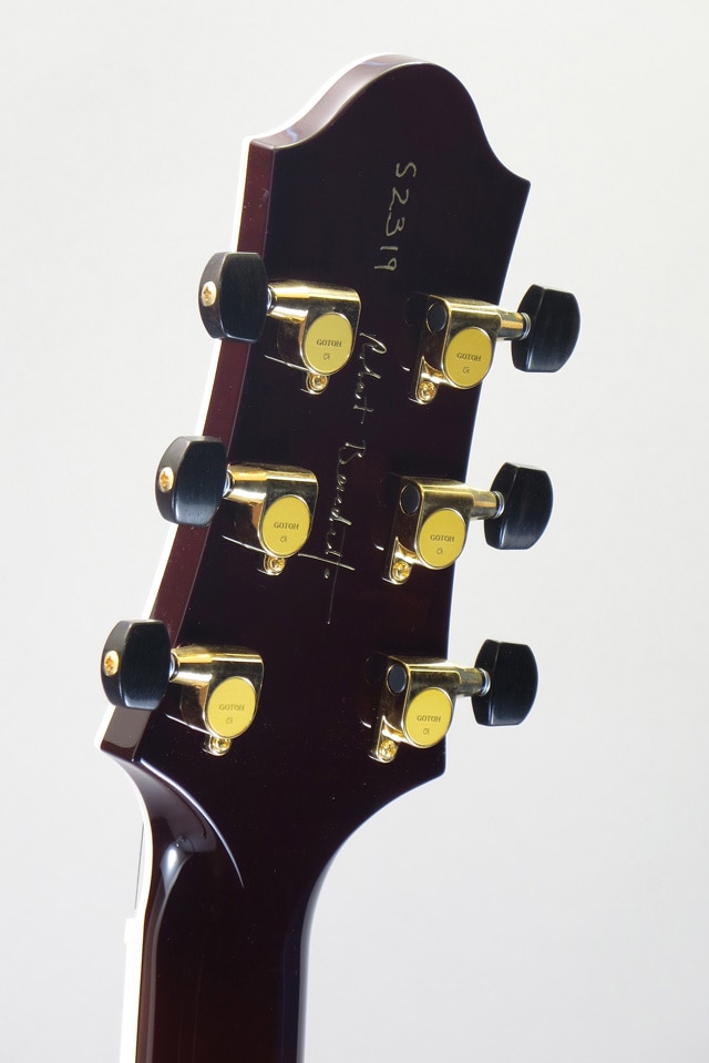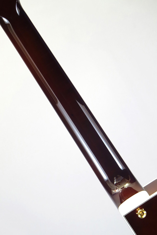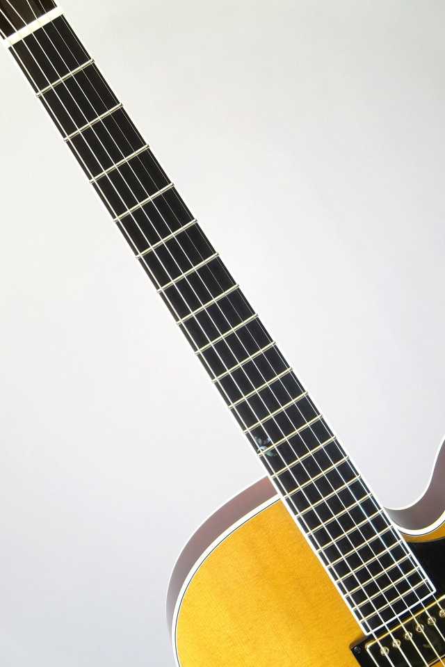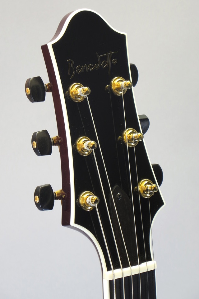 ベネデットらしいエレガントなデザインの16インチモデルですね。絶妙なボディー厚とネックシェイピングは、ストレスを感じさせない抜群の弾き心地です。ローポジションからハイポジションまでの均一な音のバランス、艶のある絶妙な音色、ウォームでありながら芯がしっかりと感じられる抜けの良い音色は所謂ラミネイトものとは一線を画したクオリティ。ワンランク上の16インチモデルです。