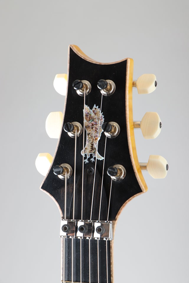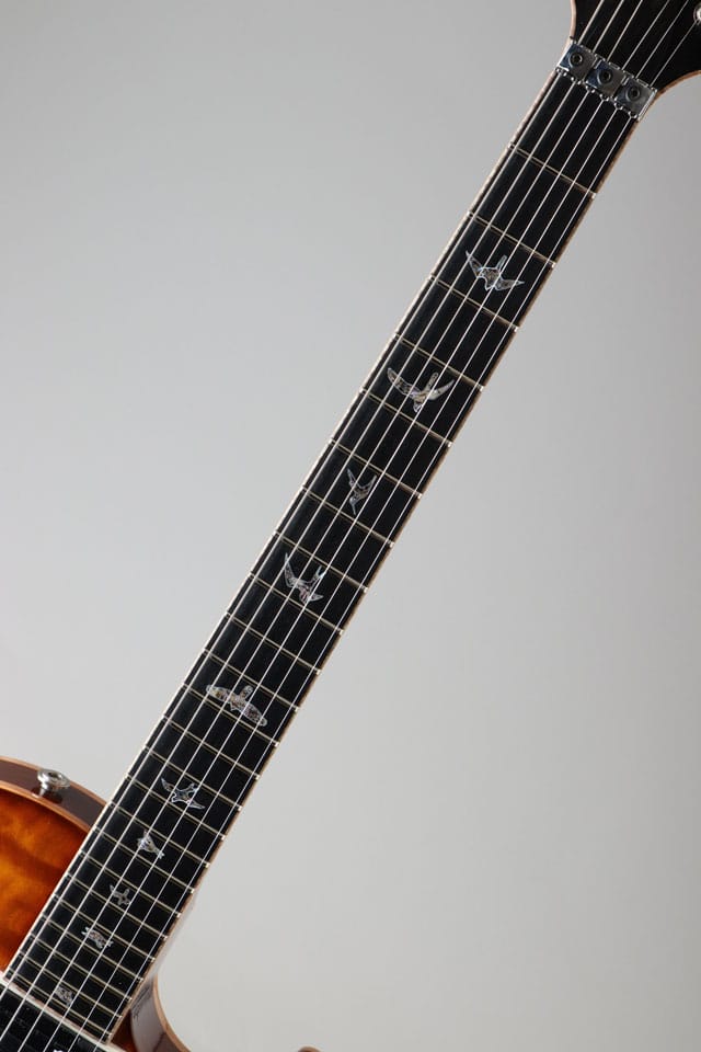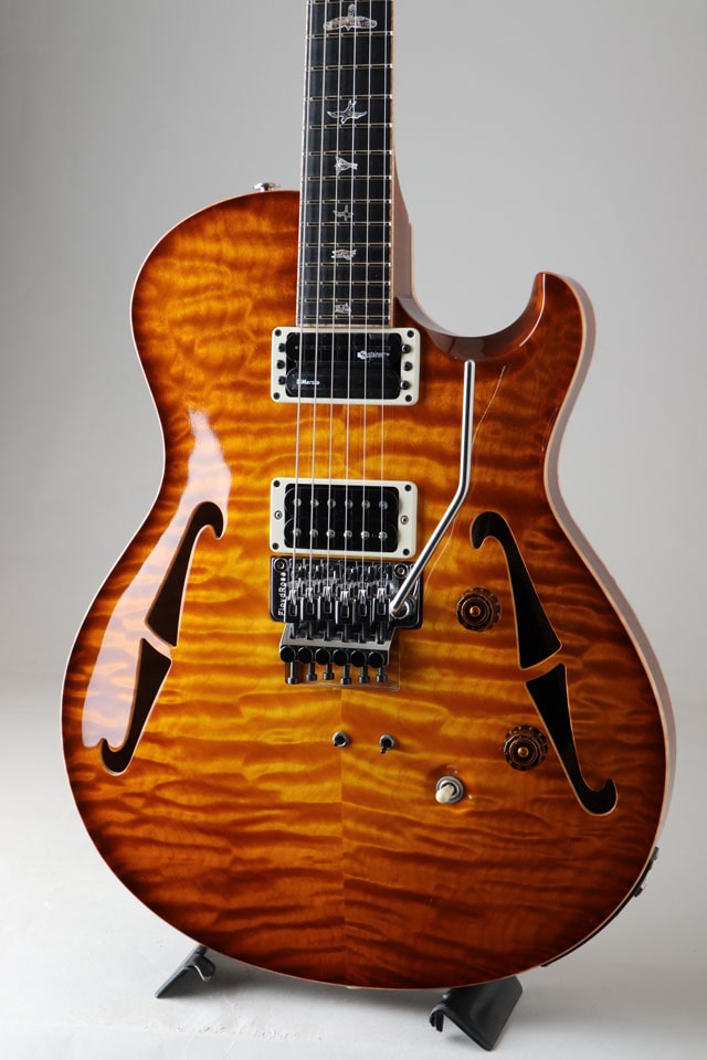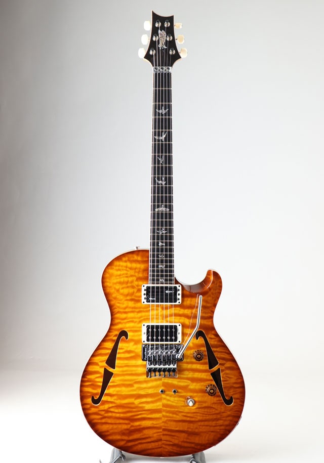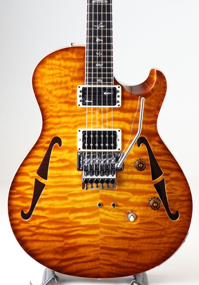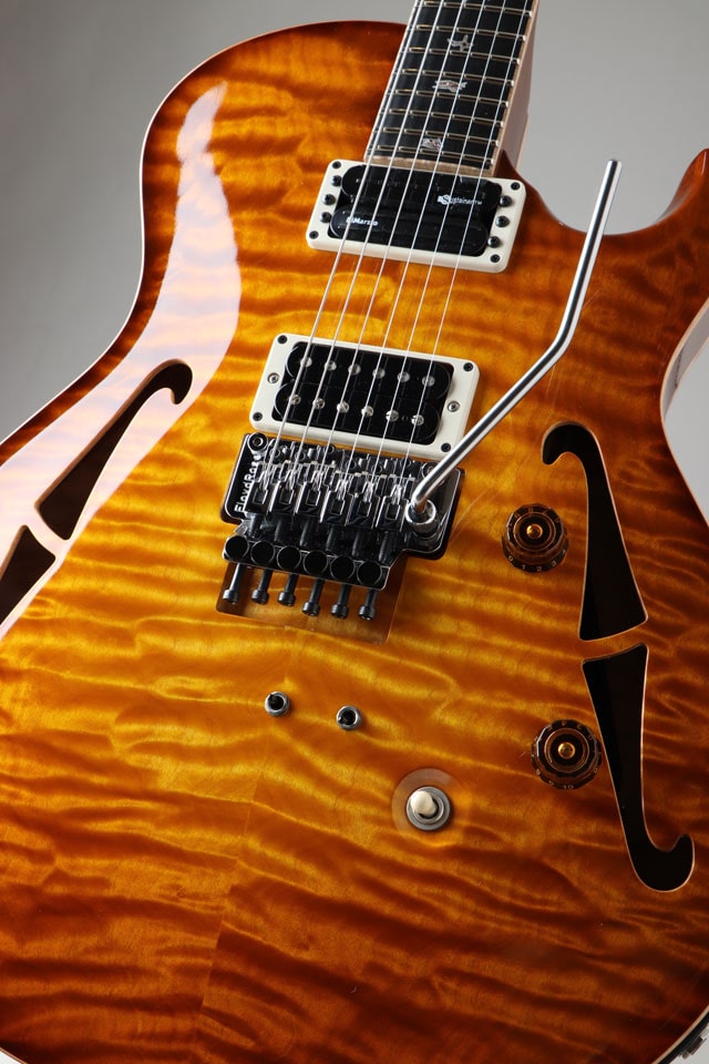 ニールが長年使用しているフロイドローズブリッジを大胆にも搭載したセミアコ構造の当機。まず驚かされるのが生音の迫力で、フルアコ同様のボリュームを持っており、アンプに通した際でもそのアコースティックサウンドは健在で、奥行きのある温かいトーン、その中で埋もれがちなアタック感や輪郭がとても明瞭に出ており、アナログレコードの様な懐かしいトーンは、今までのPRSの中でも類をみません。