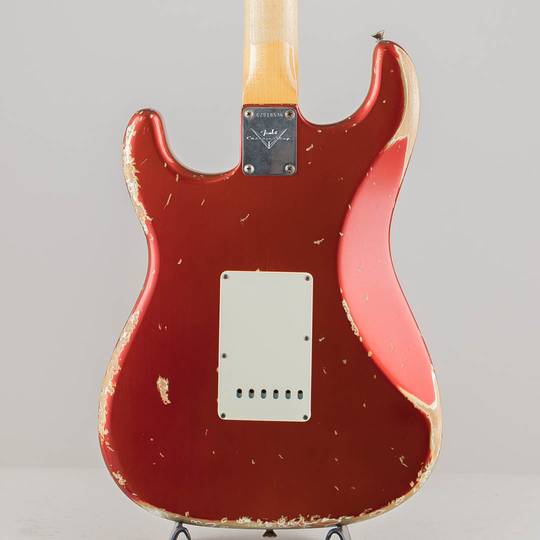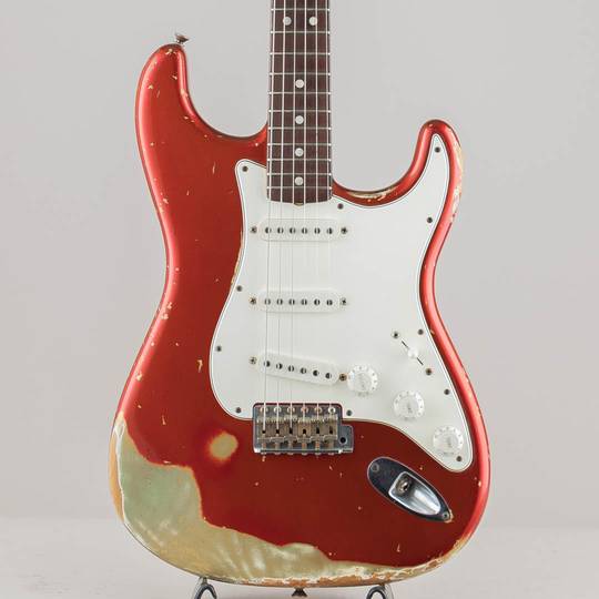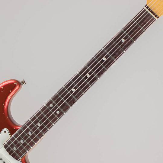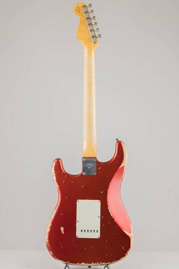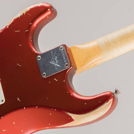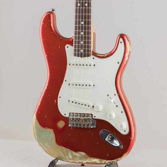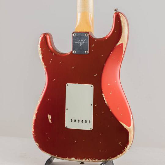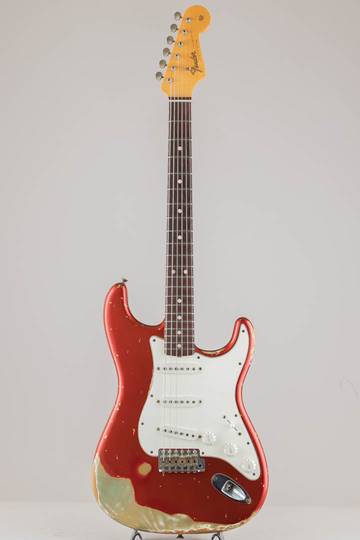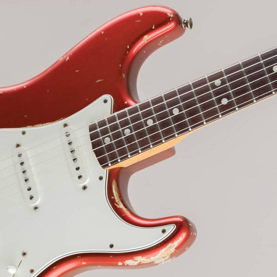 今回入庫の個体はマスタービルダー昇格の年である2011年製作された1本で、ウッドマテリアルはキャンディアップルレッドを纏うアルダーボディに、柾目取りのメイプルネックにラウンドローズウッドフィンガーボードの材構成となっており大胆かつ緻密に施されたレリックワークが目を惹きます。