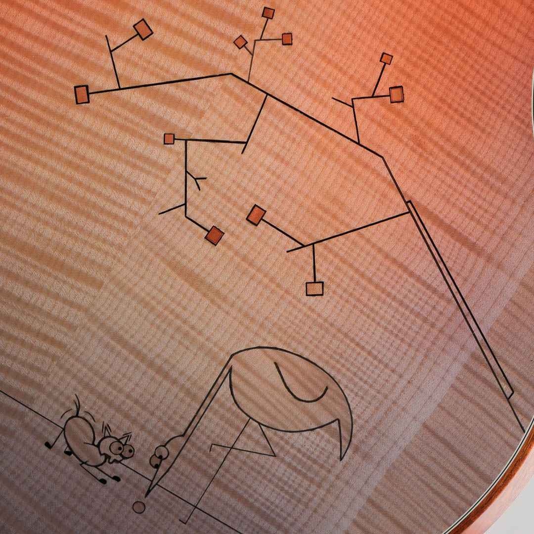 ボディ外周やネック周りに施されたコア材によるバインディング、スキャロップドナット、独特のカーヴを描きフィット感抜群に仕上げられたボディバック、ベベルドコンターなど卓越したスキルが垣間見れる圧巻の完成度を誇り、デザイン面に於いては、マーブルカラーの樹脂と木材の融合した滑らかに仕上げられたピックガードやヘッドストック、メイプル材を嵌め込みボディバックに施された桜やフラミンゴ、チワワをモチーフとした”Stuart Day” ならではのユニークなインレイをお楽しみいただけます。