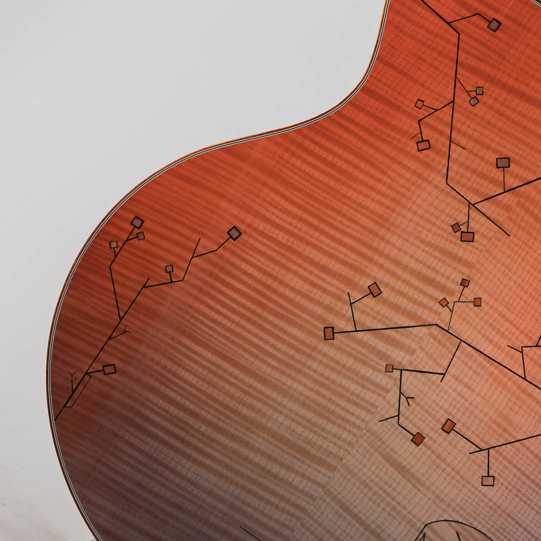 材構成といたしましては、深みのあるサンバーストカラーフィニッシュの端正な木目のソリッド・カーヴド・シトカスプルーストップ、インレイの見え方を計算し生み出されたグラデーションカラーが特徴的な杢目の美しいボスニアン・メイプルバック、サイドはコア/メイプルのラミネート仕様、ブレーシング/センターブロックはマホガニーが用いられており、ネック材に関しましては、シャフトウッド部がホンジュラスマホガニー、指板材がガボンエボニーとなっております。