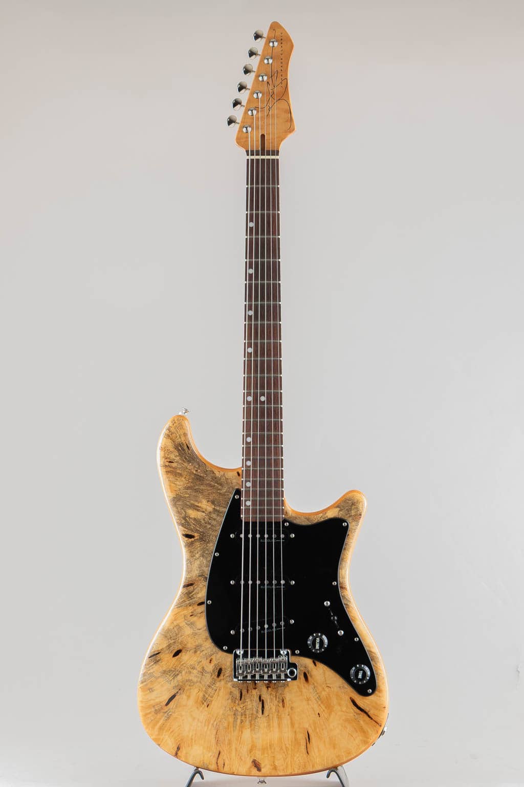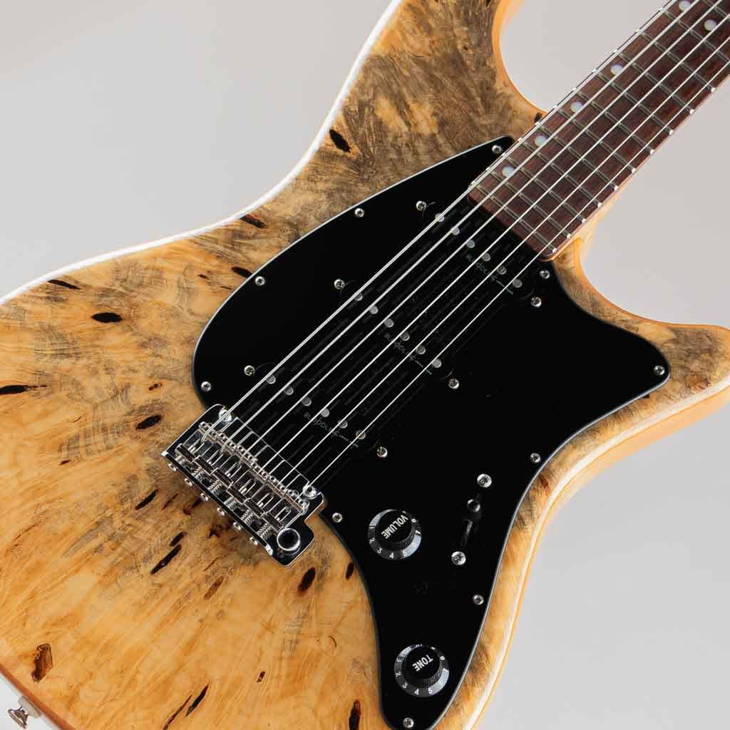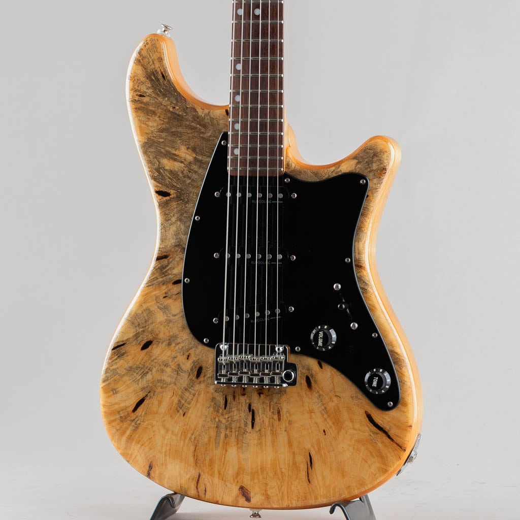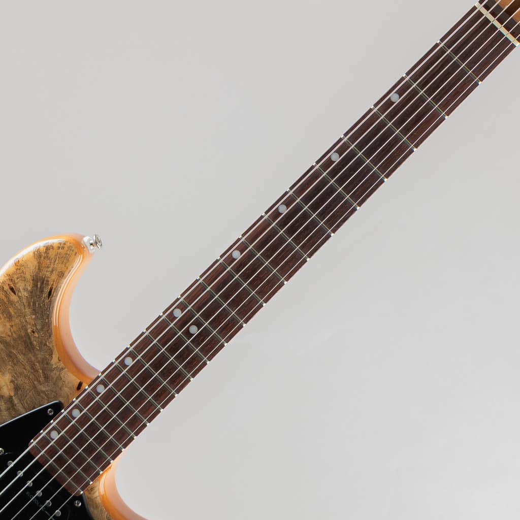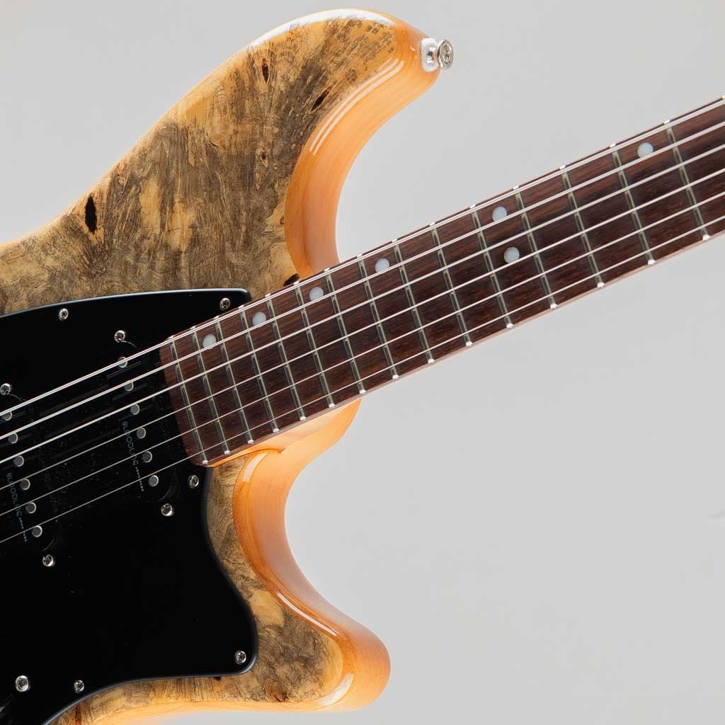 ボディトップには複雑な杢目が目を惹く希少な "Buckeye Burl" を採用しボディバックは伝統的なアルダー、ローステッド加工の施された全体にワイルドなフレイムの浮かぶメイプルネック/スラブ貼りローズウッドフィンガーボードのウッドマテリアル。