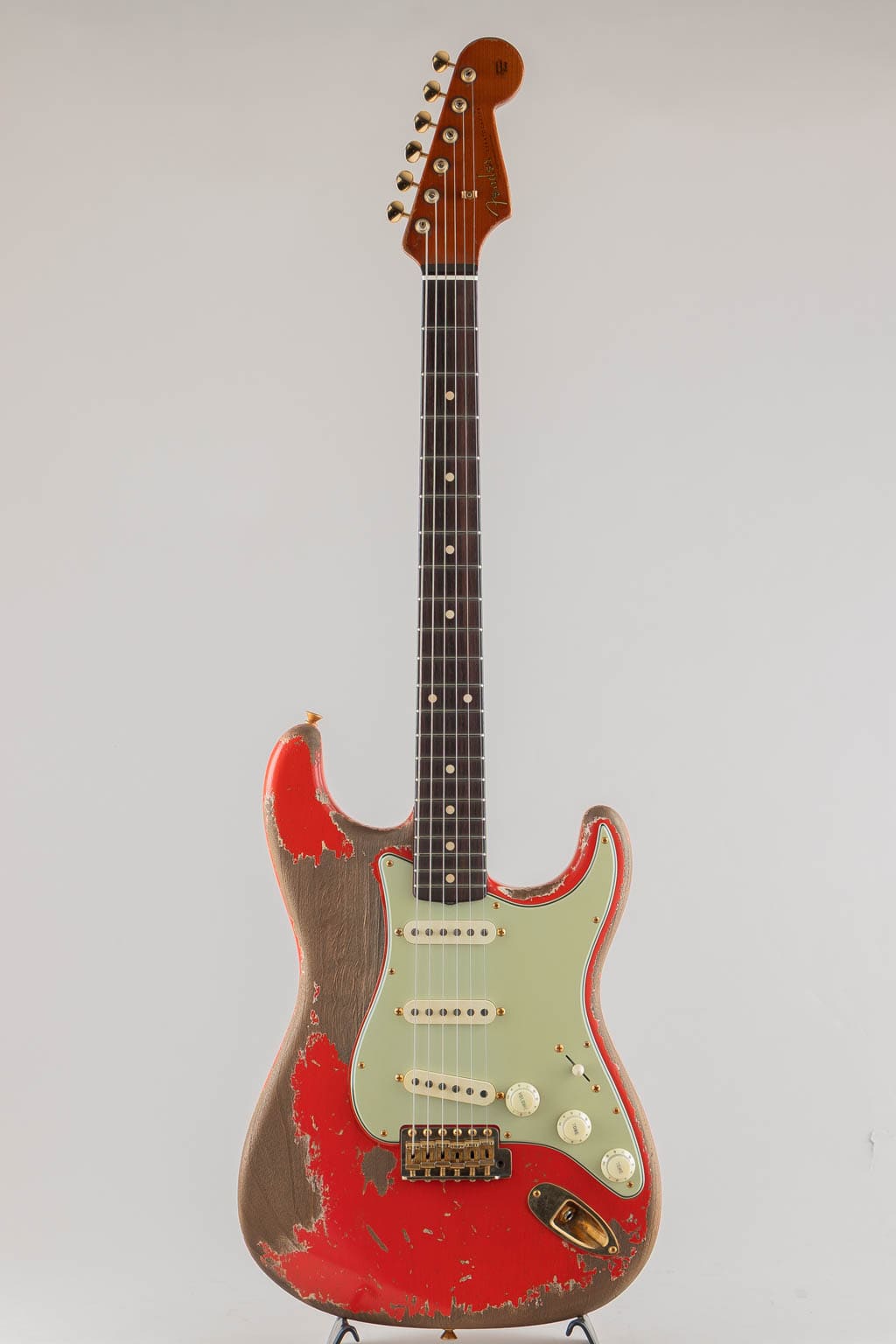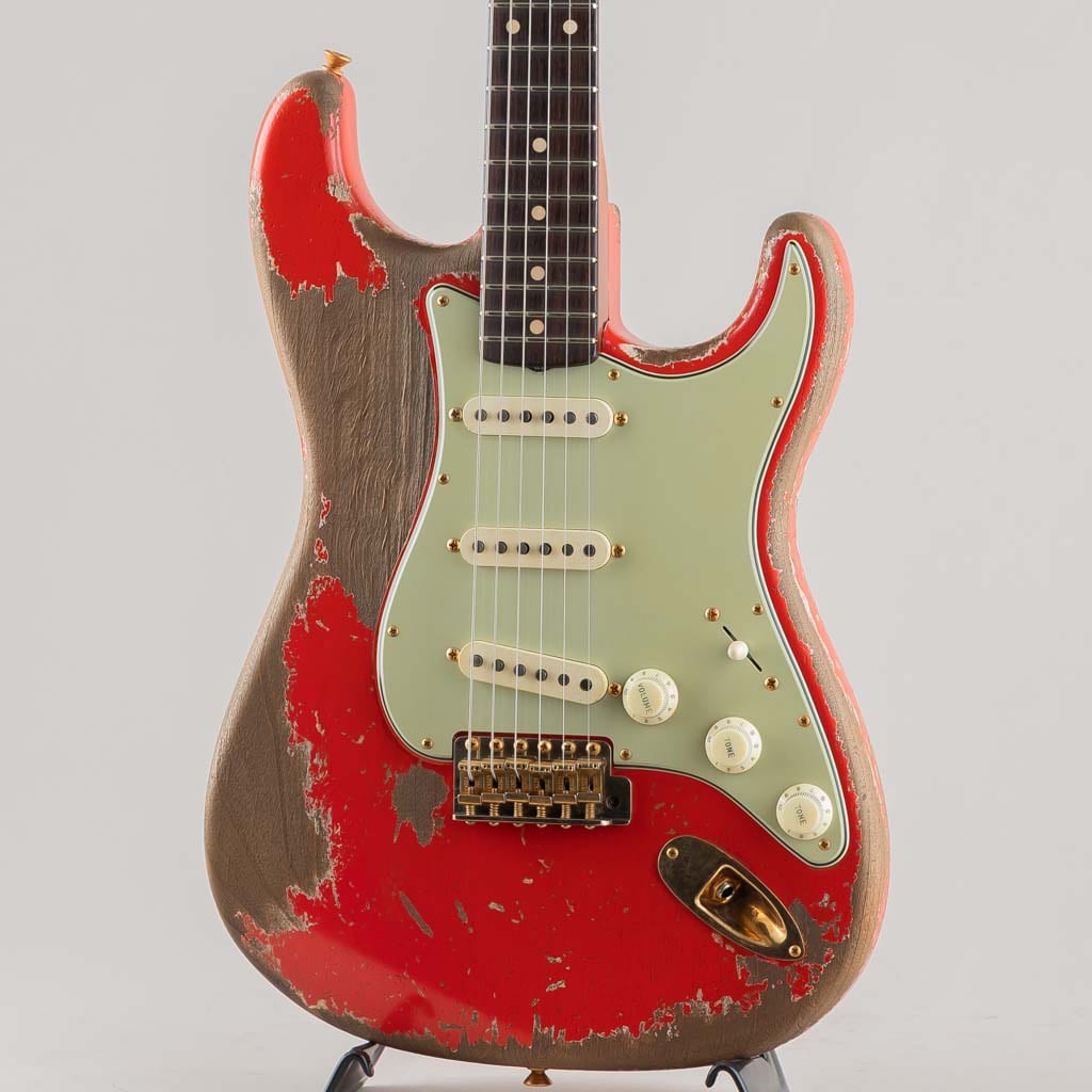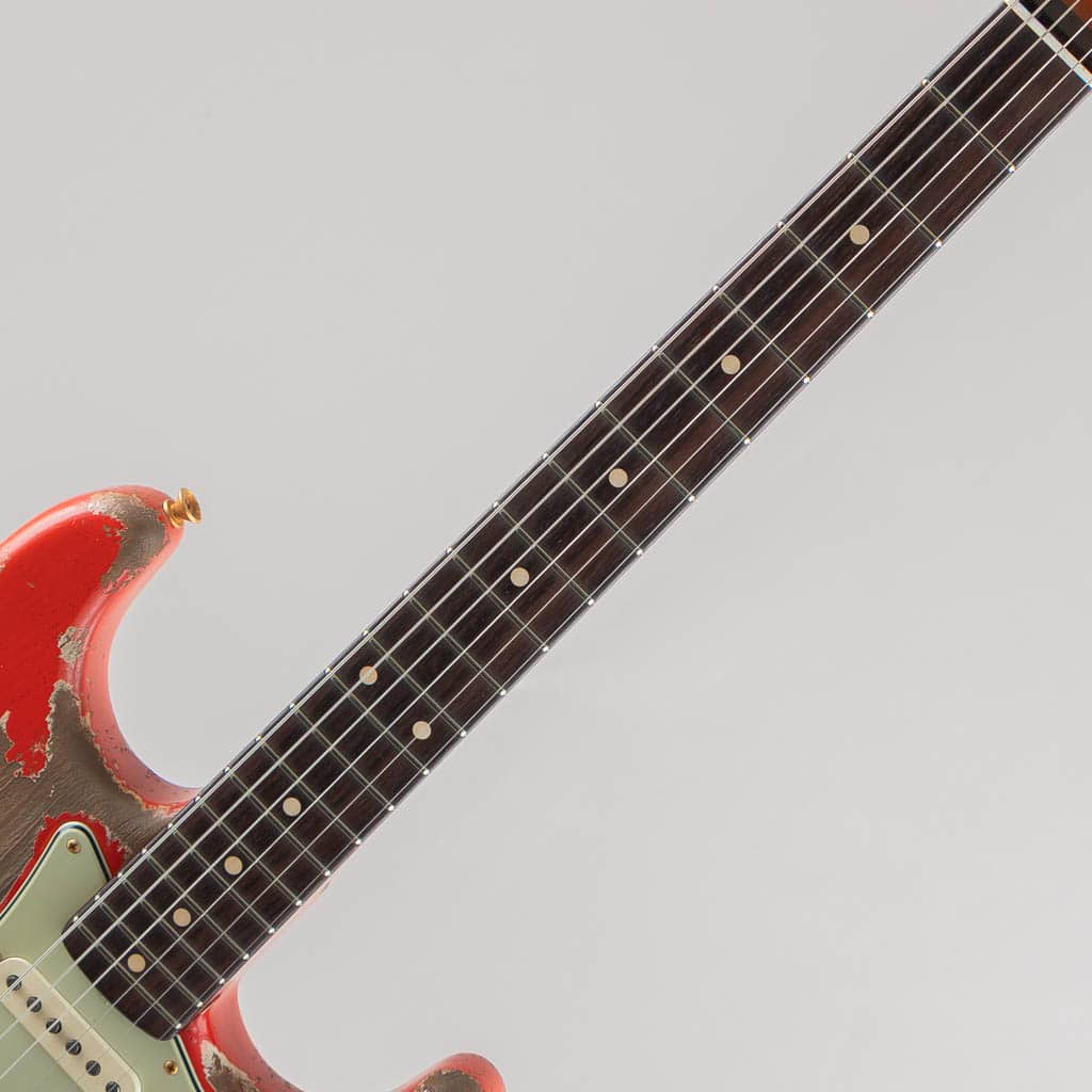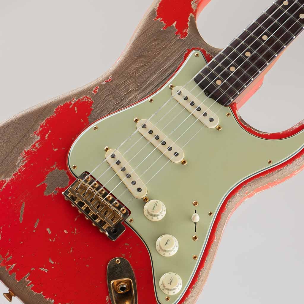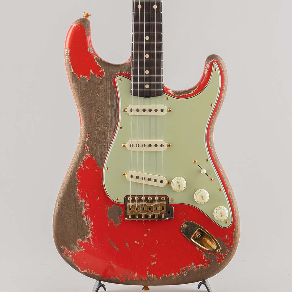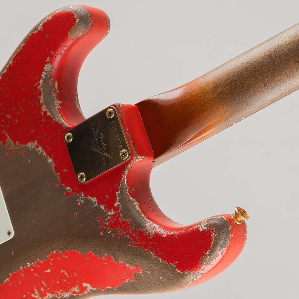 今回入庫の個体は "60 Stratocaster" をベースに製作された1本で、ウッドマテリアルは "Aged Fiest Red" を纏うアルダーボディに、柾目取りのローステッドメイプルネック / スラブ貼りローズウッドフィンガーボードの材構成となっており大胆かつ緻密に施されたレリックワークが目を惹きます。