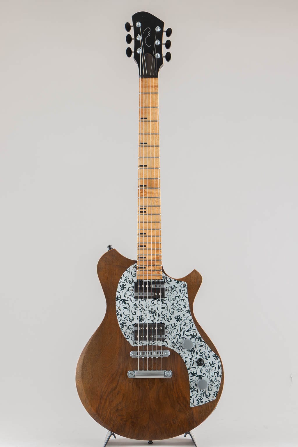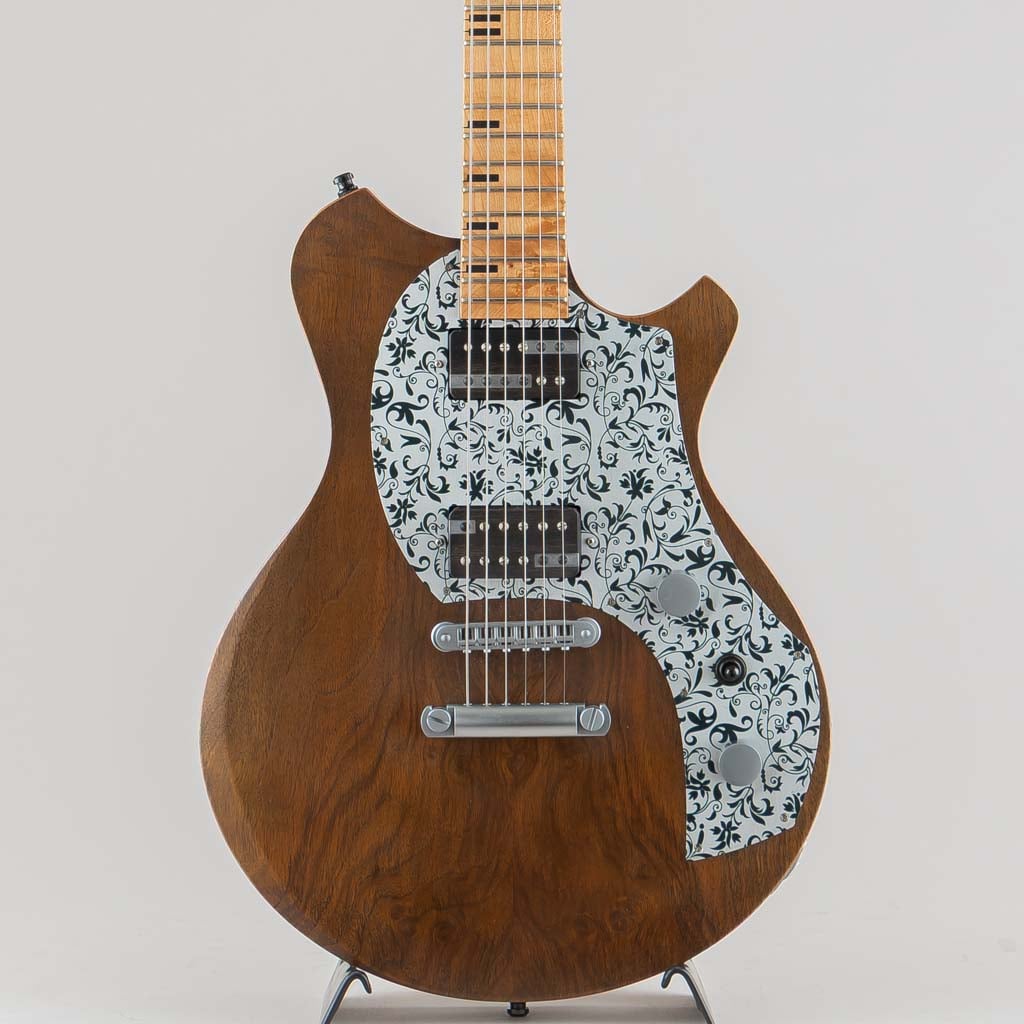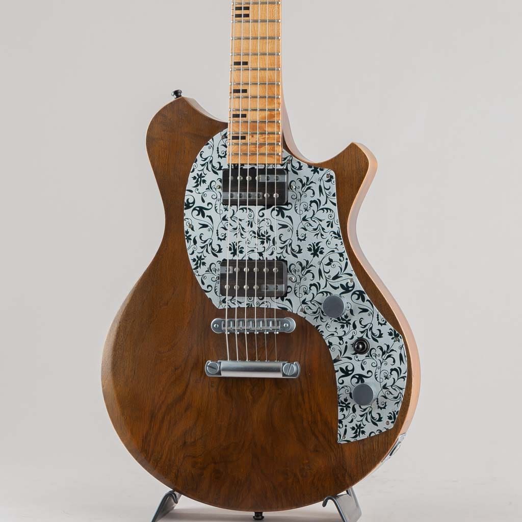 ブックマッチのヨーロピアンウォルナットをボディトップに配し、ボディバックにはチェンバー加工が施されたマホガニー、ネックは貼りメイプル仕様のメイプルネックが採用されております。