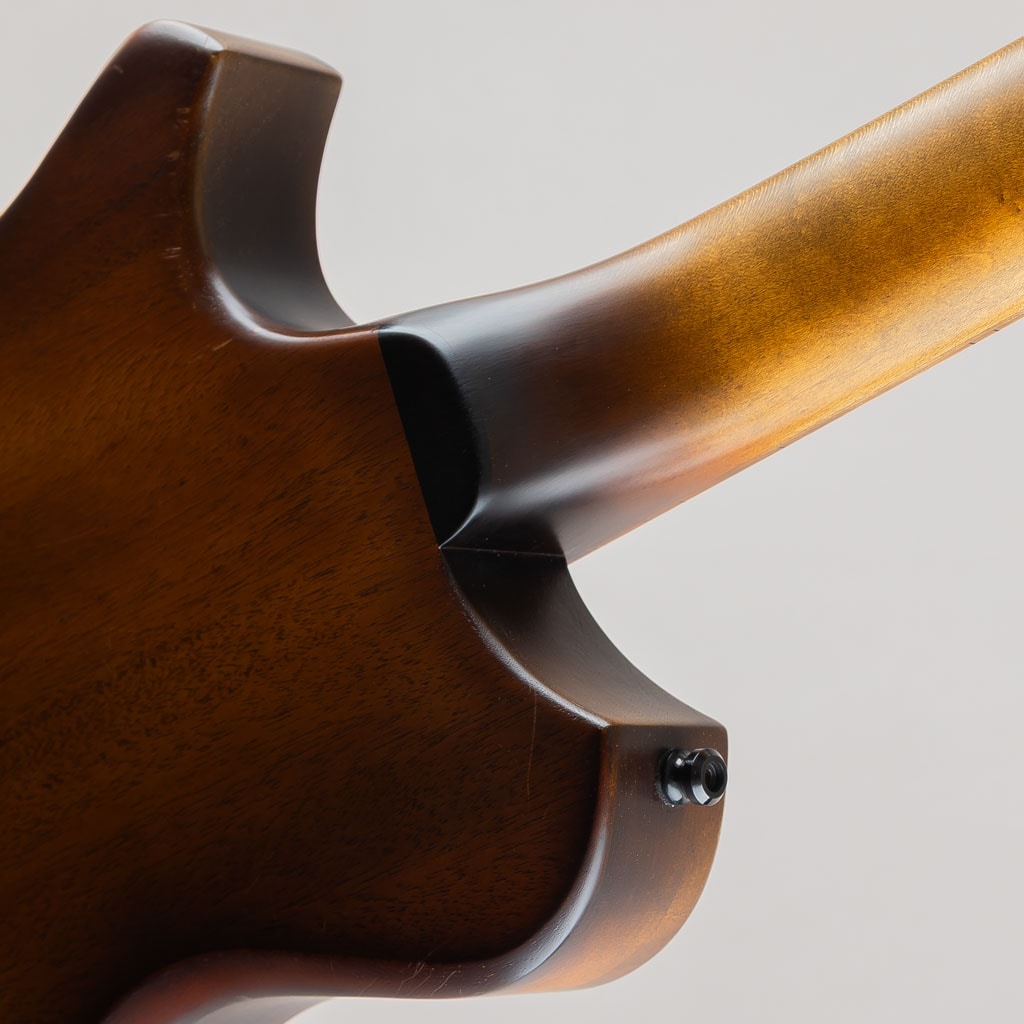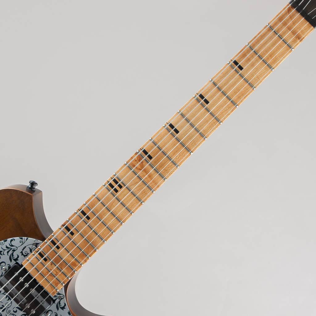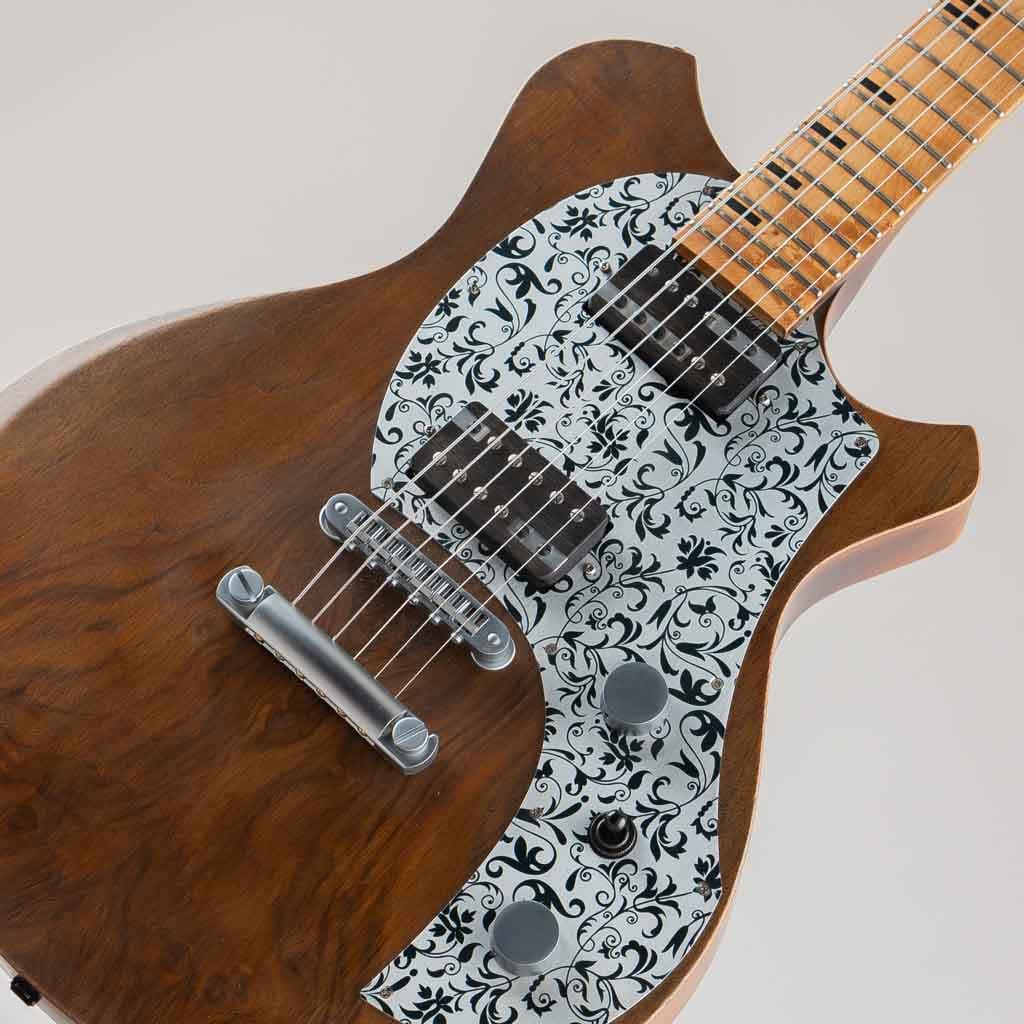 ブックマッチのヨーロピアンウォルナットをボディトップに配し、ボディバックにはチェンバー加工が施されたマホガニー、ネックは貼りメイプル仕様のメイプルネックが採用されております。
