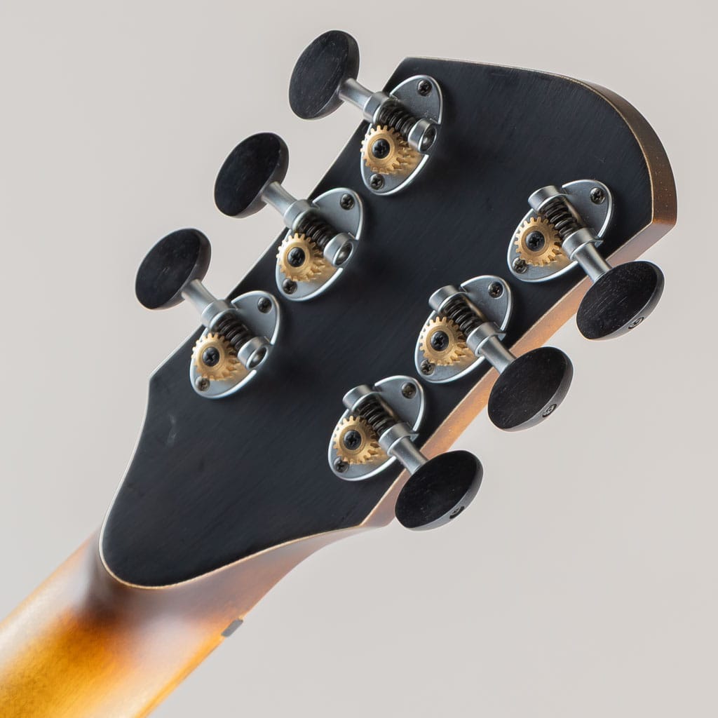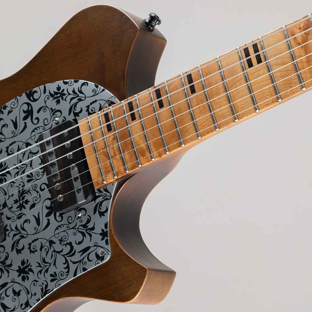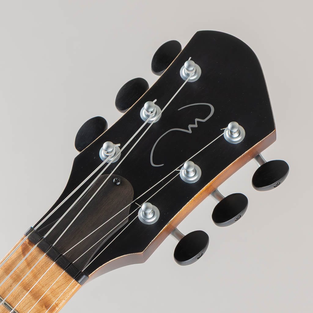 アルミ素材で製作されたオリジナルデザインのピックガードや、エボニー材が使用されたポジションマーク等、ルックスもさることながら、絶妙なシェイピングが施されたネックは長年弾き込まれたギターの様な手触りを感じさせる、サテンオープンポア塗装と相まり非常に高いプレイヤビリティを誇ります。