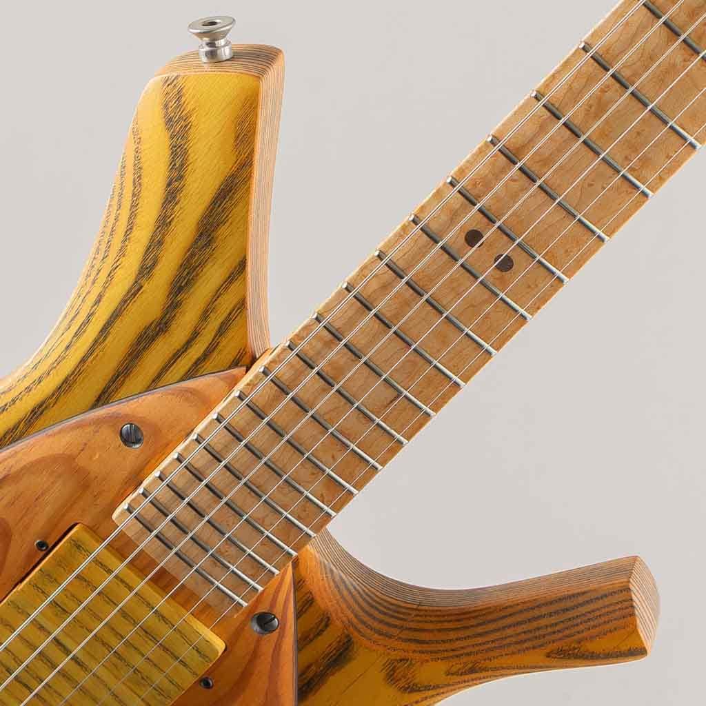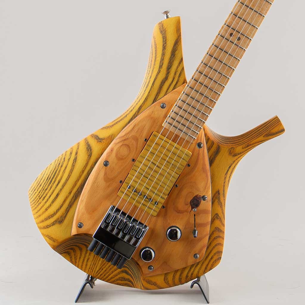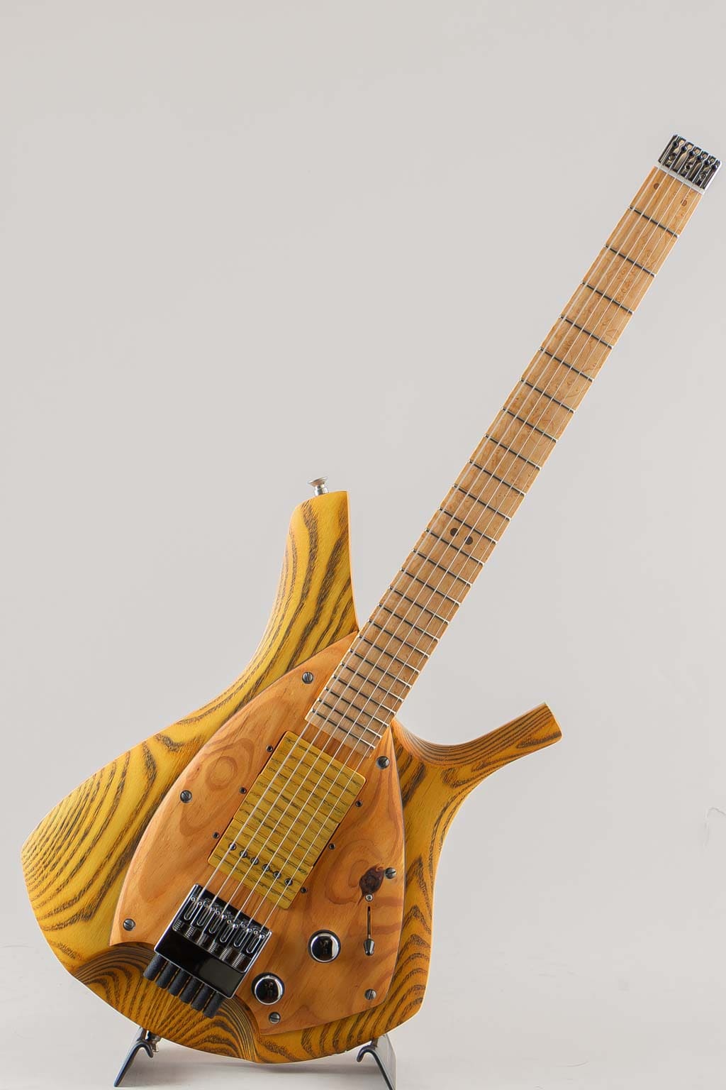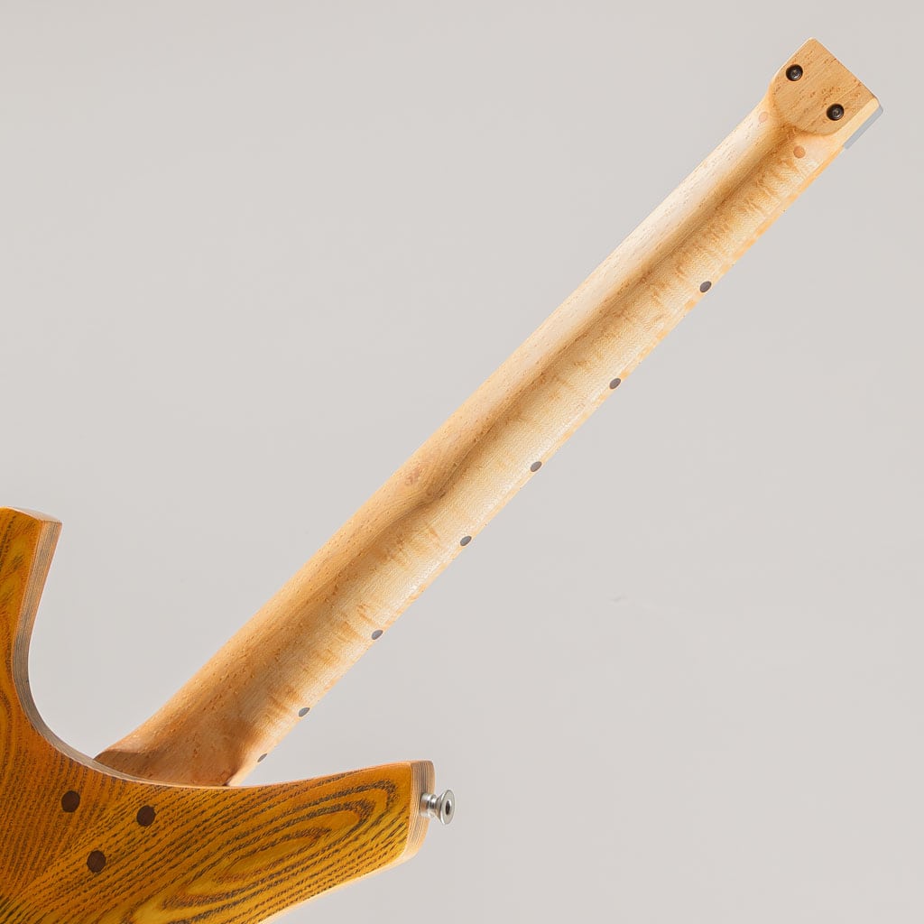 今回入庫の個体は氏のセンスが遺憾無く発揮された一本で、イエロー系カラーにてステイン仕上げが施された木目とのコントラストが美しいアッシュボディに、ロングスケール/ヘッドレス仕様のバーズアイネック・バーズアイフィンガーボードの材構成。