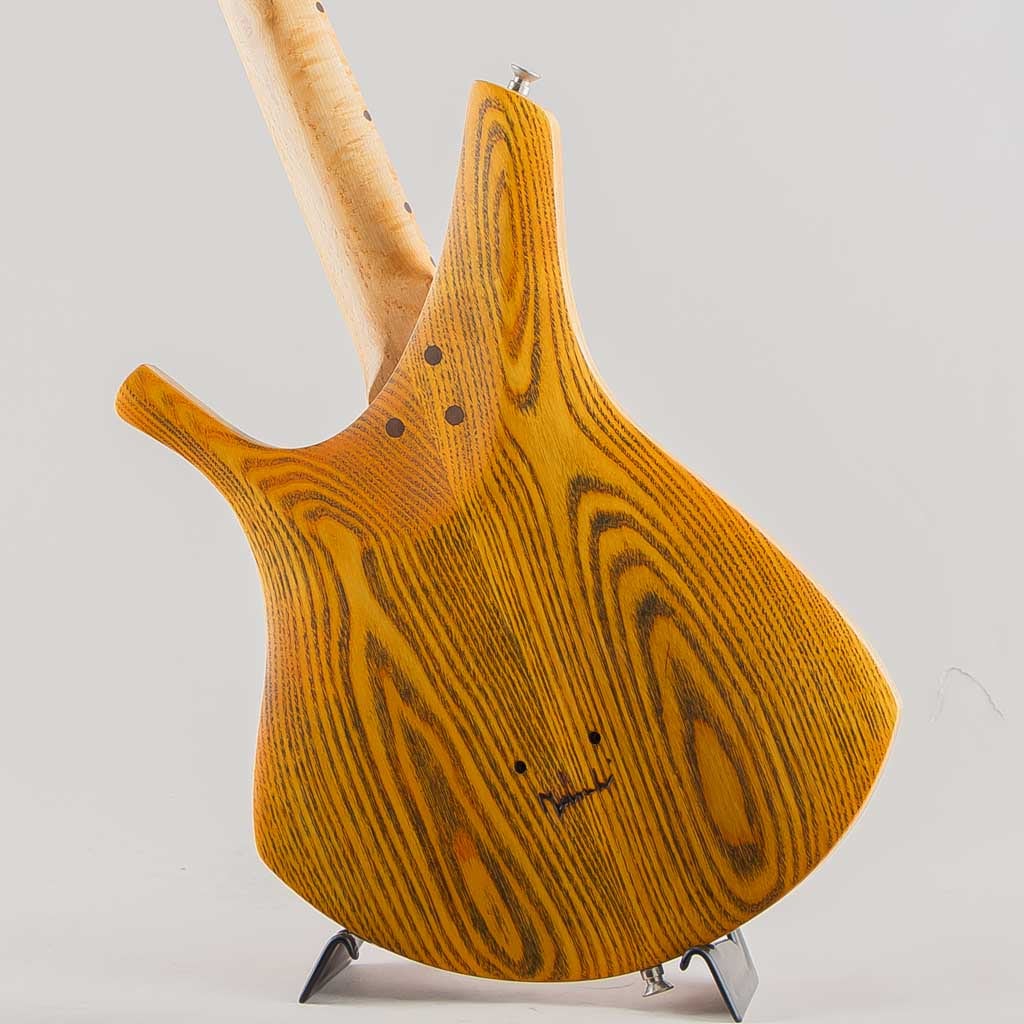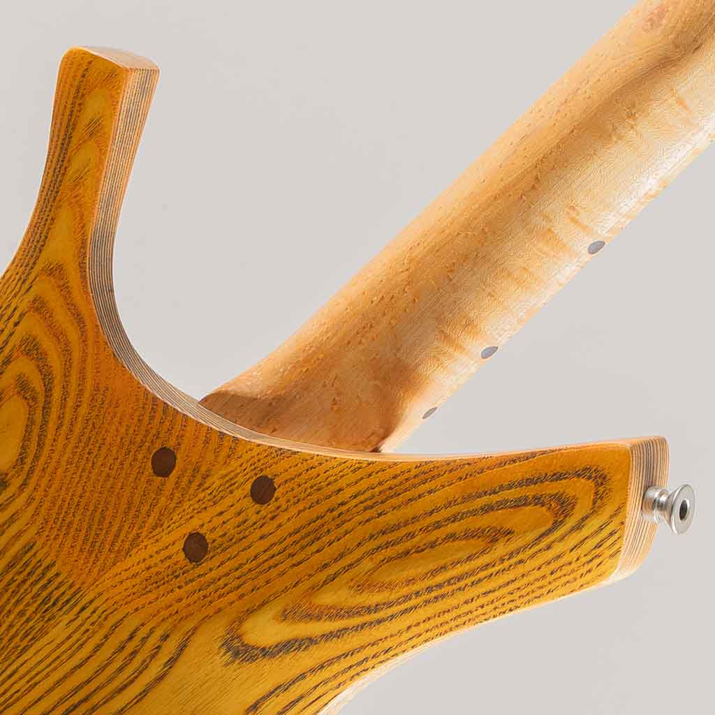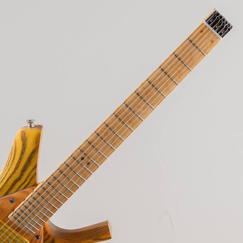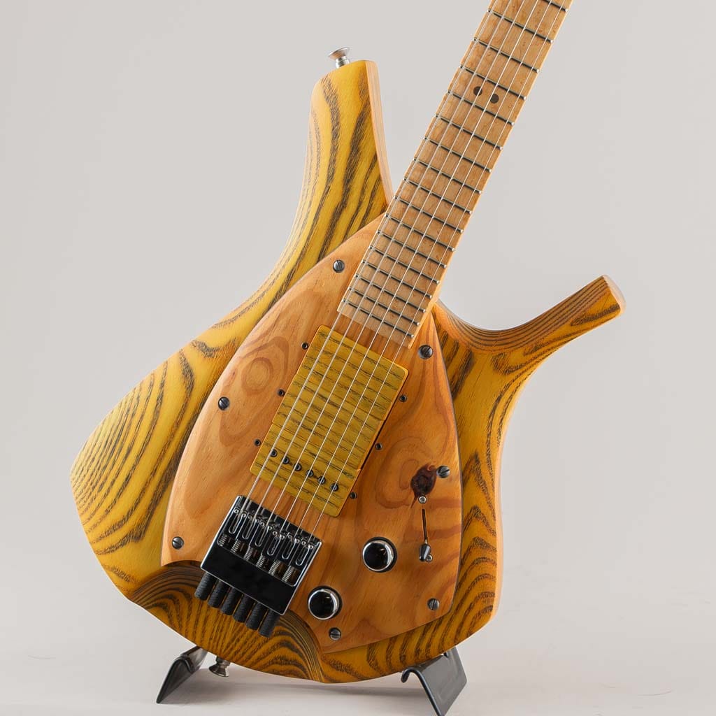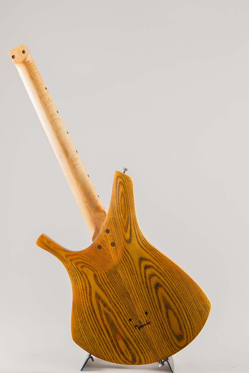 今回入庫の個体は氏のセンスが遺憾無く発揮された一本で、イエロー系カラーにてステイン仕上げが施された木目とのコントラストが美しいアッシュボディに、ロングスケール/ヘッドレス仕様のバーズアイネック・バーズアイフィンガーボードの材構成。