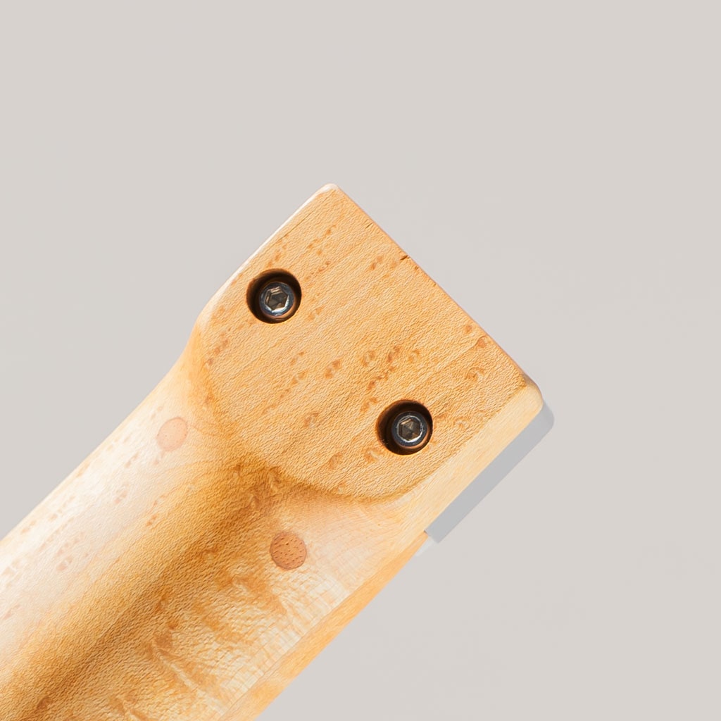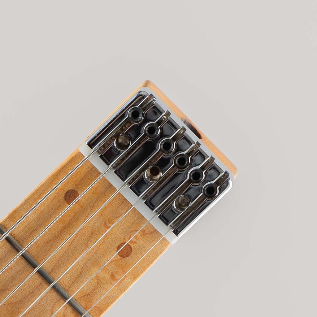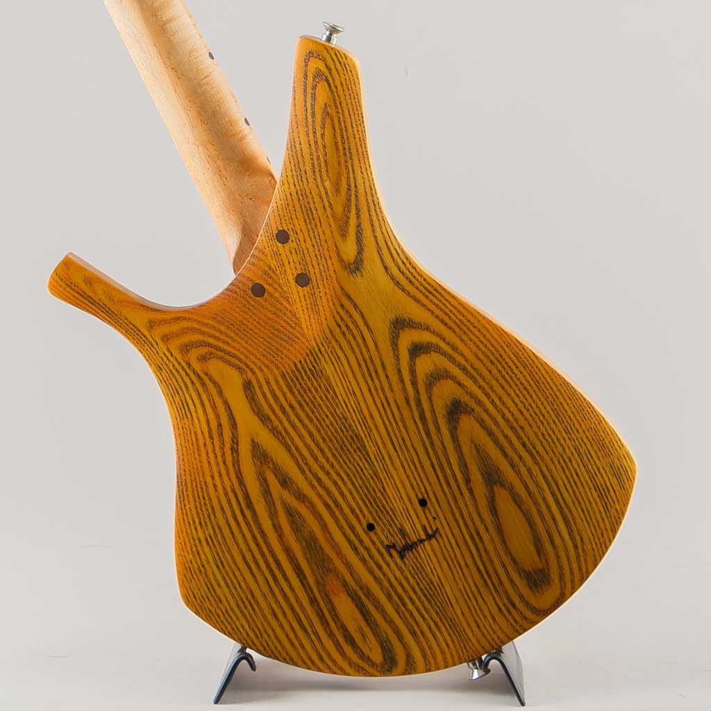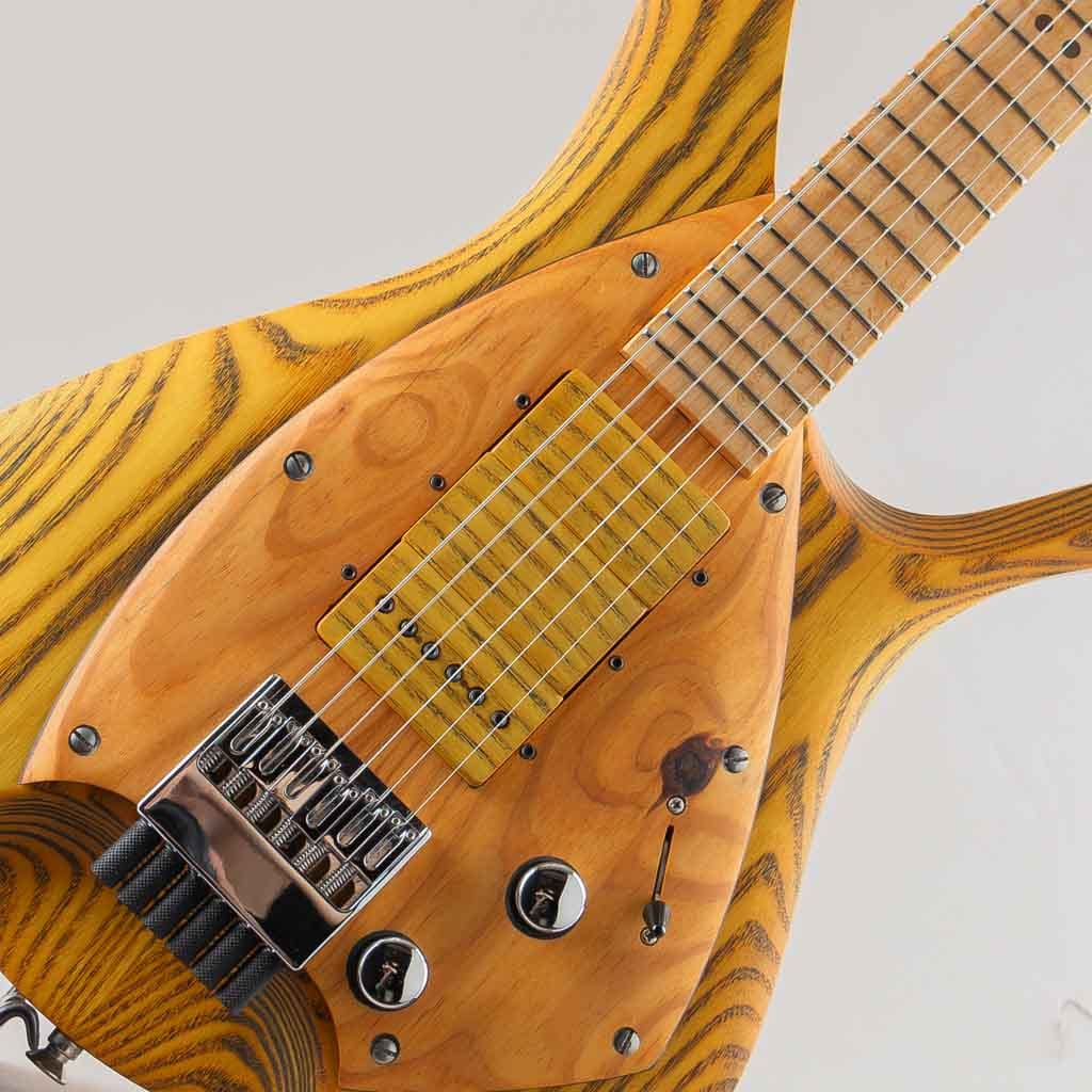 今回入庫の個体は氏のセンスが遺憾無く発揮された一本で、イエロー系カラーにてステイン仕上げが施された木目とのコントラストが美しいアッシュボディに、ロングスケール/ヘッドレス仕様のバーズアイネック・バーズアイフィンガーボードの材構成。