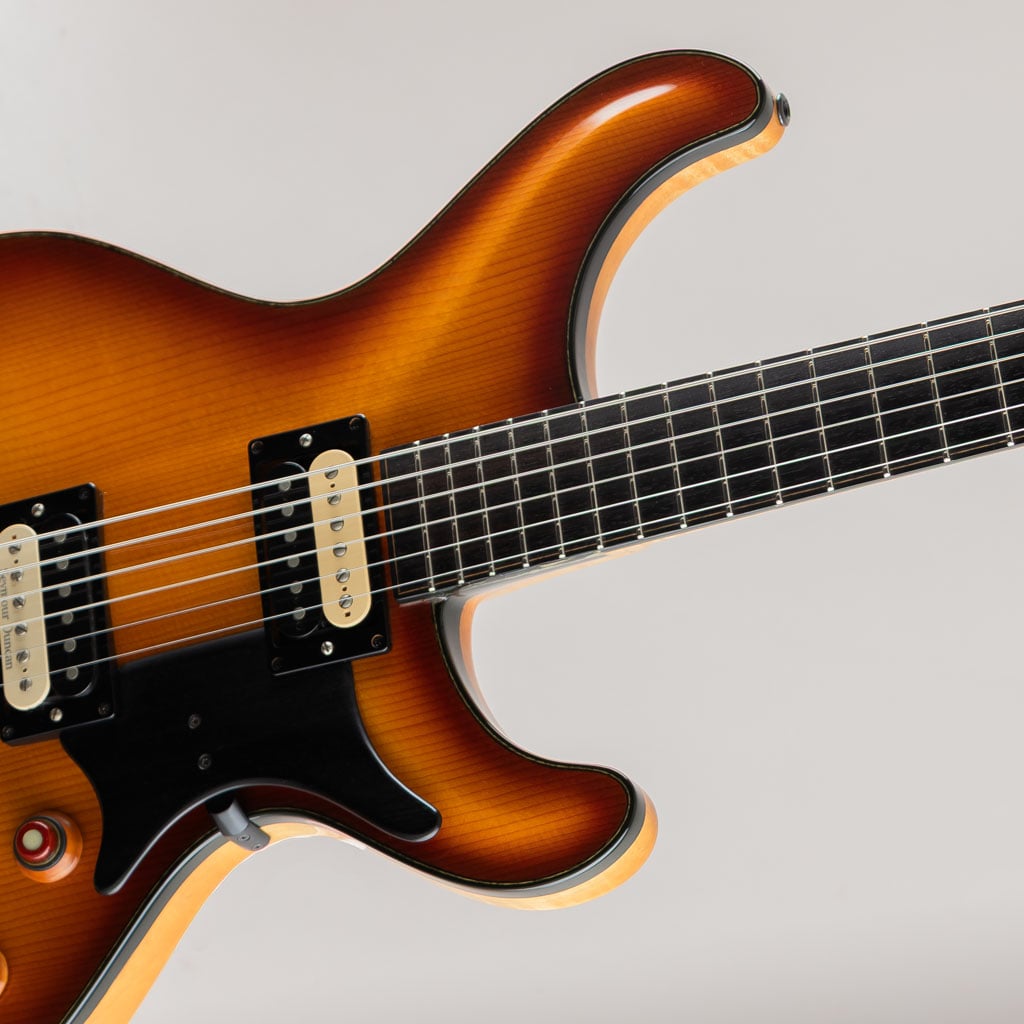 ウッドマテリアルはスプルーストップ、メイプルバックの珍しいコンビネーション。ネック部はメイプルネック、エボニーフィンガーボードの材構成。