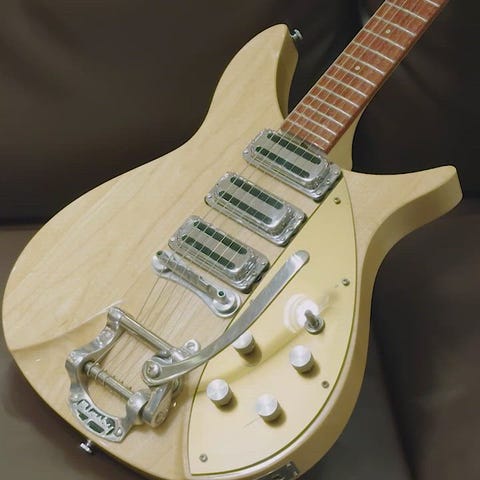 本モデルのルーツ"Capri325"は1958年に登場。20-3/4インチ(約527mm)のショートスケールネックに小ぶりなセミホロウボディ、3つの"トースターピックアップ"と当初はカフマンビブラートユニットを装備した仕様。リッケンバッカーのラインナップの中でも一際個性を放ち発売当時はあまりセールス的に振るわなかったものの、初期ジョンレノンの活躍により一躍脚光を集めることとなった銘モデル。本器Vintageシリーズ"325V59"は1984年に登場。Bigsbyユニットを搭載しアイコニックなジョン使用ギターをトリビュート、リイシュー的位置づけで販売がされました。こちらはシリアルより1994年製の個体。コンパクトなボディサイズに短いスケールの組み合わせは抜群に取り回しに優れたデザイン。3Wayスイッチによるピックアップセレクトはフロント/センターミックス、フロント/センター/リアミックス、リアの切り替え。2Vol,2Tone。軽快に弾ける乾いたアタックにメイプルホロウによるエアー感。リッケンならではのパリっとして煌びやかなコードトーンは粒立ちが心地よく、ショートスケール故のサスティーンの緩さもまた独特の歯切れある響きとなって雰囲気抜群です。