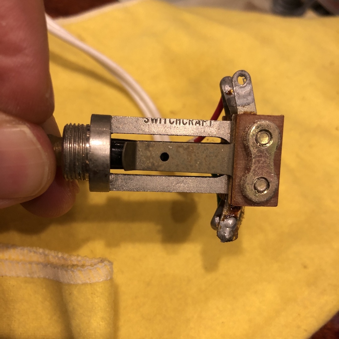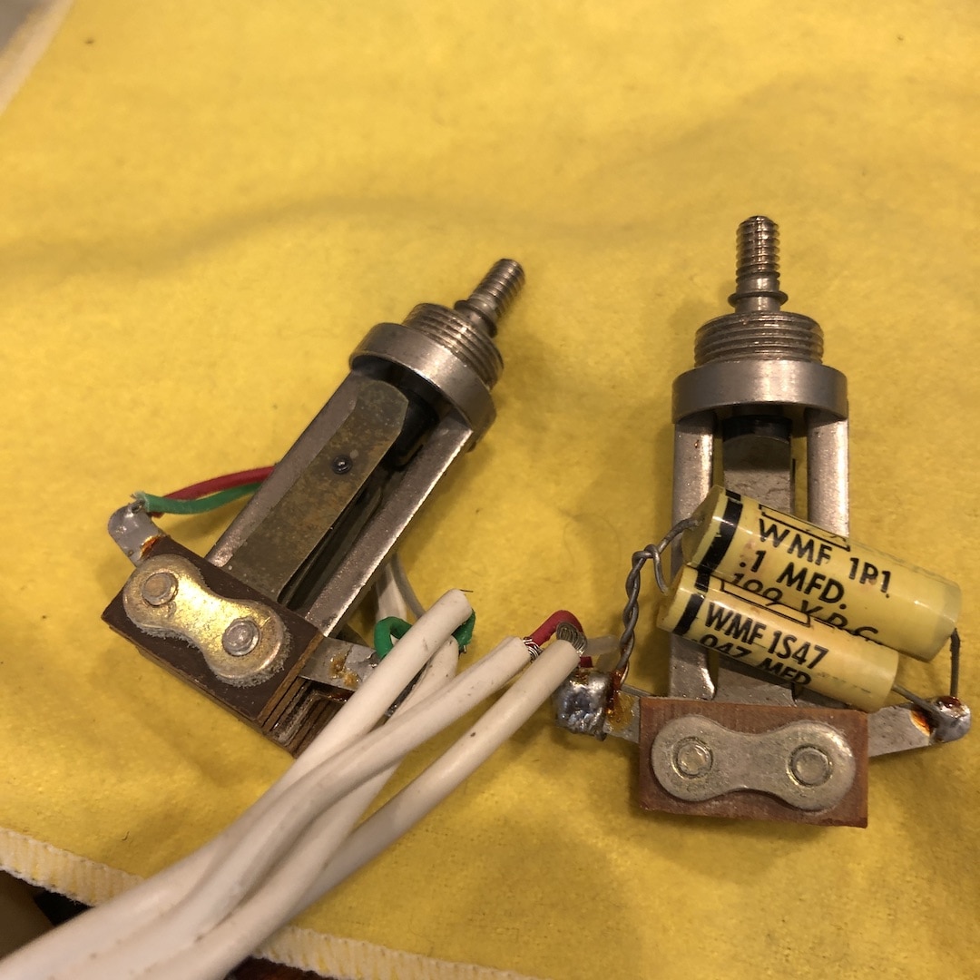 その他ペグ(現在はWaverlyが搭載されております)や0フレットの交換、1フレット低音弦側指板面のダメージ、リアピックアップ部木部スペーサー欠品(現在は革製のスペーサーが用いられております)や一部オーバースプレー等はございますが使用に際し問題ございません。