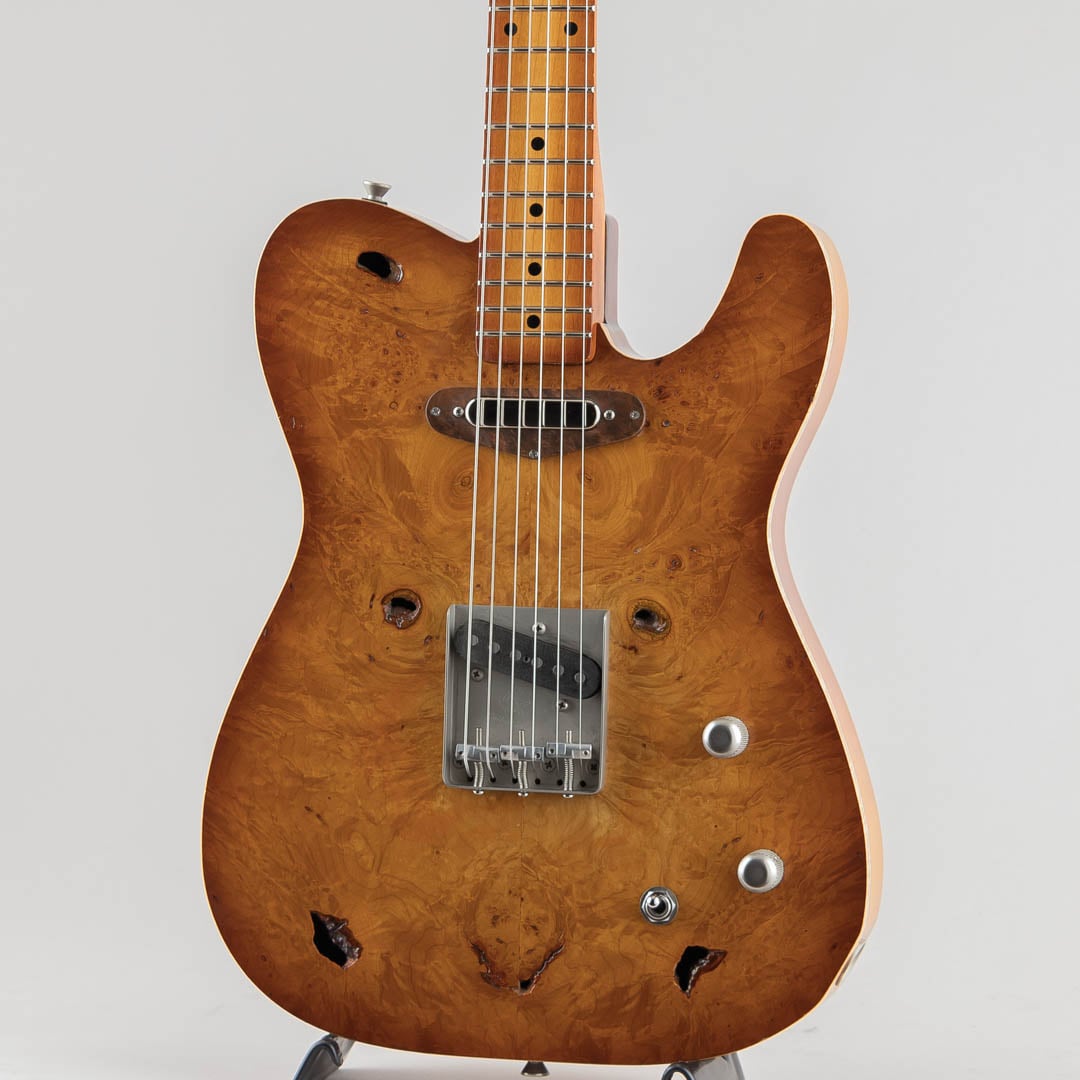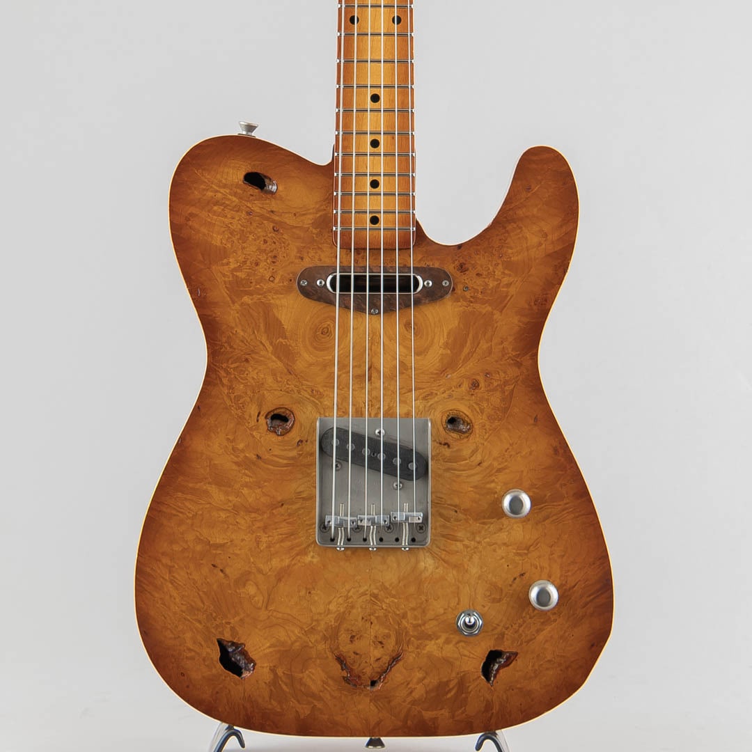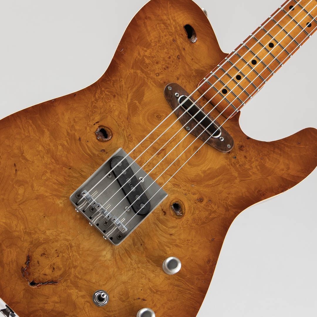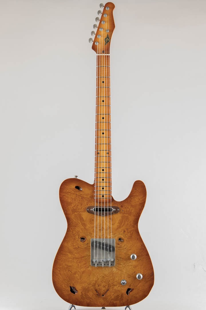 Tele Style をベースに独自のアレンジが施され、ホロー構造のマホガニーバックにワイルドな杢目が特徴的なバールメイプルをトップに配し、節穴はサウンドホールの役割を担い自然の作り出す造形美を上手くデザインに落とし込んでおります。