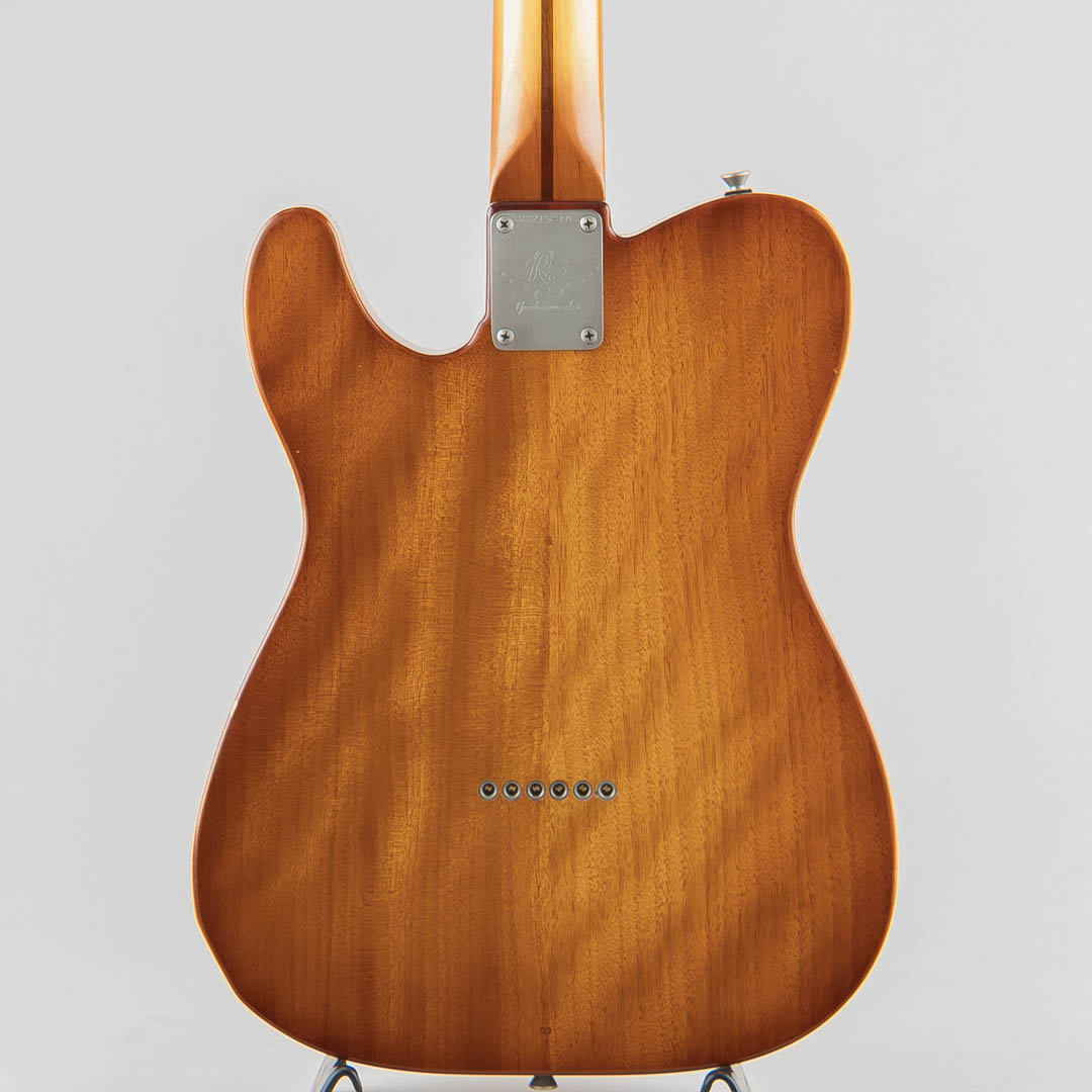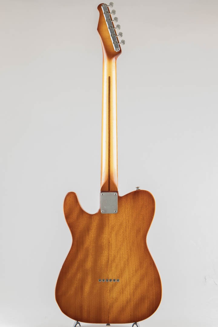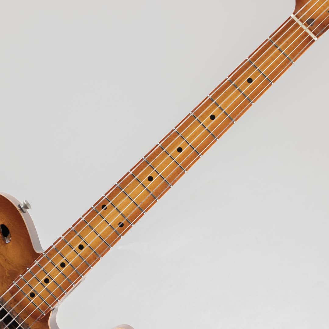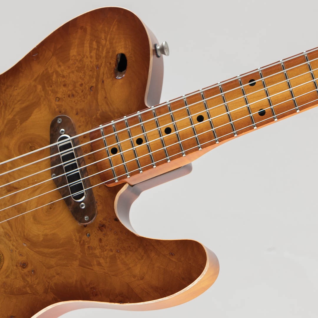 Tele Style をベースに独自のアレンジが施され、ホロー構造のマホガニーバックにワイルドな杢目が特徴的なバールメイプルをトップに配し、節穴はサウンドホールの役割を担い自然の作り出す造形美を上手くデザインに落とし込んでおります。
