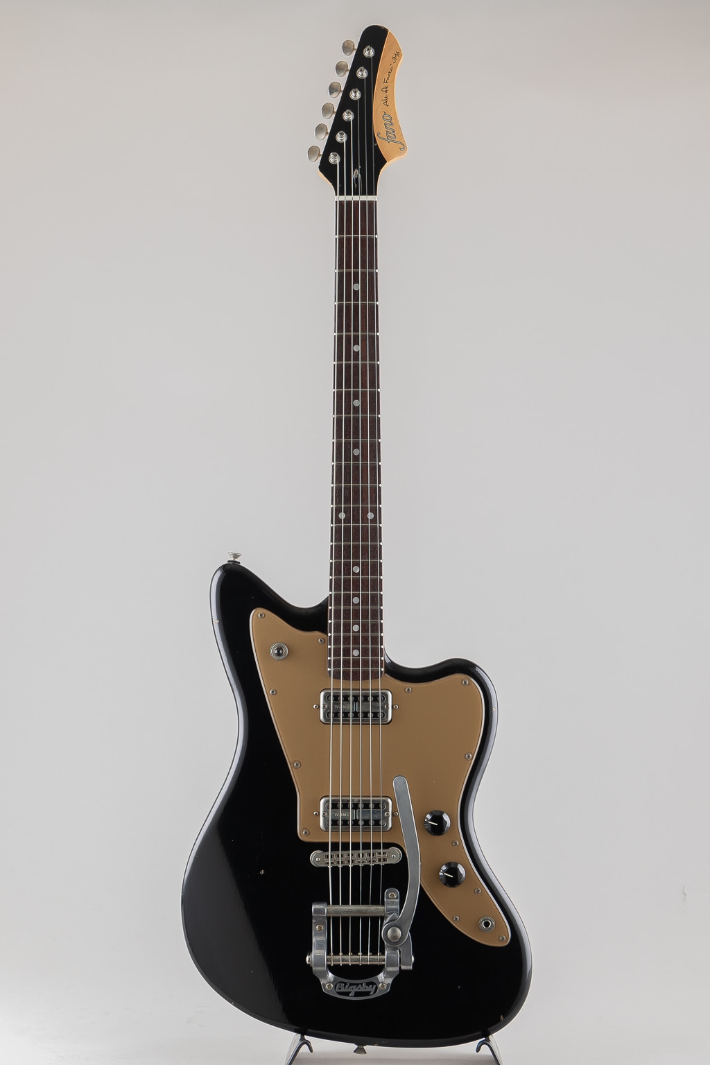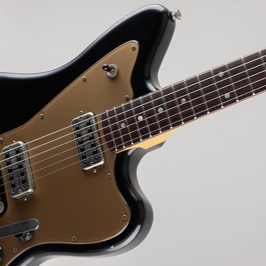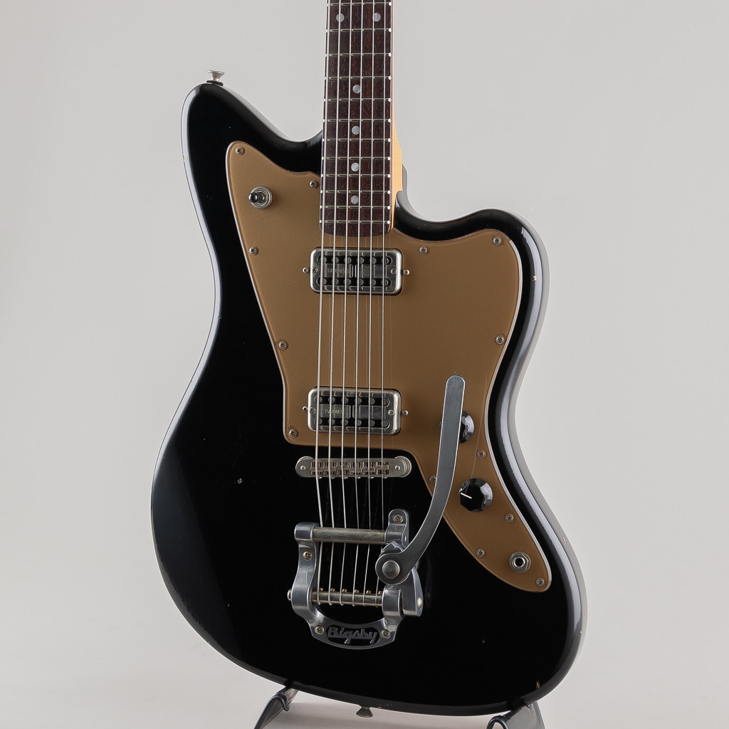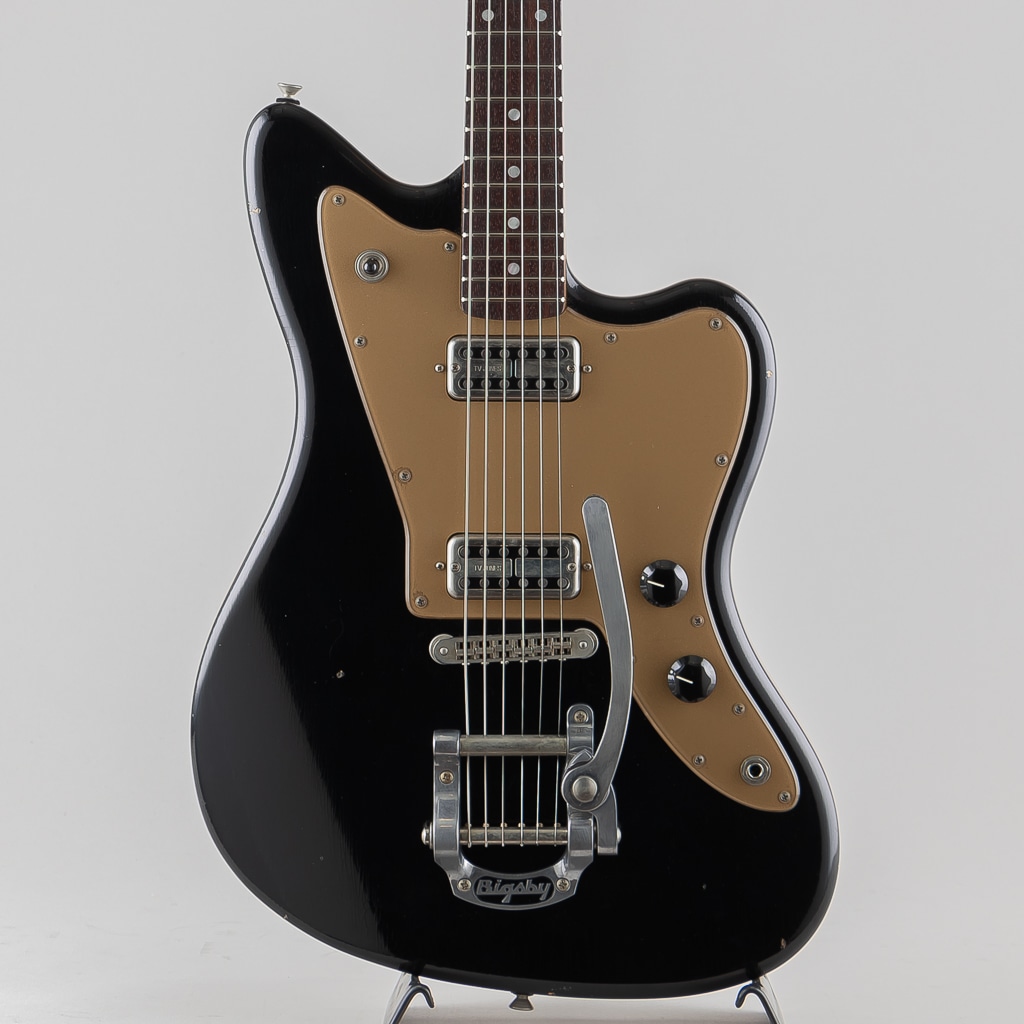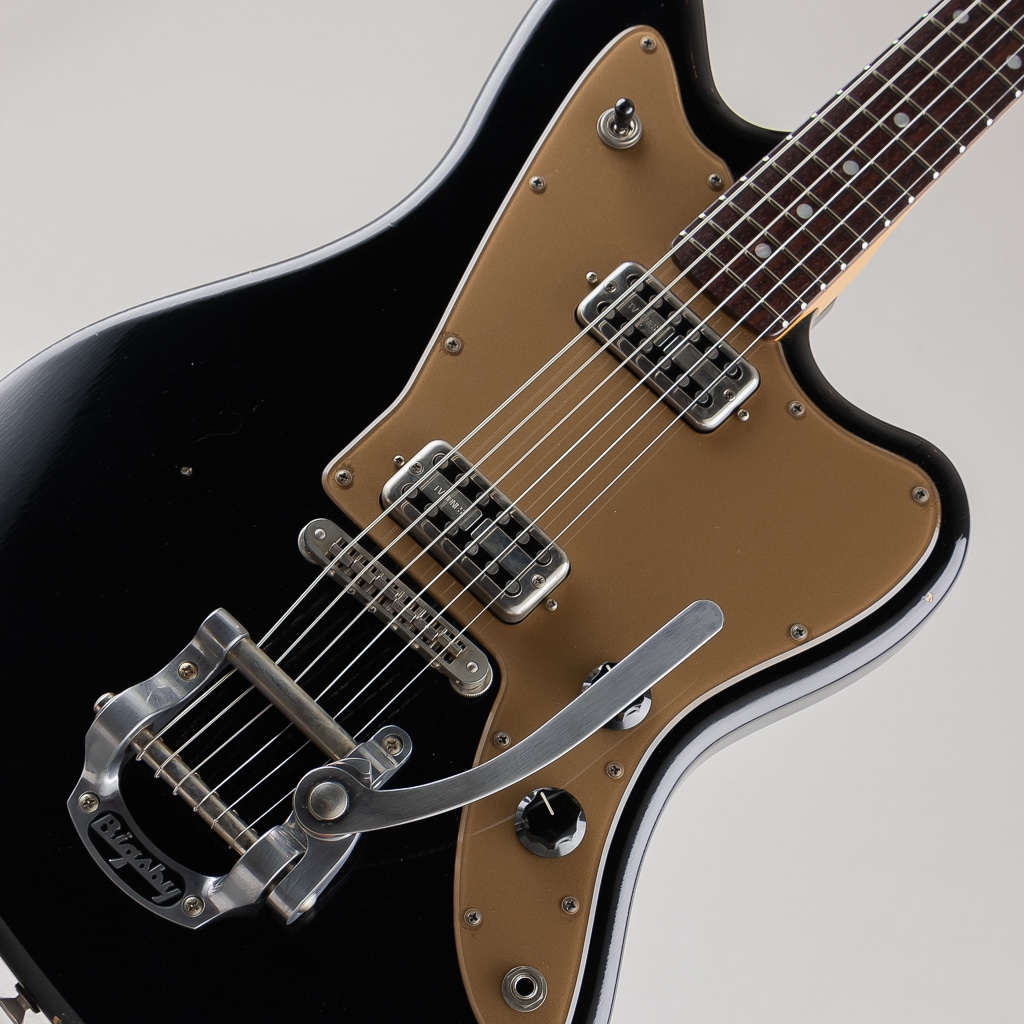"Light Distress" 加工の施された "Bull Black" カラーを纏うボディに "Gold Plexi" ピックガードがよくマッチしており、テイルピースには "Bigsby" を採用しルックス/サウンド共に良いアクセントとなっております。